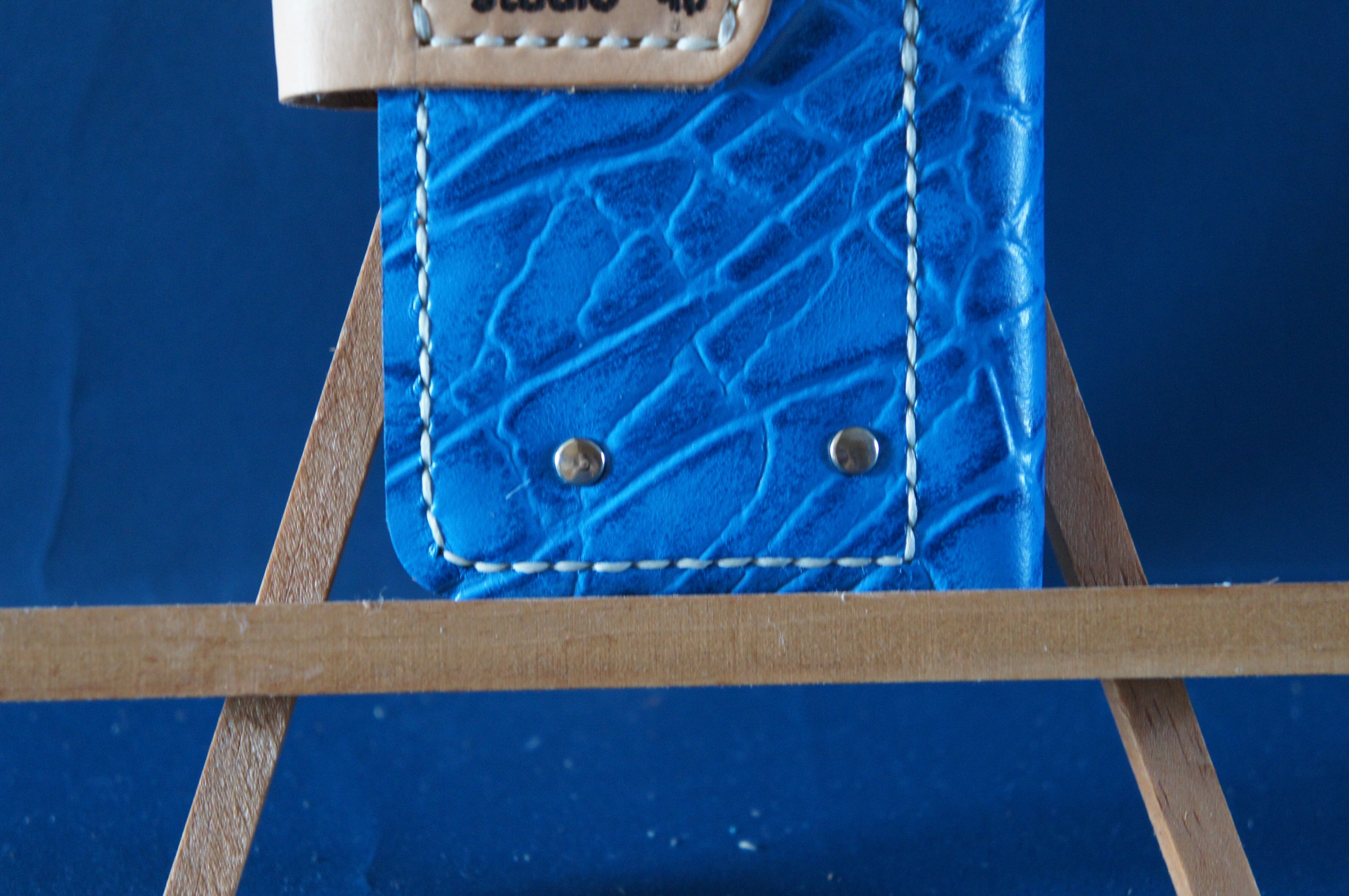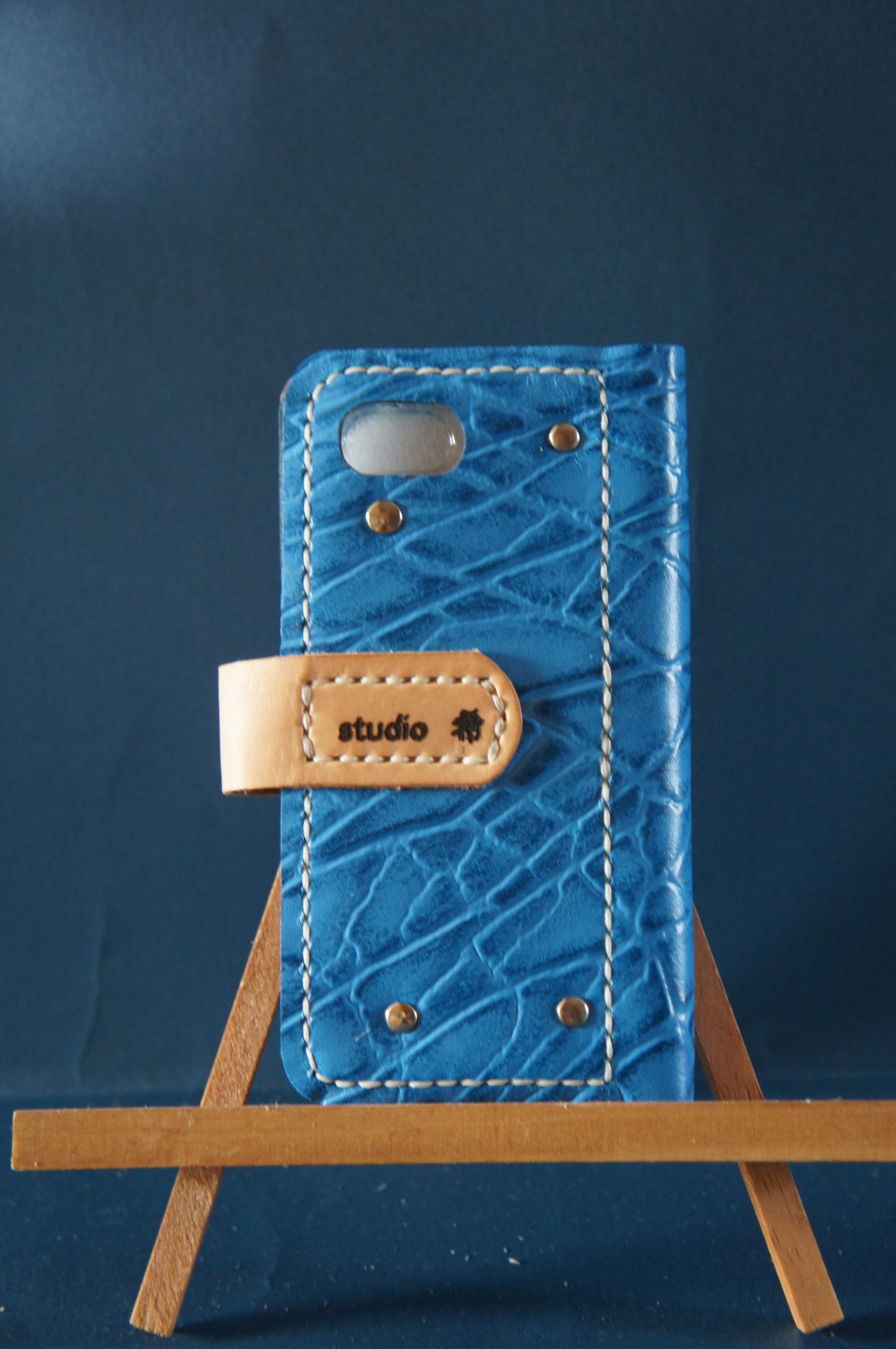 一点物です。iPhoneSE/ iPhone7/ iPhone8用の手帳型スマートフォンケースです。本体、内側、カードホルダー、ホルダー裏の合計4枚の革を縫い合わせています。太さ1番の白色の糸ですべて手縫いで仕上げています。2本の針で縫っていますので、ほつれにくい構造になっています。本体は1.5mmの厚さの蛇型押しの青色の牛革です。内側には厚さ0.8mmの水牛の革を使っています。カードホルダーが1つあります。カードホルダー部分の裏には収納スペースがあります。スマートフォンを固定する部分は、カシメ金具4個で固定してあります。バネホック、金具の色はシルバーです。カメラ穴部分を固くするためには皮革硬化剤を使用しています。貼り付け部分はつるつるに磨いています。