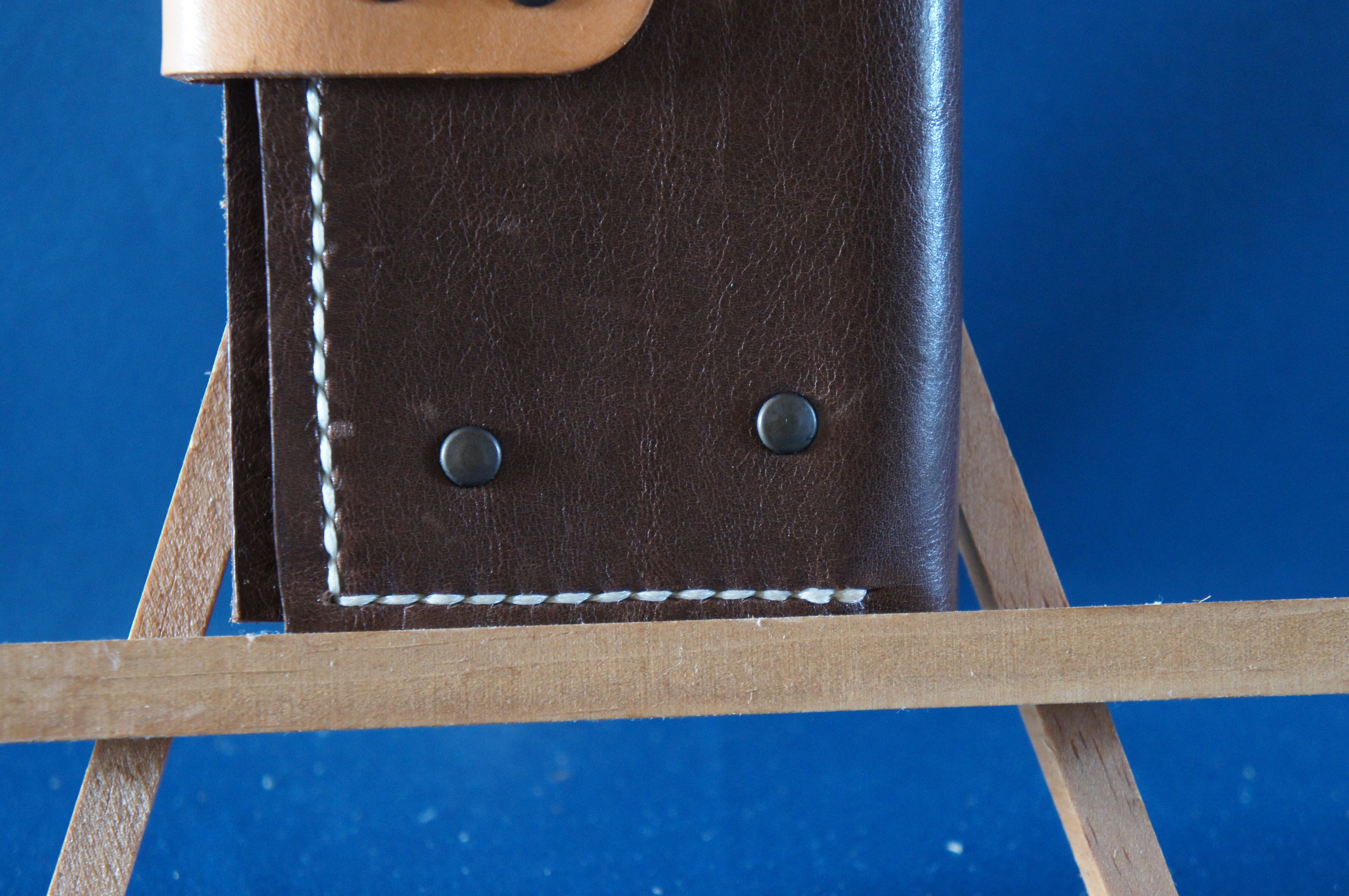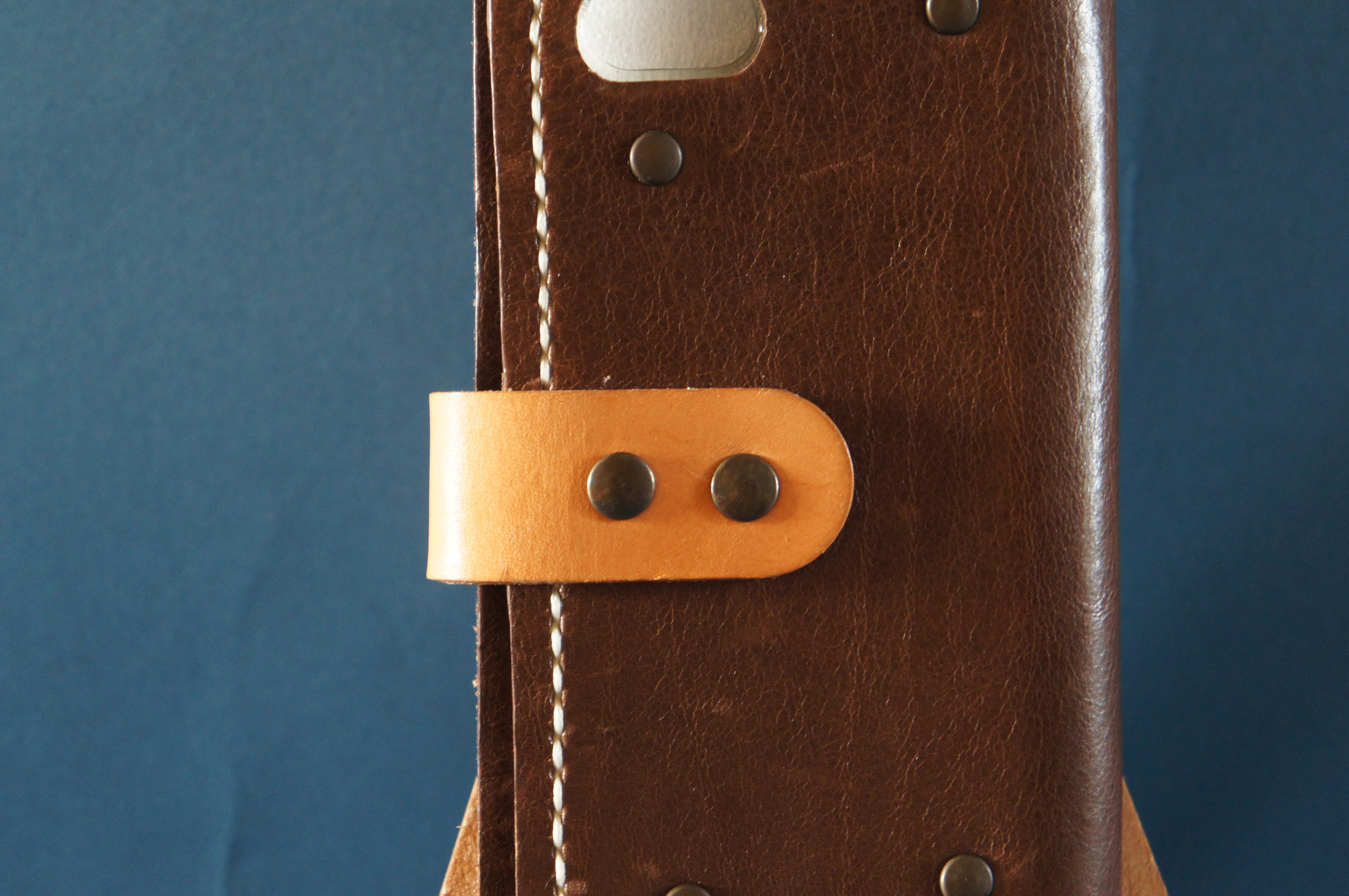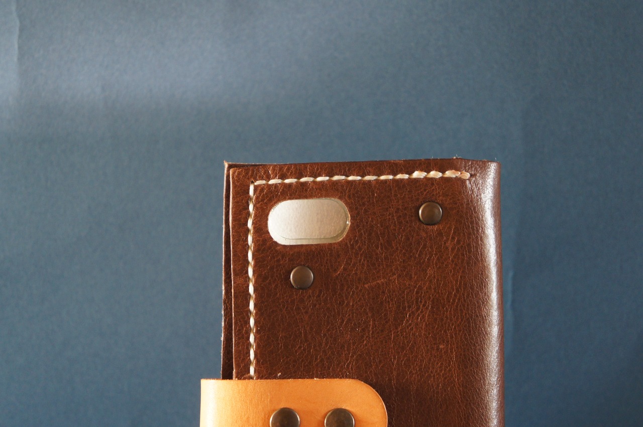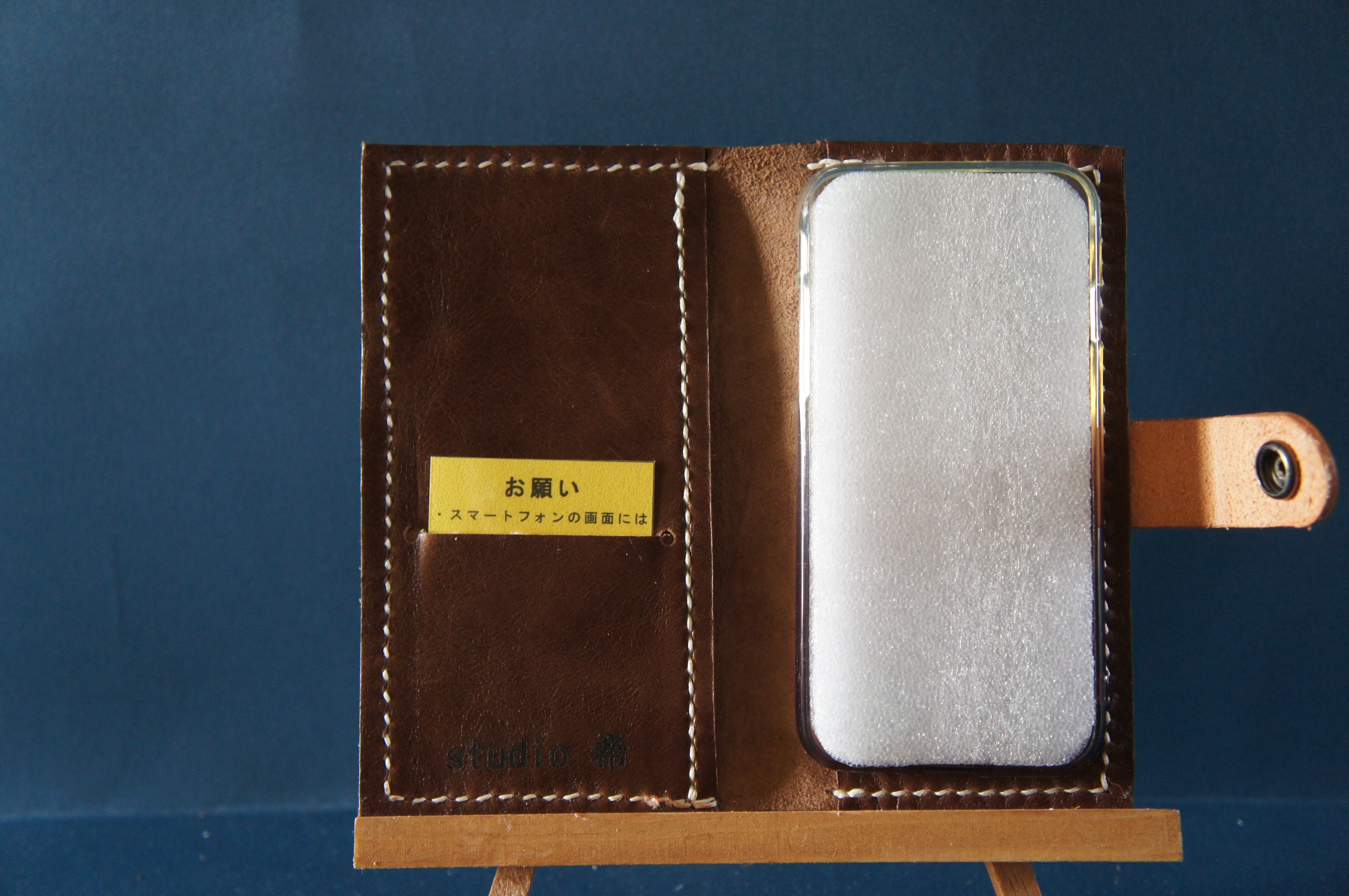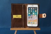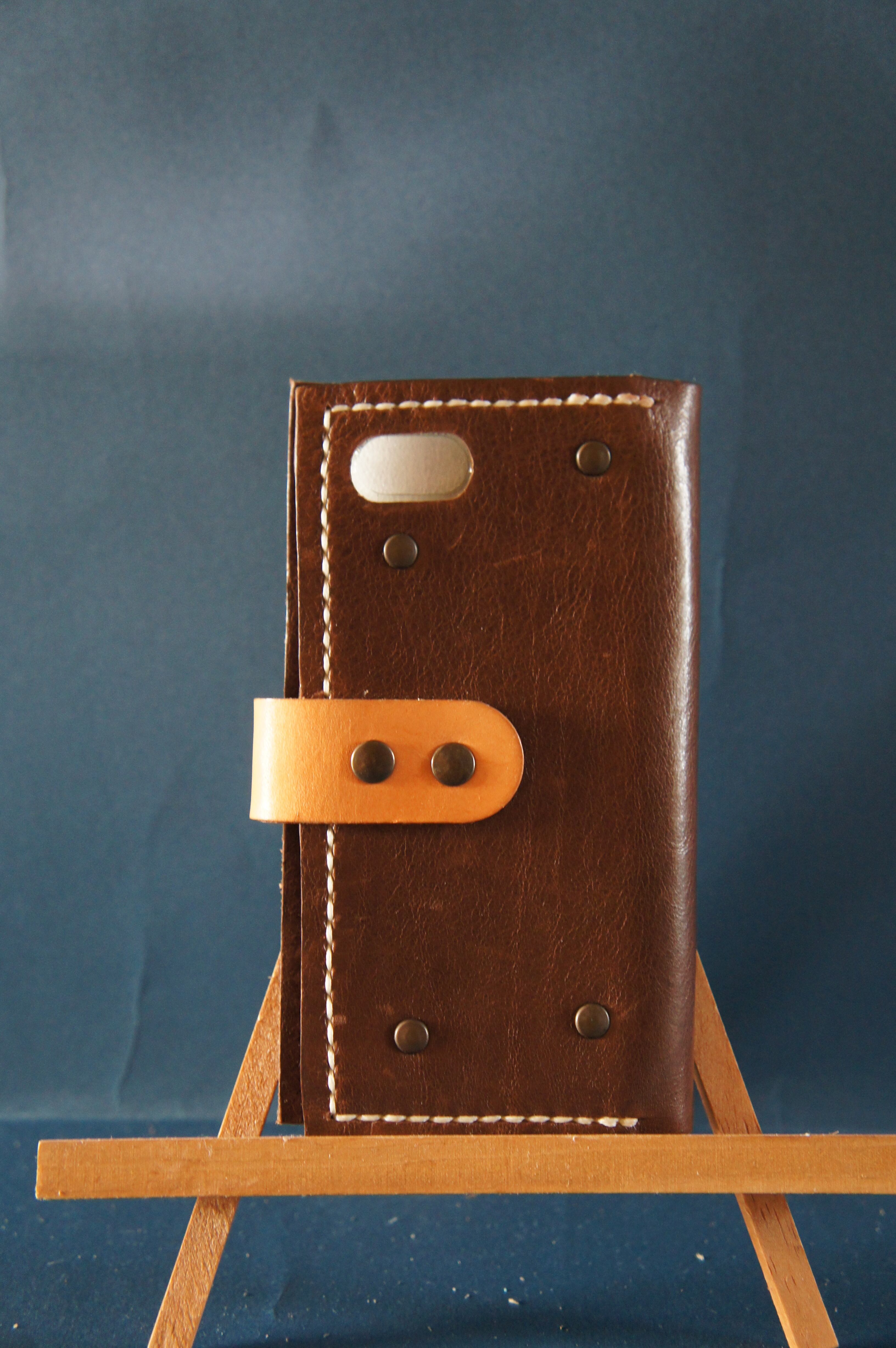 一点物です。iPhoneSE/ iPhone7/ iPhone8用の手帳型スマートフォンケースです。本体、内側、カードホルダー、ホルダー裏の合計4枚の革を縫い合わせています。太さ1番の白色の糸ですべて手縫いで仕上げています。2本の針で縫っていますので、ほつれにくい構造になっています。本体は1.5mmの厚さの茶色の牛革です。内側にも同じ革を使っています。カードホルダーが1つあります。カードホルダー部分の裏には収納スペースがあります。スマートフォンを固定する部分は、カシメ金具4個で固定してあります。バネホック、金具の色はブロンズです。カメラ穴部分を固くするためには皮革硬化剤を使用しています。貼り付け部分はつるつるに磨いています。
