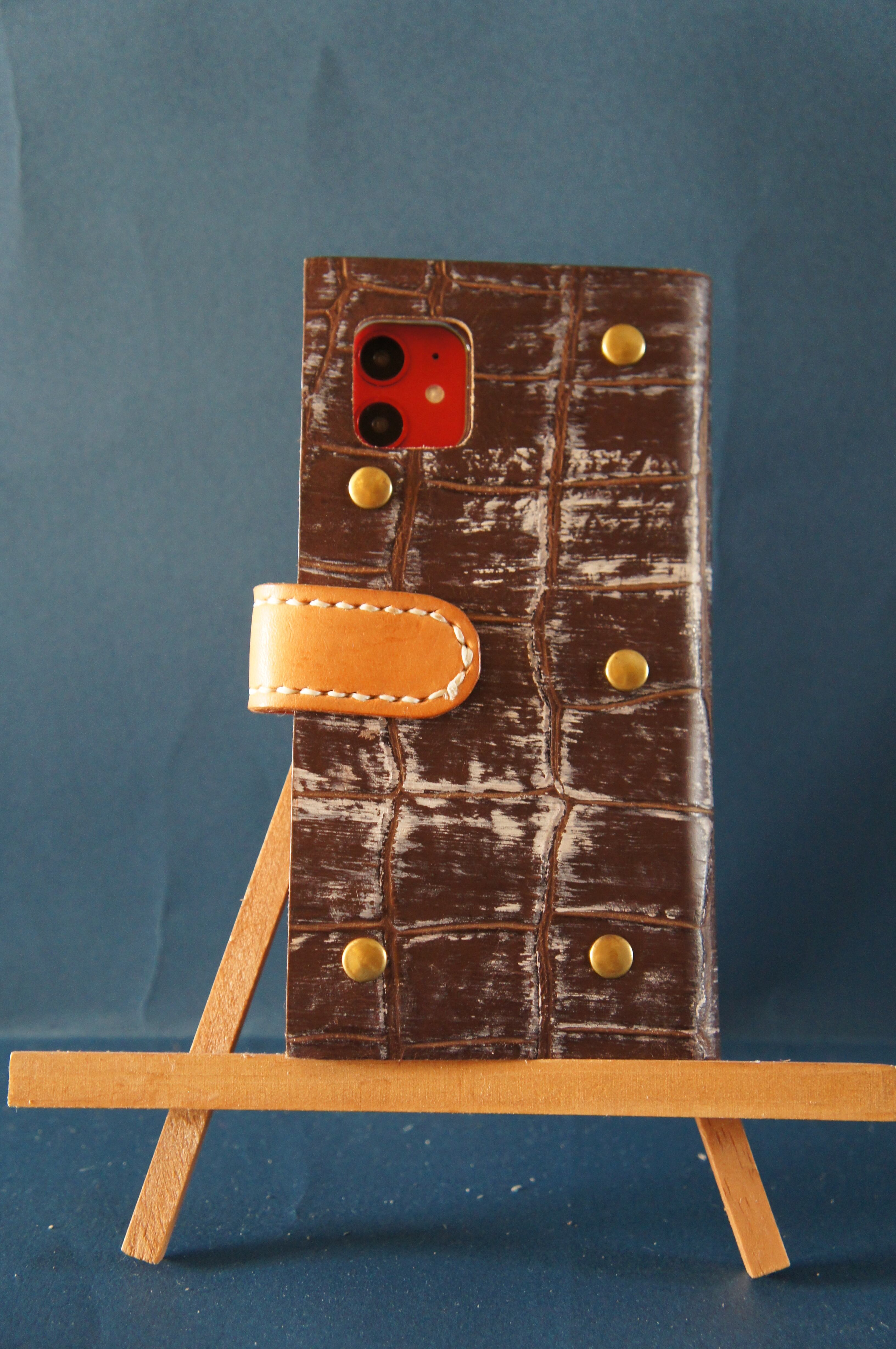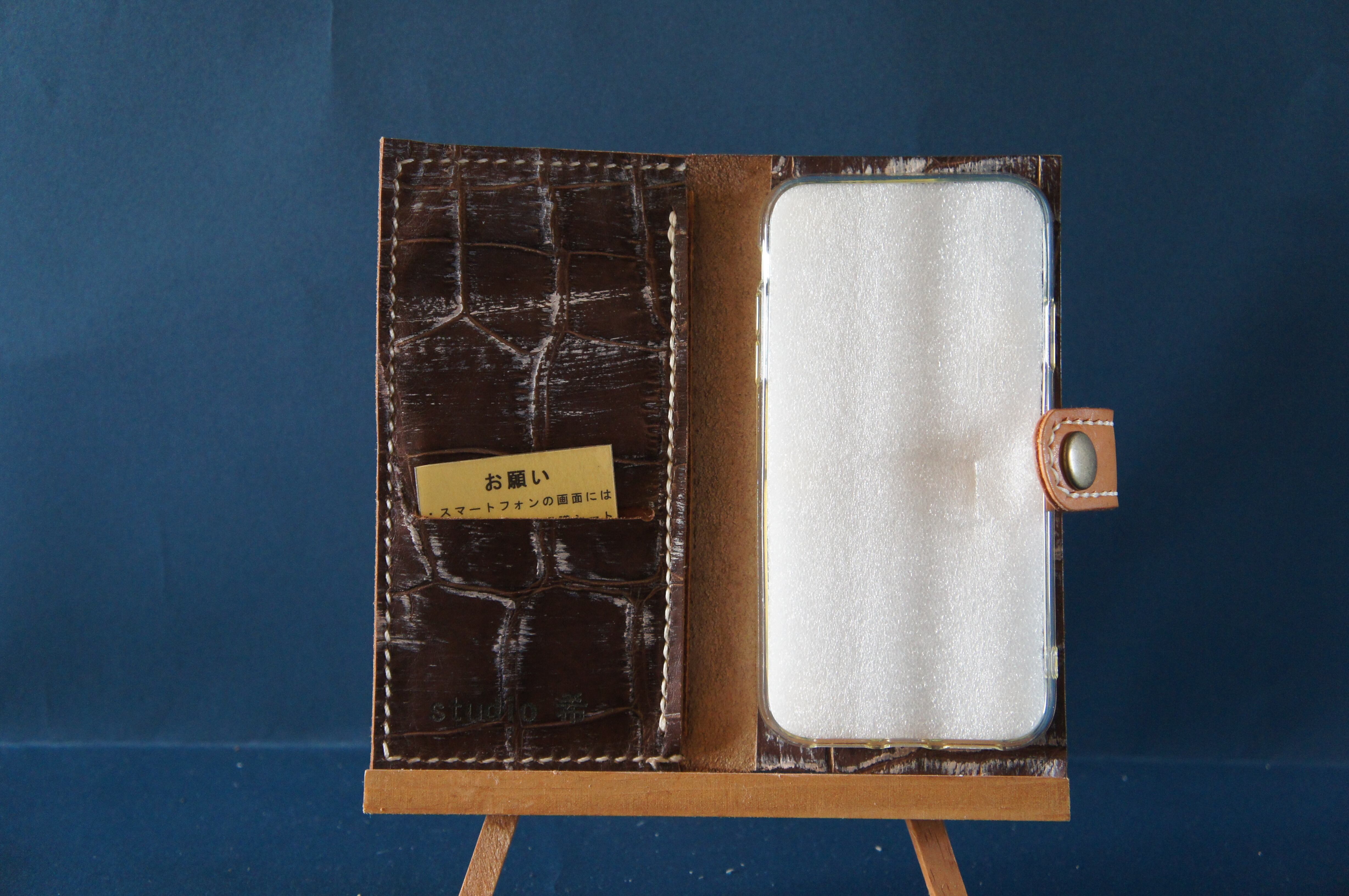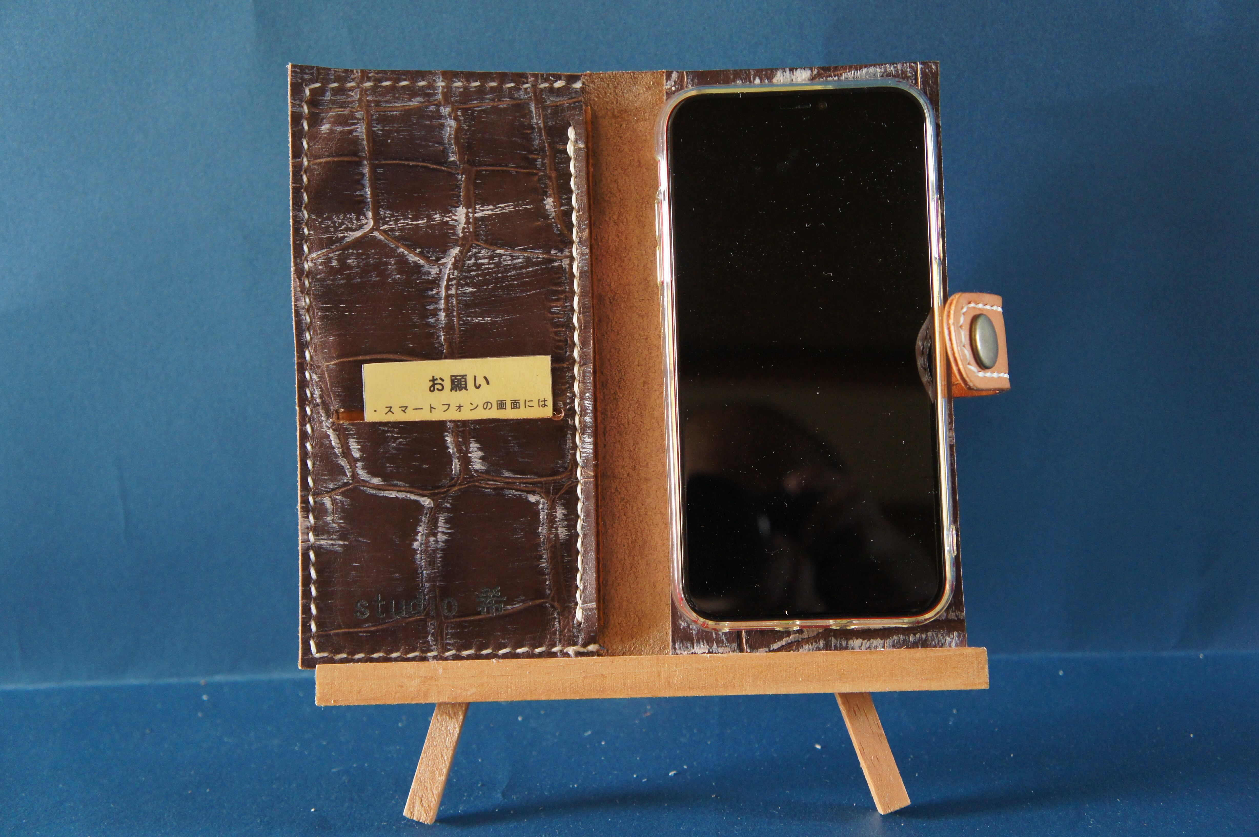 一点物です。iPhone11用の手帳型スマートフォンケースです。本体、内側、カードホルダー、ホルダー裏の合計4枚の革を縫い合わせています。太さ1番の白色の糸ですべて手縫いで仕上げています。2本の針で縫っていますので、ほつれにくい構造になっています。本体は1.5mmの厚さのアート系茶色の牛革です。内側には同じ革を使っています。カードホルダーが2つあります。カードホルダー部分の裏には収納スペースがあります。スマートフォンを固定する部分は、カシメ金具5個で固定してあります。バネホック、金具の色は金色です。カメラ穴部分を固くするためには皮革硬化剤を使用しています。貼り付け部分はつるつるになるまでトコフィニッシュなどを使って磨いています。