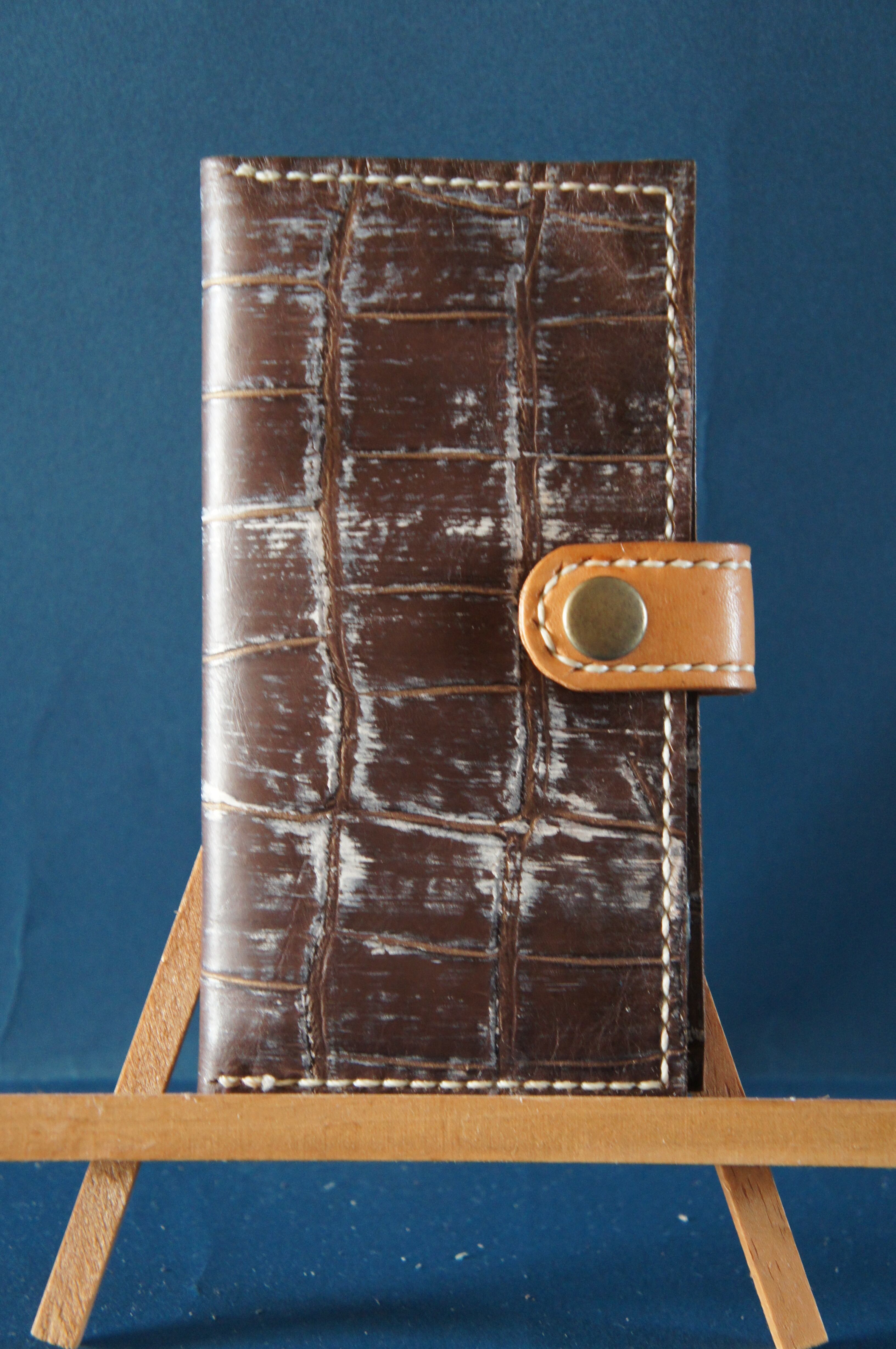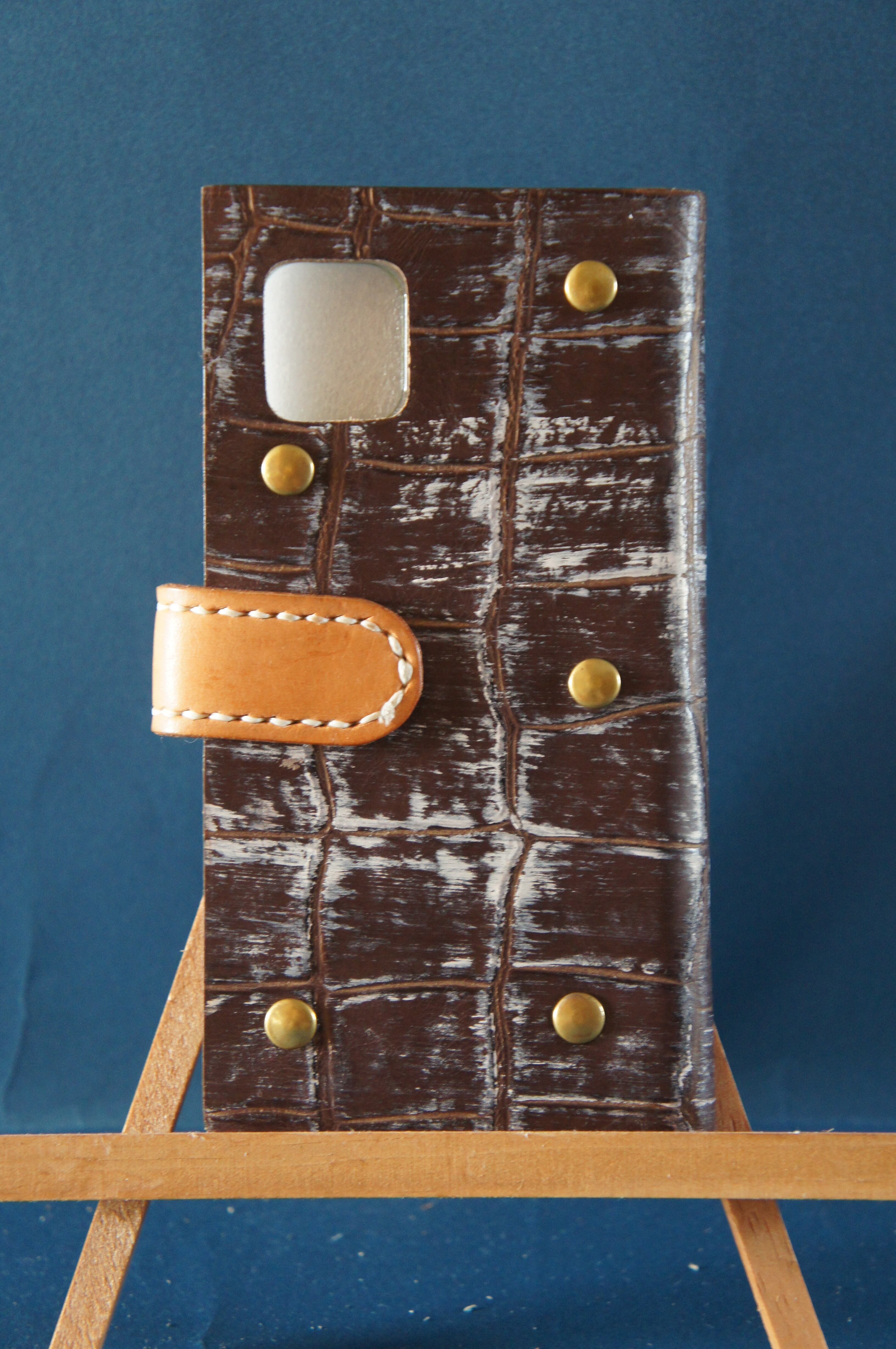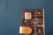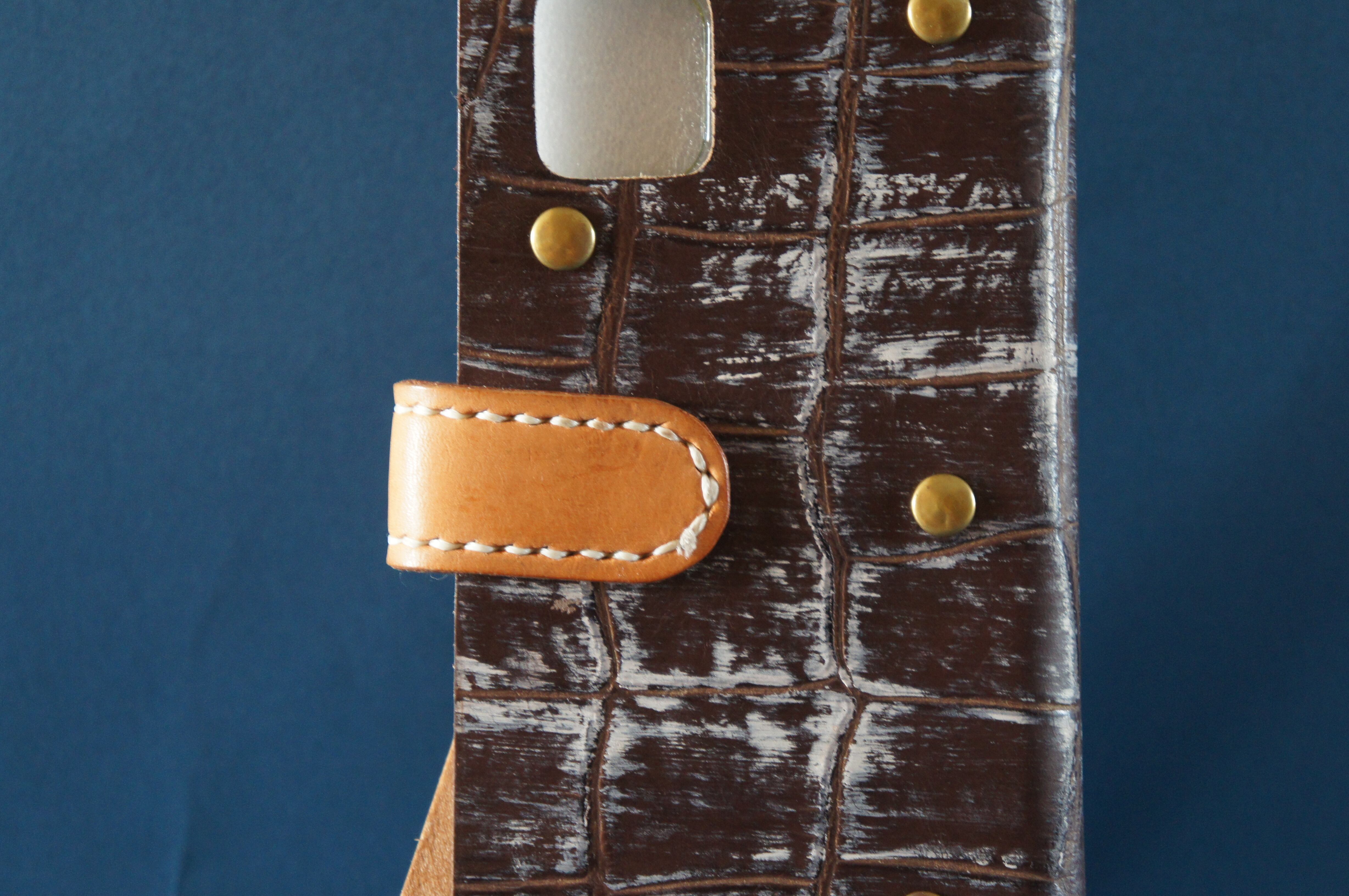 一点物です。iPhone11用の手帳型スマートフォンケースです。本体、内側、カードホルダー、ホルダー裏の合計4枚の革を縫い合わせています。太さ1番の白色の糸ですべて手縫いで仕上げています。2本の針で縫っていますので、ほつれにくい構造になっています。本体は1.5mmの厚さのアート系茶色の牛革です。内側には同じ革を使っています。カードホルダーが2つあります。カードホルダー部分の裏には収納スペースがあります。スマートフォンを固定する部分は、カシメ金具5個で固定してあります。バネホック、金具の色は金色です。カメラ穴部分を固くするためには皮革硬化剤を使用しています。貼り付け部分はつるつるになるまでトコフィニッシュなどを使って磨いています。