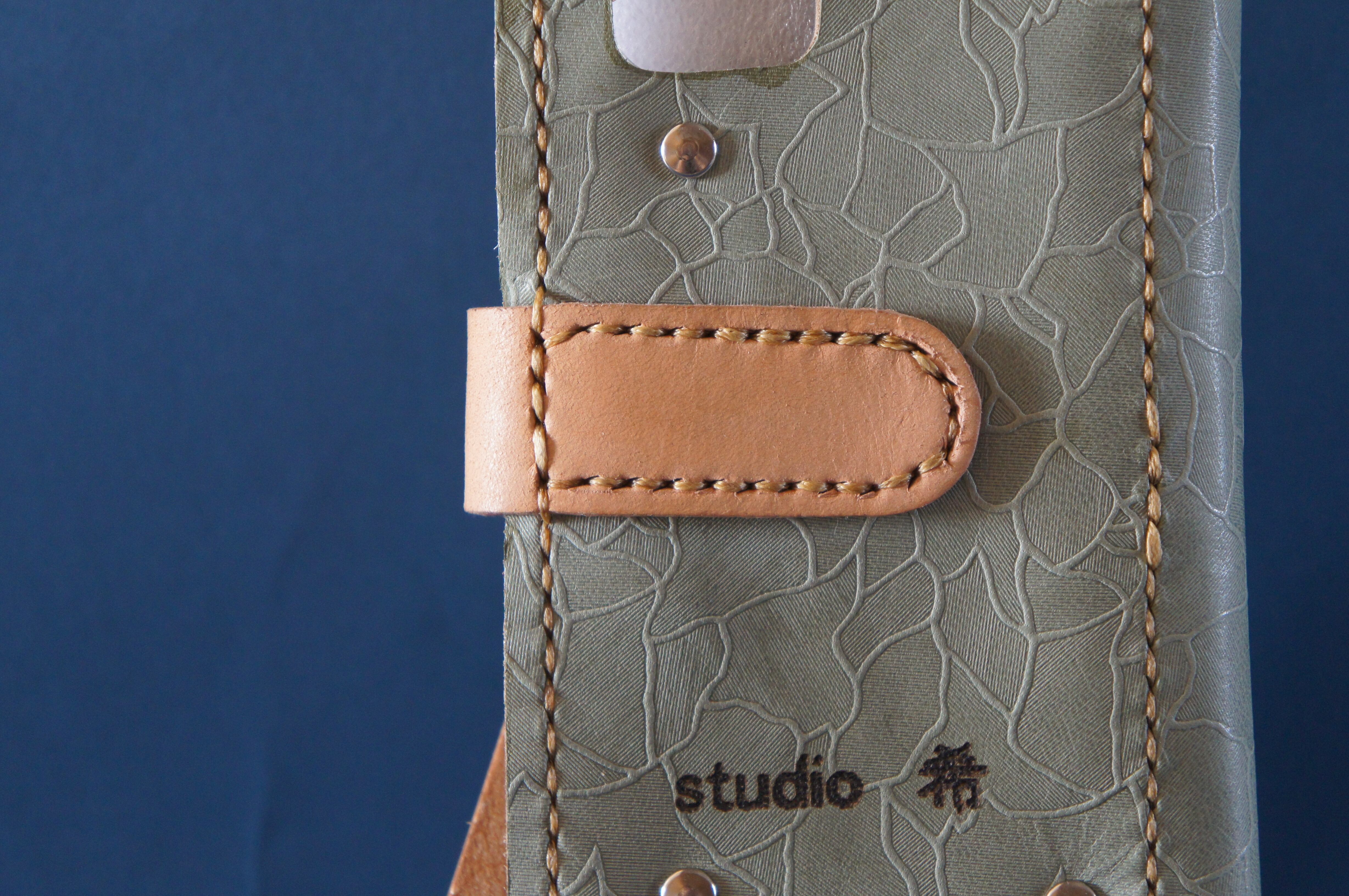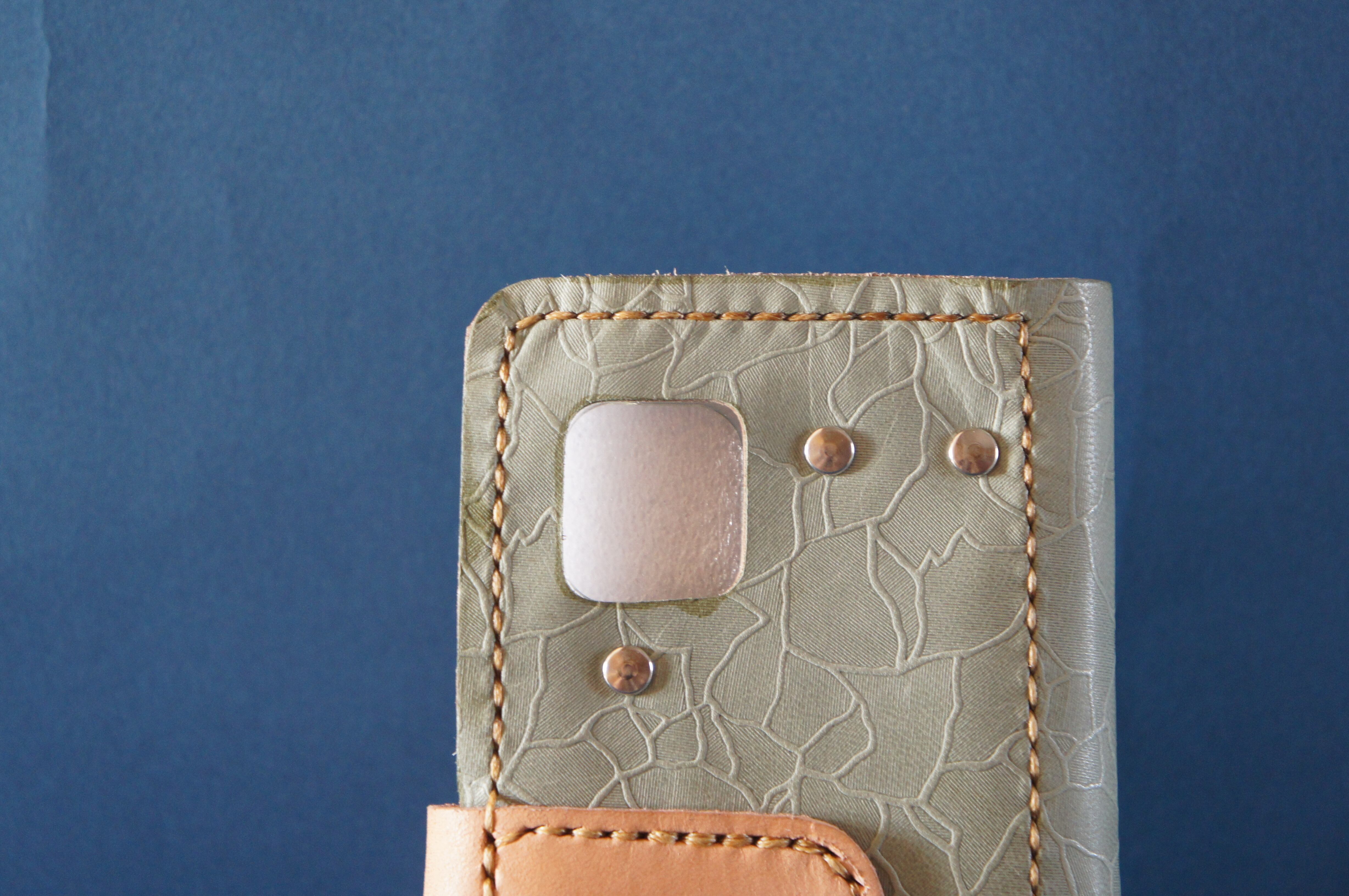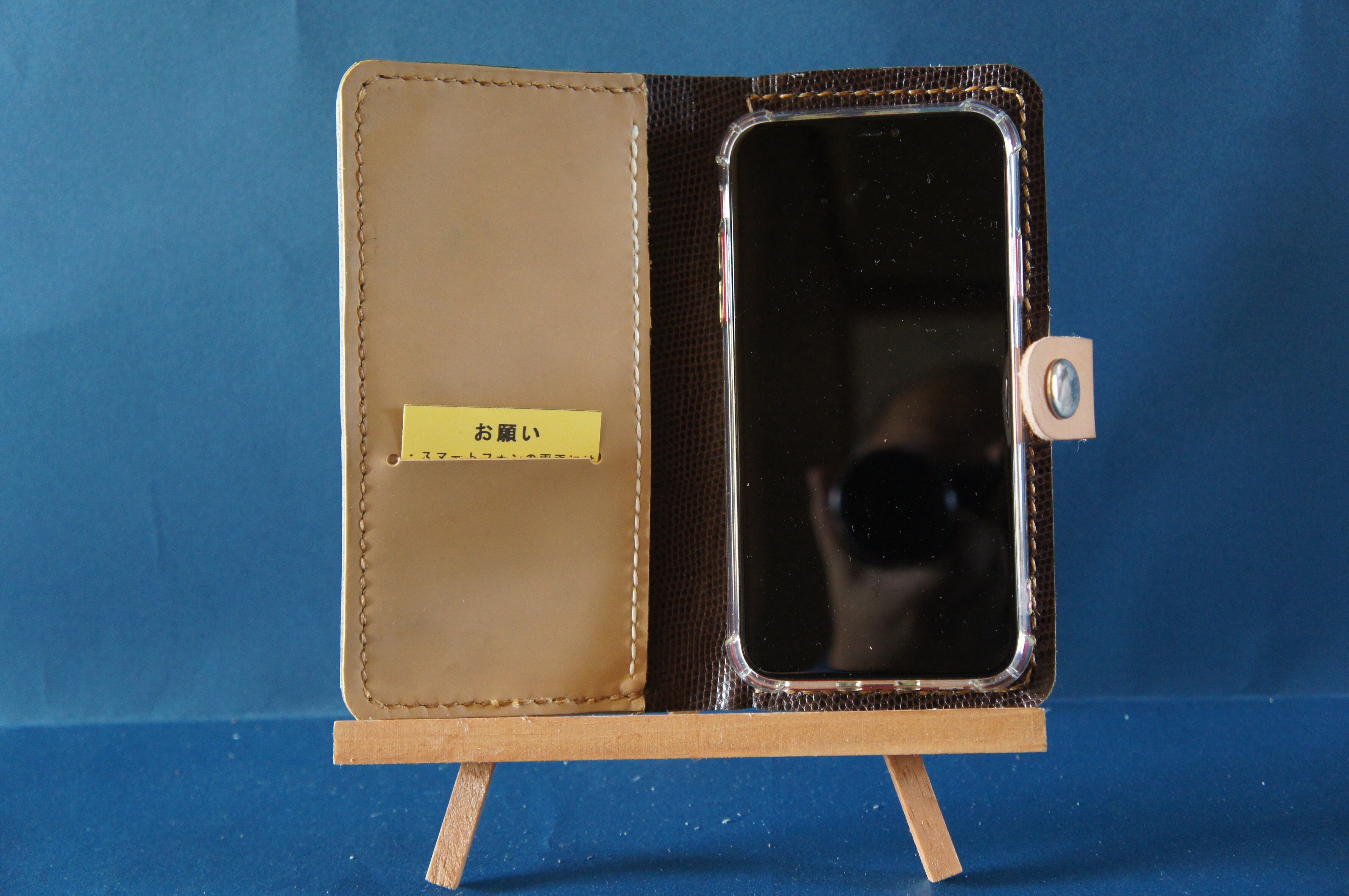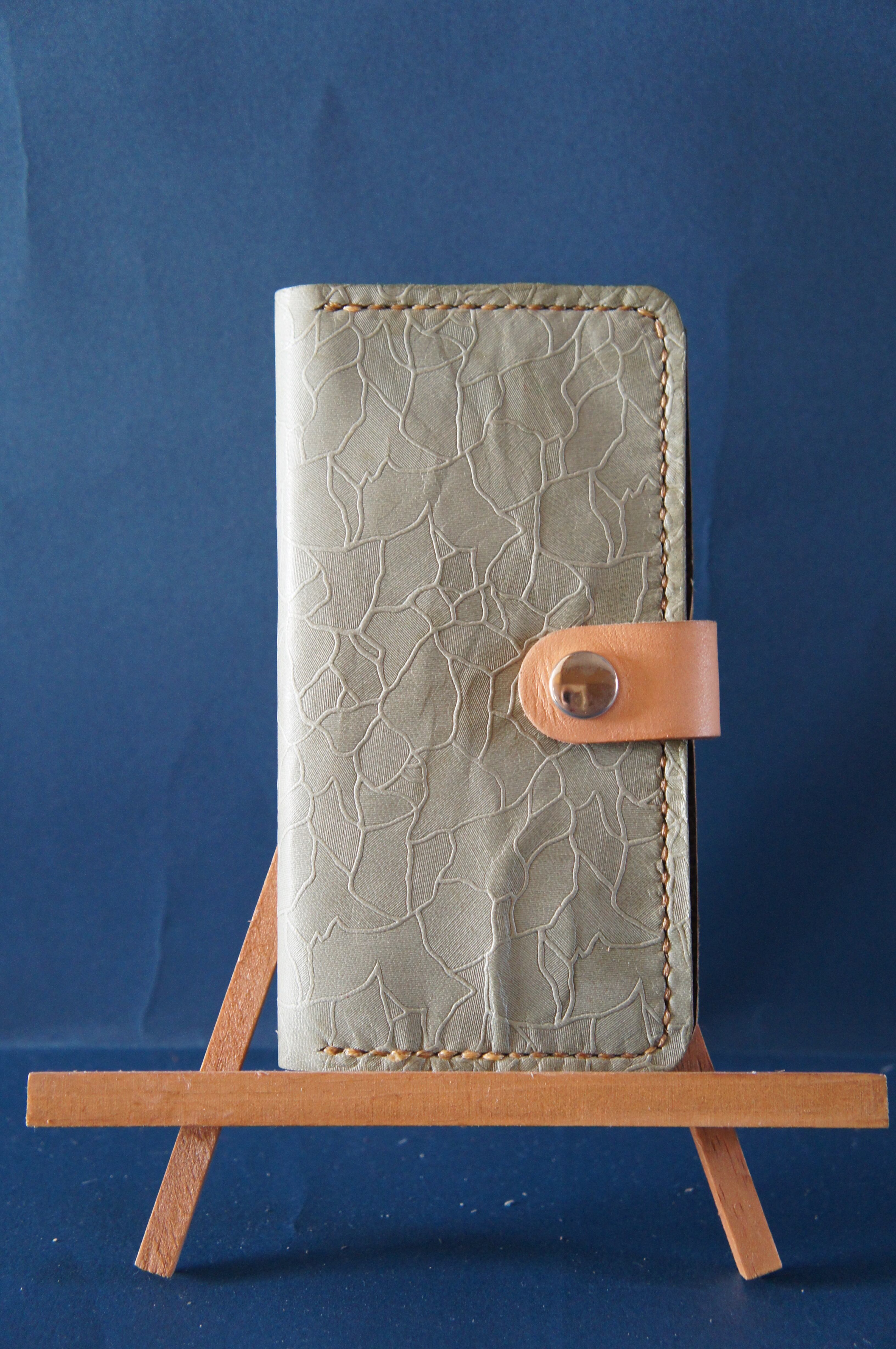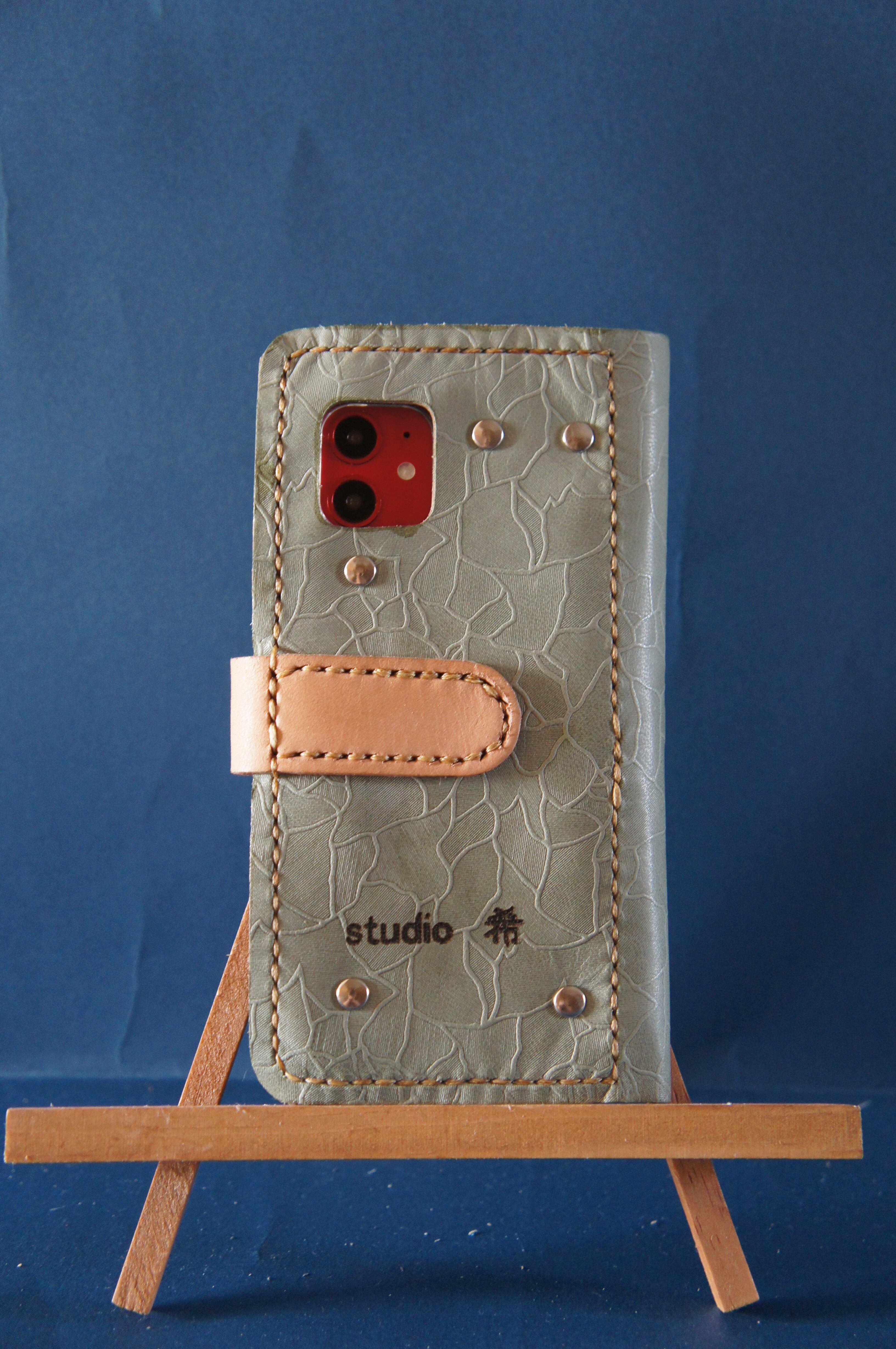 一点物です。iPhone11用の手帳型スマートフォンケースです。本体、内側、カードホルダー、ホルダー裏の合計4枚の革を縫い合わせています。太さ1番の白色の糸ですべて手縫いで仕上げています。2本の針で縫っていますので、ほつれにくい構造になっています。本体は1.5mmの厚さの和柄モザイク模様緑系の牛革です。内側には厚さ0.8mmの牛革を使っています。カードホルダーが1つあります。カードホルダー部分の裏には収納スペースがあります。スマートフォンを固定する部分は、カシメ金具5個で固定してあります。バネホック、金具の色はシルバーです。カメラ穴部分を固くするためには皮革硬化剤を使用しています。貼り付け部分はつるつるになるまでトコフィニッシュなどを使って磨いています。