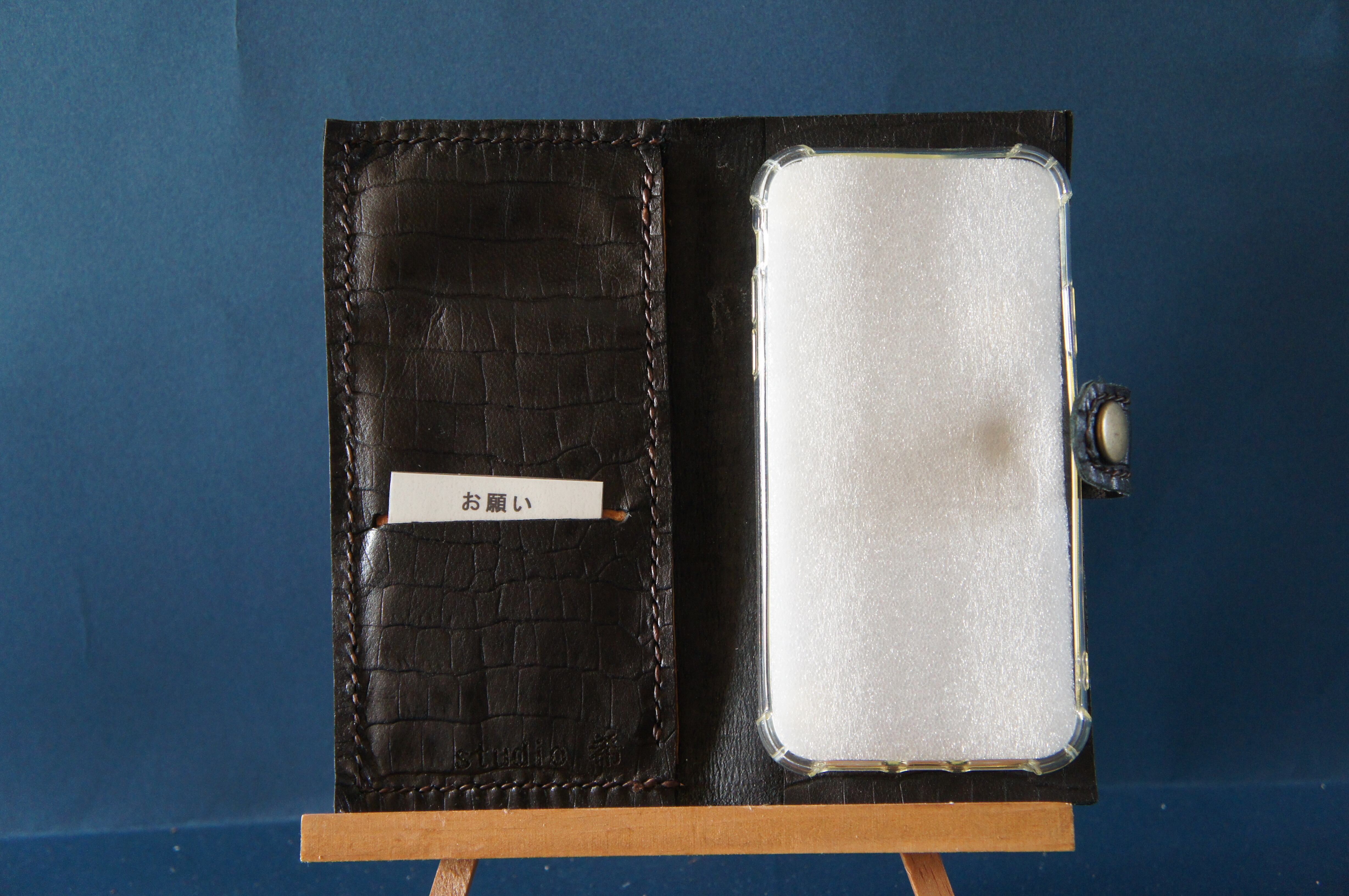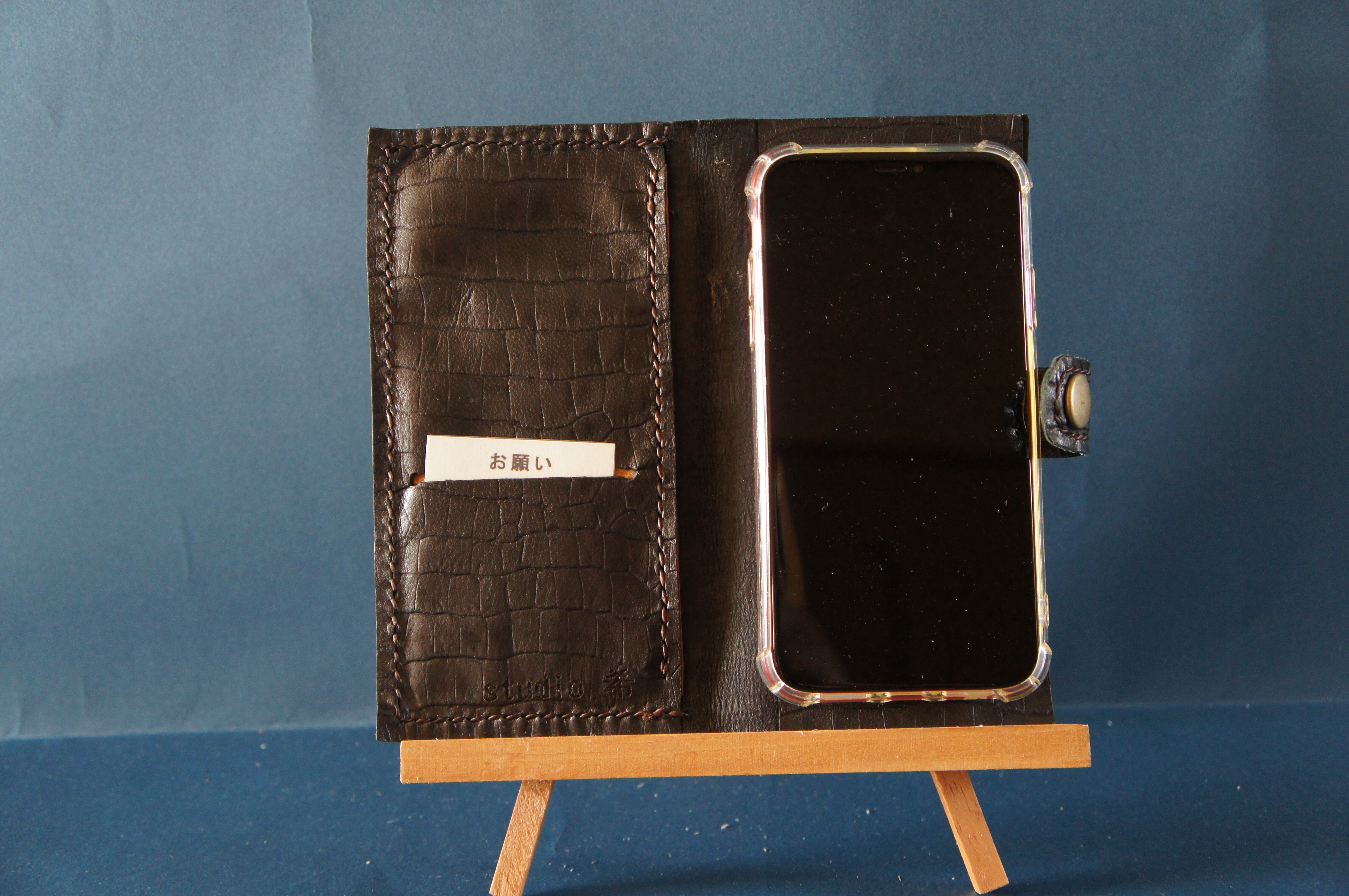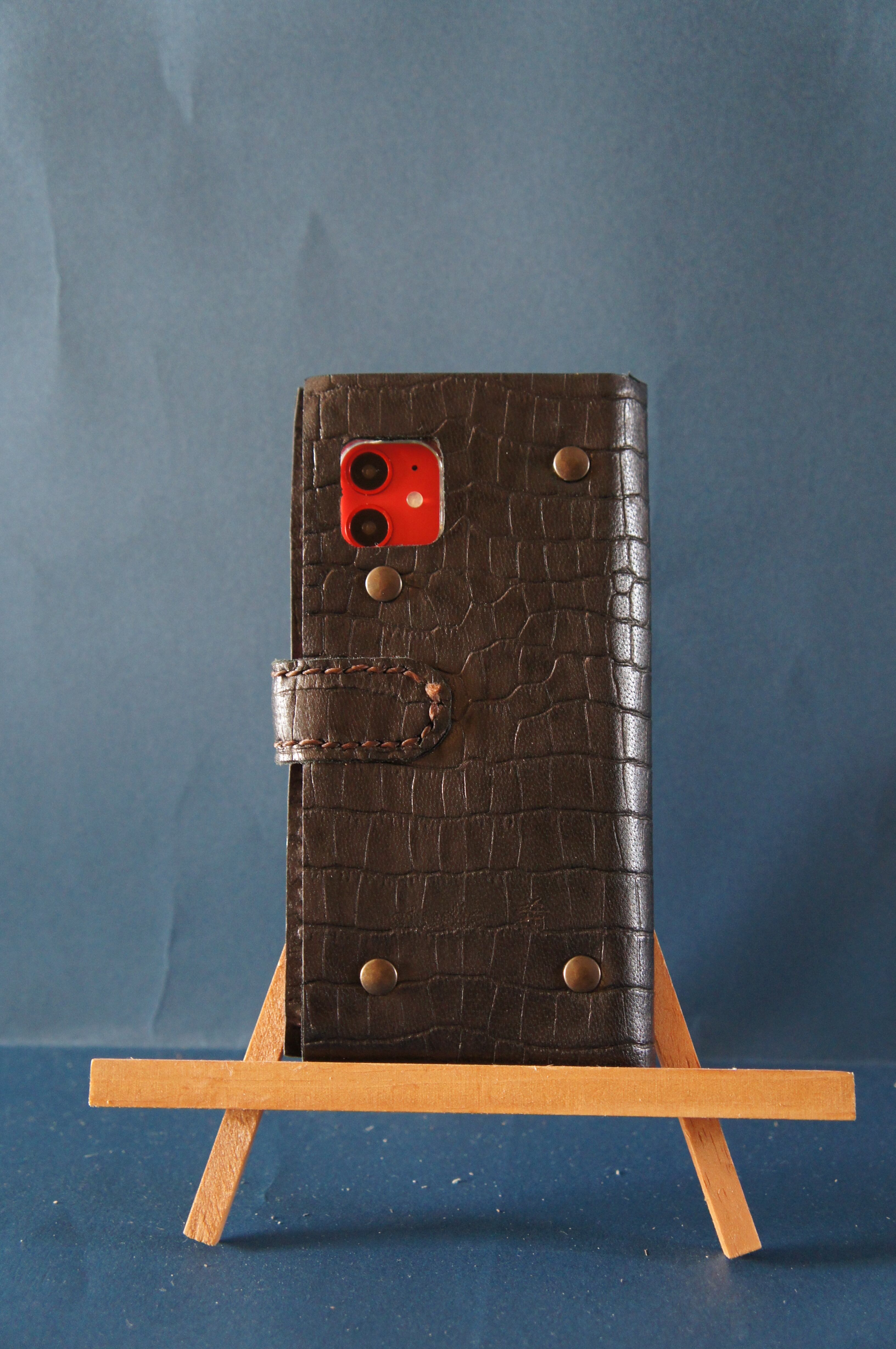 一点物です。iPhone11用の手帳型スマートフォンケースです。本体、内側、カードホルダー、ホルダー裏の合計4枚の革を縫い合わせています。太さ1番の白色の糸ですべて手縫いで仕上げています。2本の針で縫っていますので、ほつれにくい構造になっています。本体は1.5mmの厚さのワニ型押しのソフトな黒色の牛革です。内側には同じ革を使っています。カードホルダーが1つあります。カードホルダー部分の裏には収納スペースがあります。スマートフォンを固定する部分は、カシメ金具4個で固定してあります。バネホック、金具の色はブロンズです。カメラ穴部分を固くするためには皮革硬化剤を使用しています。貼り付け部分はつるつるになるまでトコフィニッシュなどを使って磨いています。