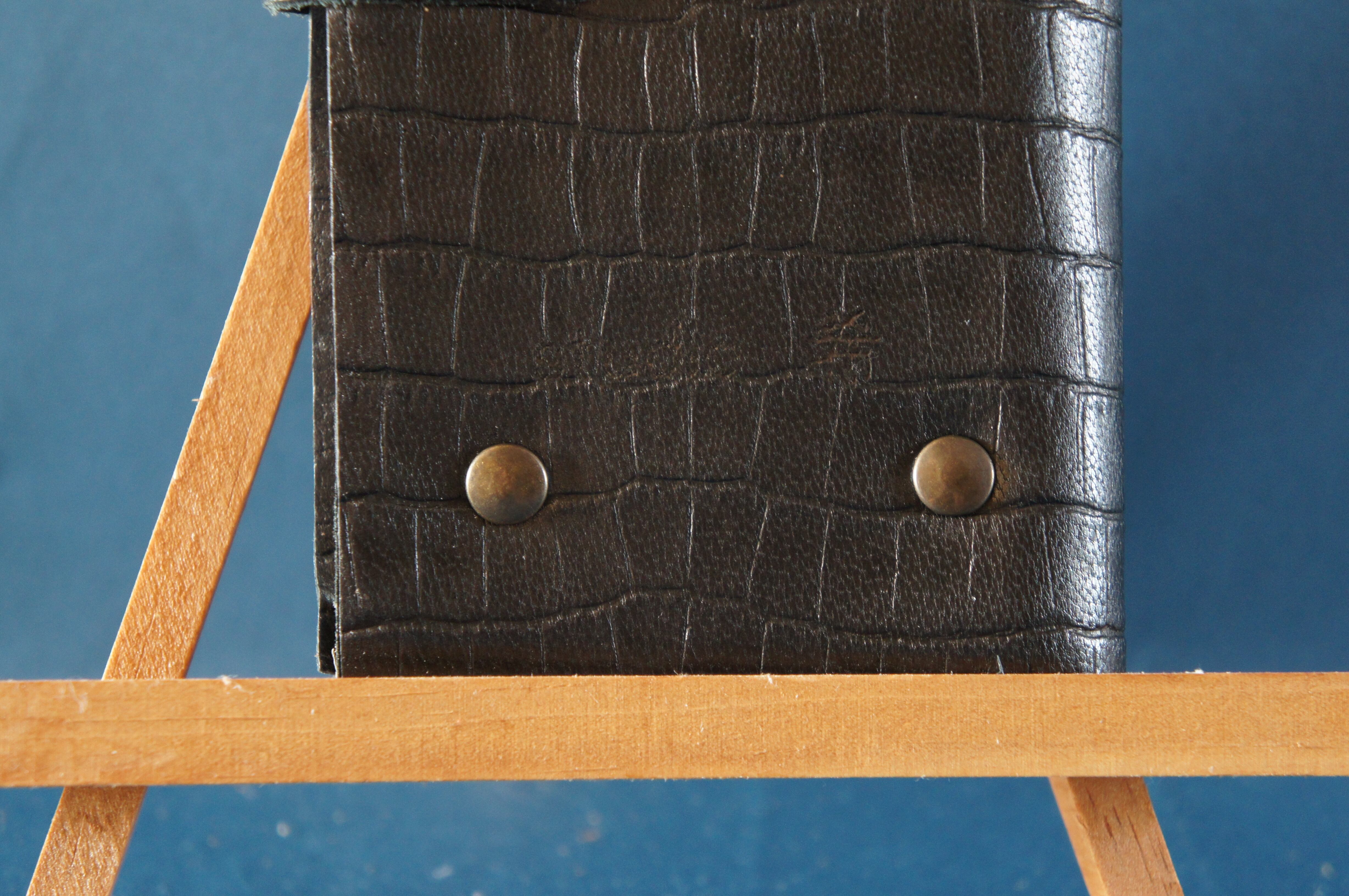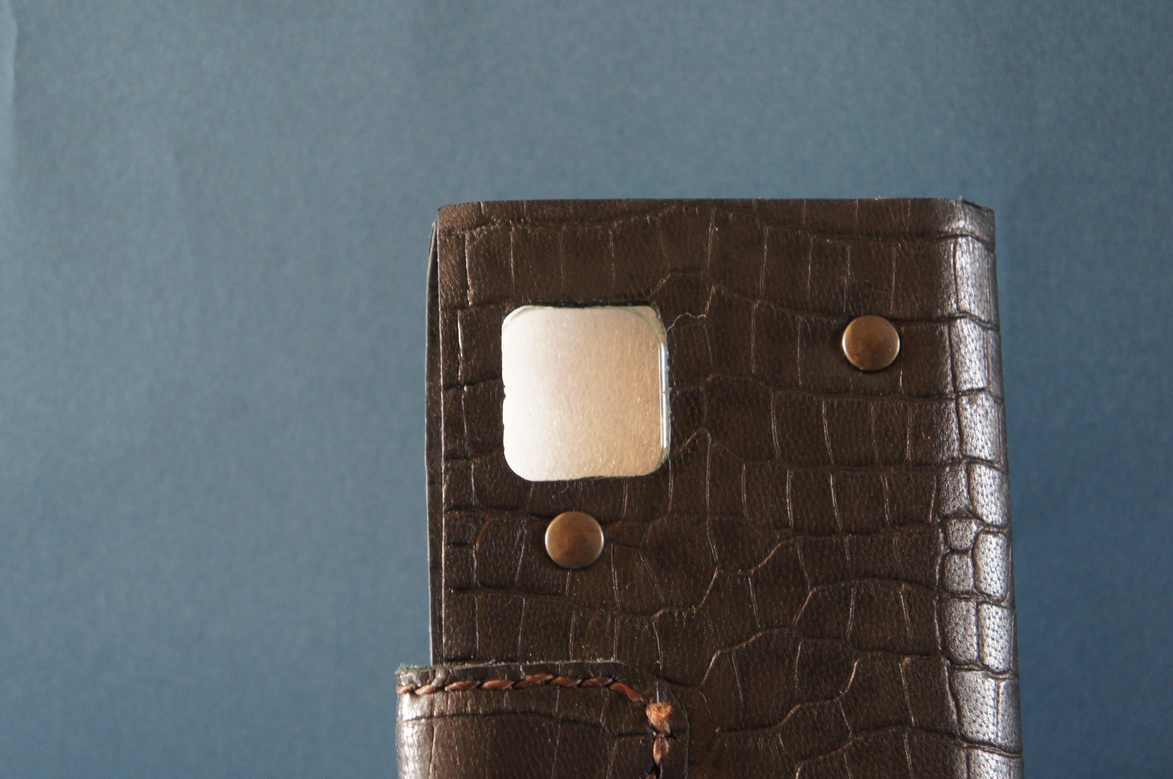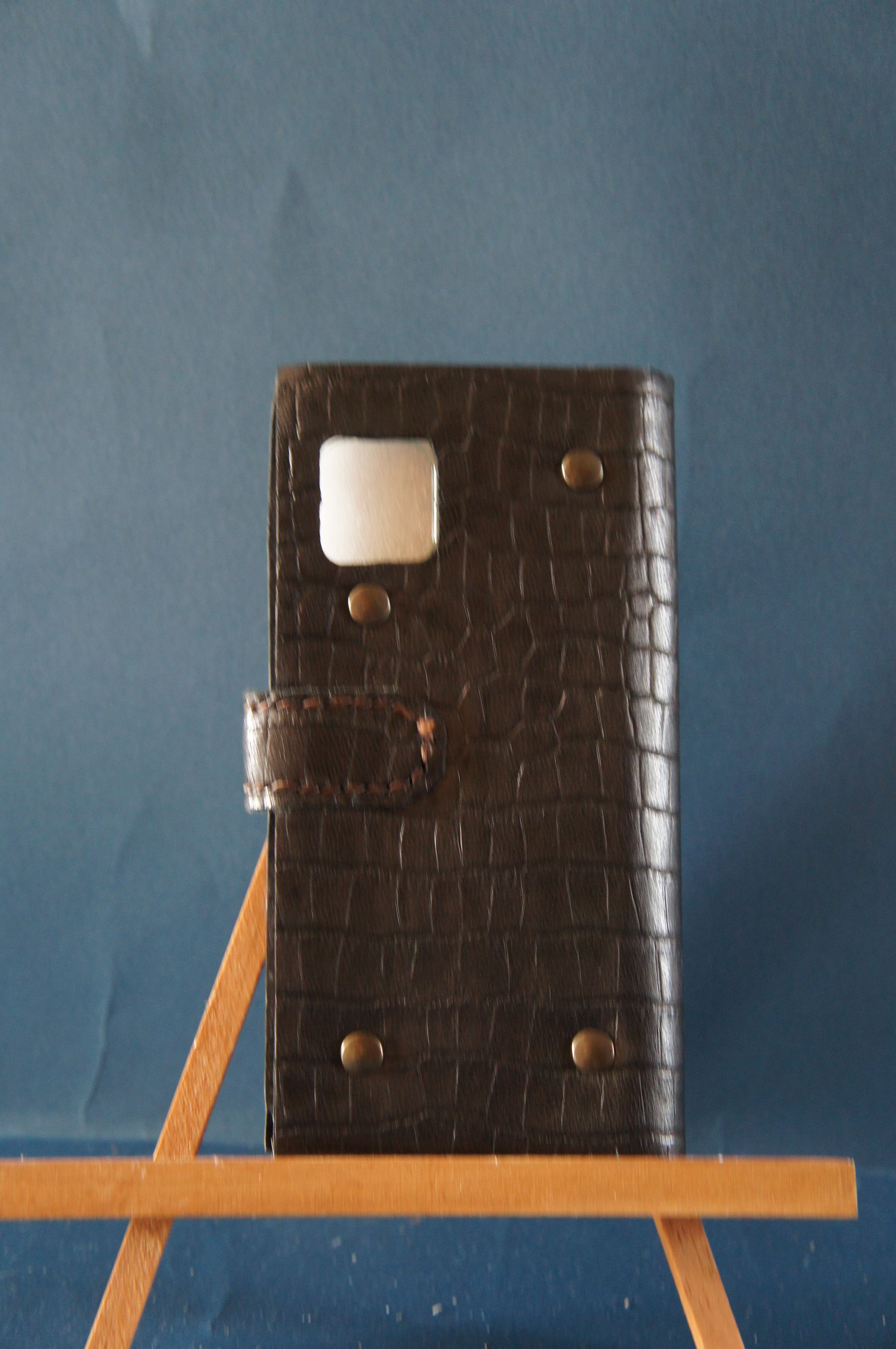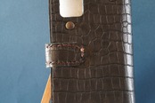 一点物です。iPhone11用の手帳型スマートフォンケースです。本体、内側、カードホルダー、ホルダー裏の合計4枚の革を縫い合わせています。太さ1番の白色の糸ですべて手縫いで仕上げています。2本の針で縫っていますので、ほつれにくい構造になっています。本体は1.5mmの厚さのワニ型押しのソフトな黒色の牛革です。内側には同じ革を使っています。カードホルダーが1つあります。カードホルダー部分の裏には収納スペースがあります。スマートフォンを固定する部分は、カシメ金具4個で固定してあります。バネホック、金具の色はブロンズです。カメラ穴部分を固くするためには皮革硬化剤を使用しています。貼り付け部分はつるつるになるまでトコフィニッシュなどを使って磨いています。