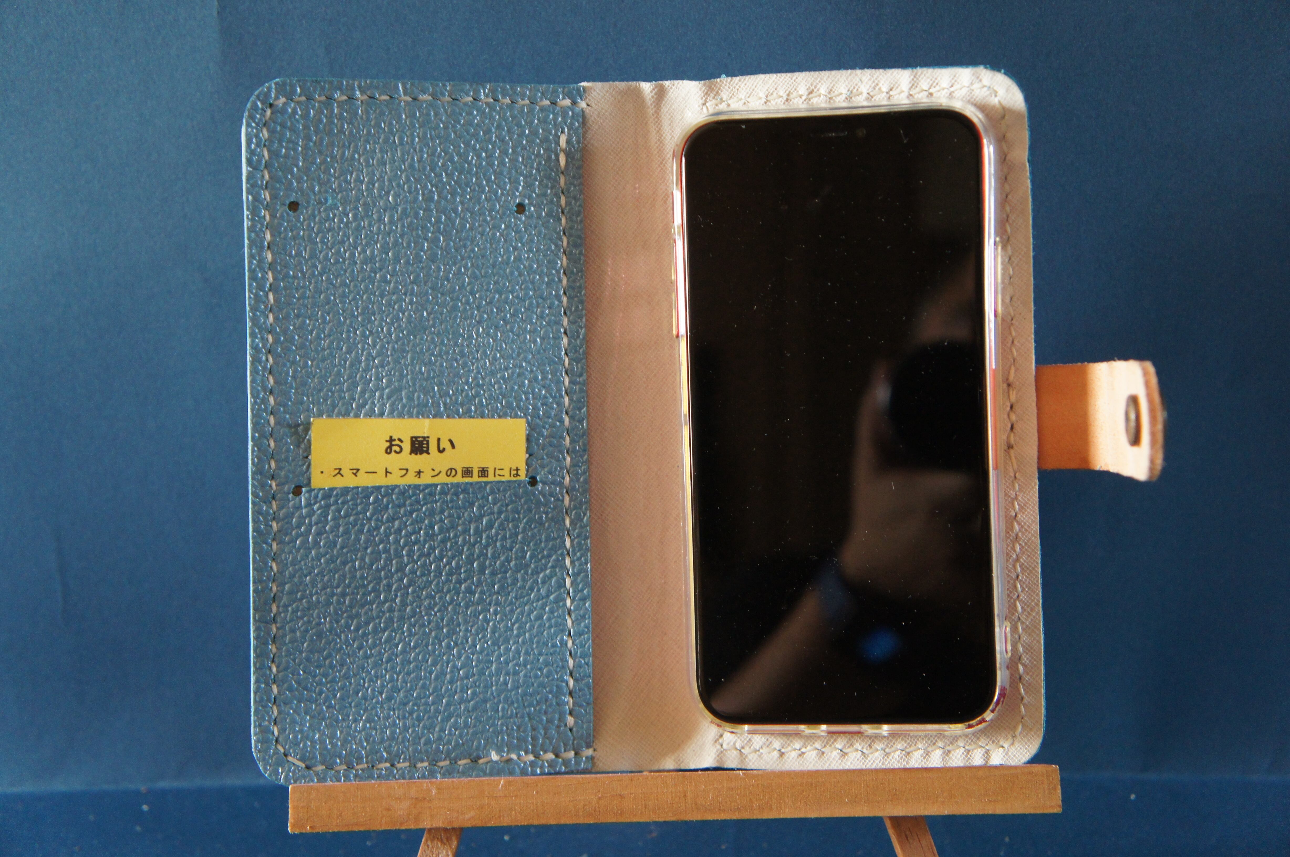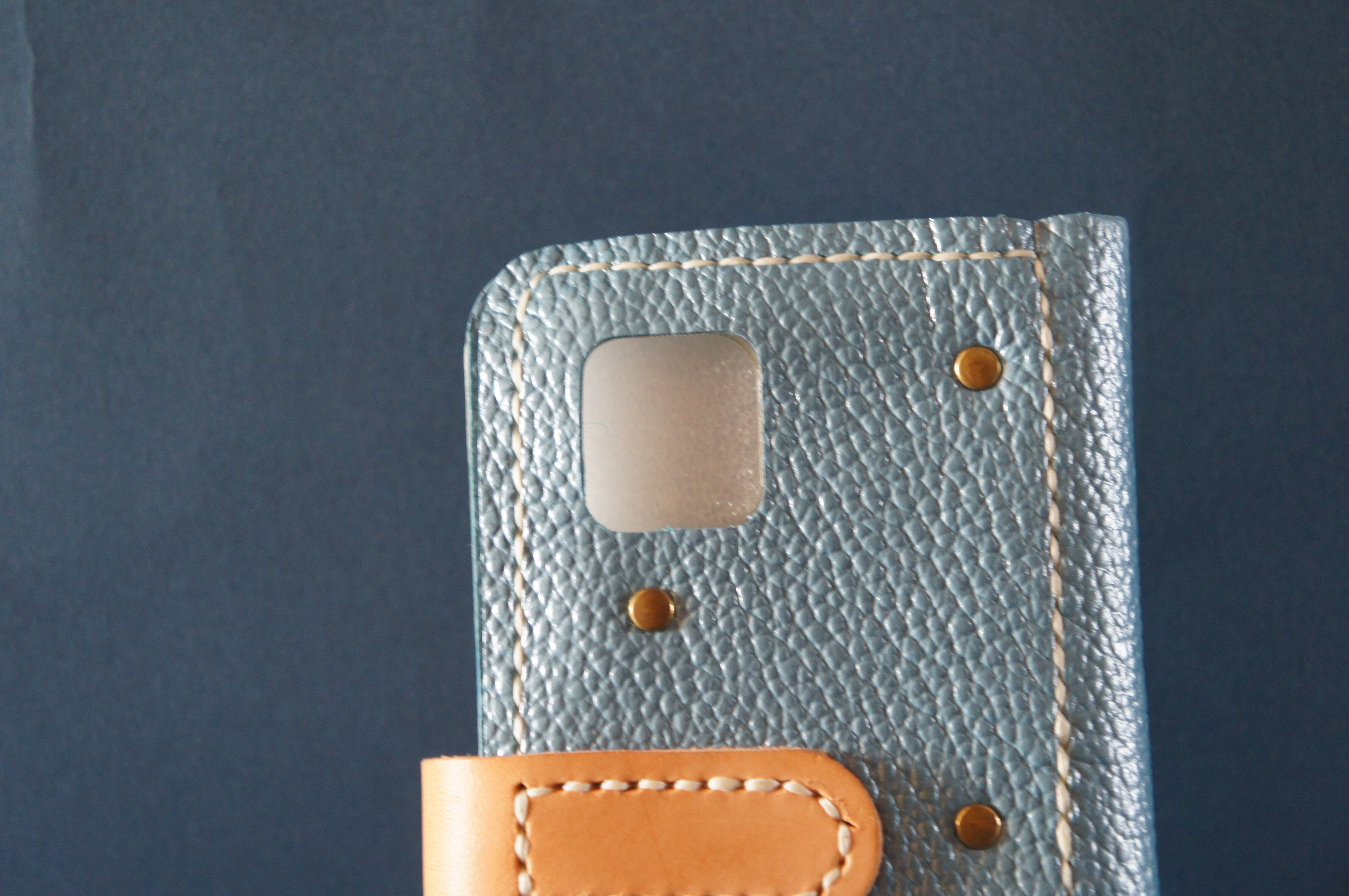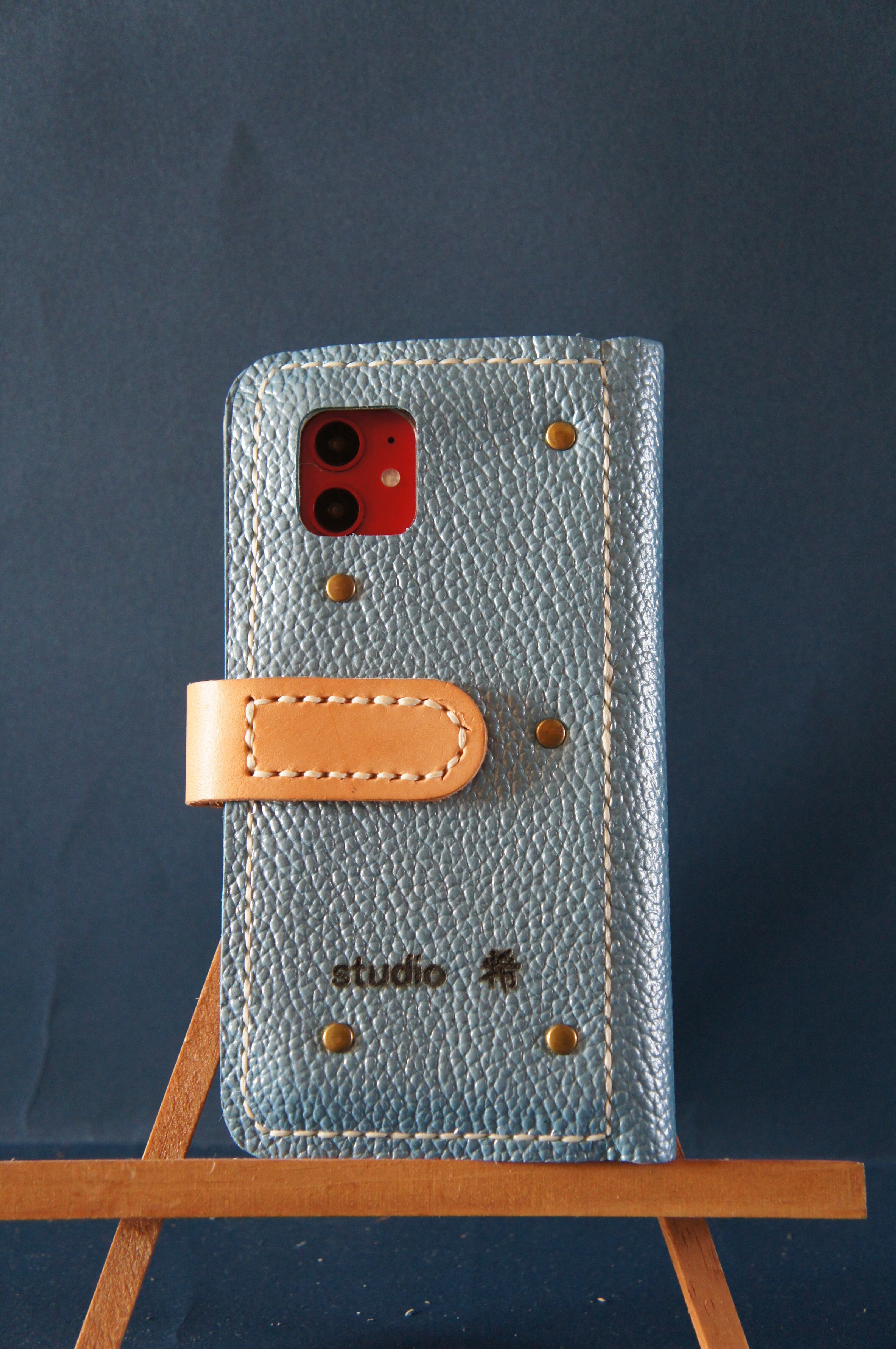 一点物です。iPhone11用の手帳型スマートフォンケースです。本体、内側、カードホルダー、ホルダー裏の合計4枚の革を縫い合わせています。太さ1番の白色の糸ですべて手縫いで仕上げています。2本の針で縫っていますので、ほつれにくい構造になっています。本体は1.5mmの厚さのブルーメタリックのシュリンクの水色の牛革です。内側には厚さ0.8mmの牛革を使っています。カードホルダーが2つあります。カードホルダー部分の裏には収納スペースがあります。スマートフォンを固定する部分は、カシメ金具5個で固定してあります。バネホック、金具の色は銅色です。カメラ穴部分を固くするためには皮革硬化剤を使用しています。貼り付け部分はつるつるになるまでトコフィニッシュなどを使って磨いています。