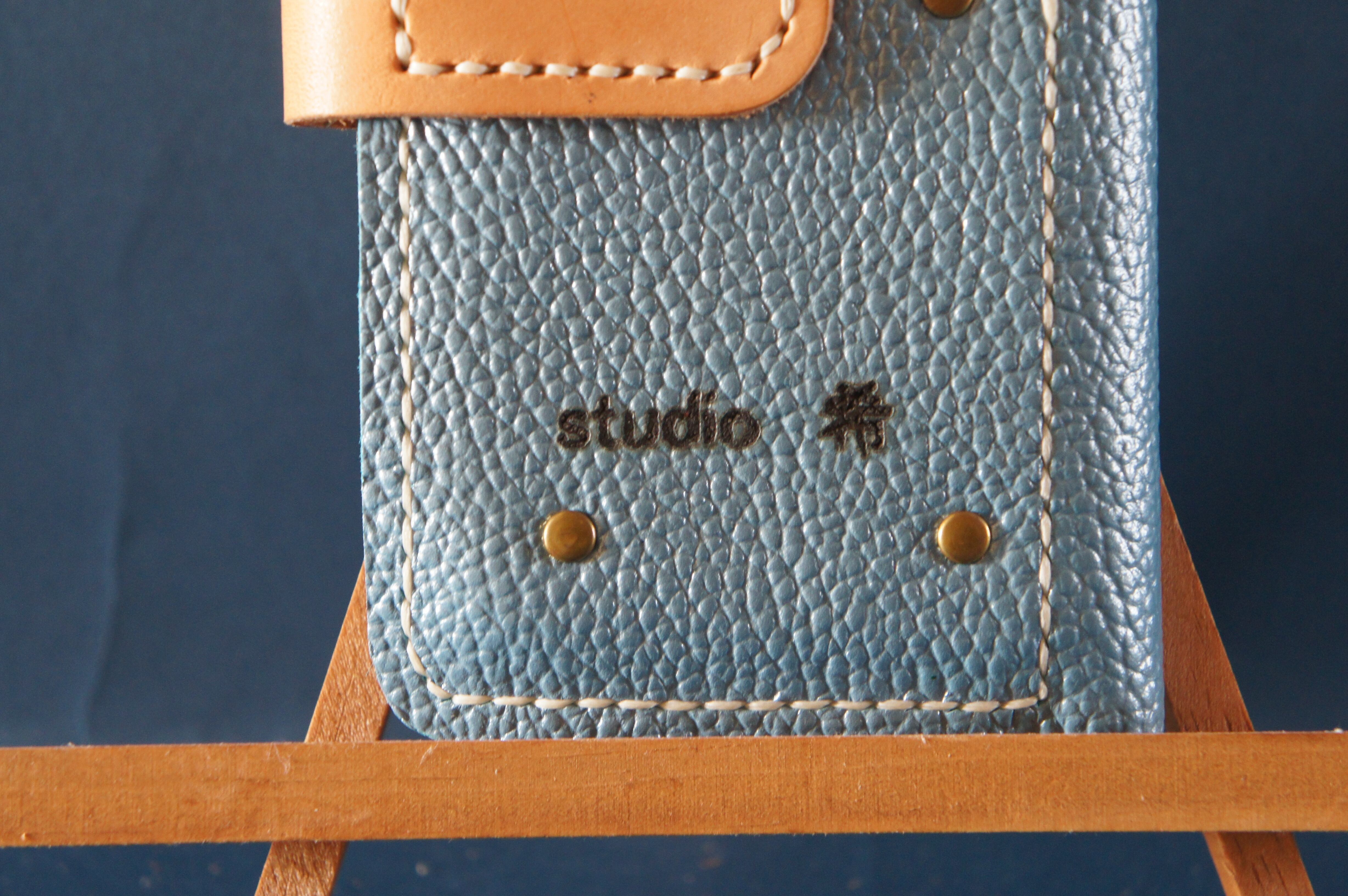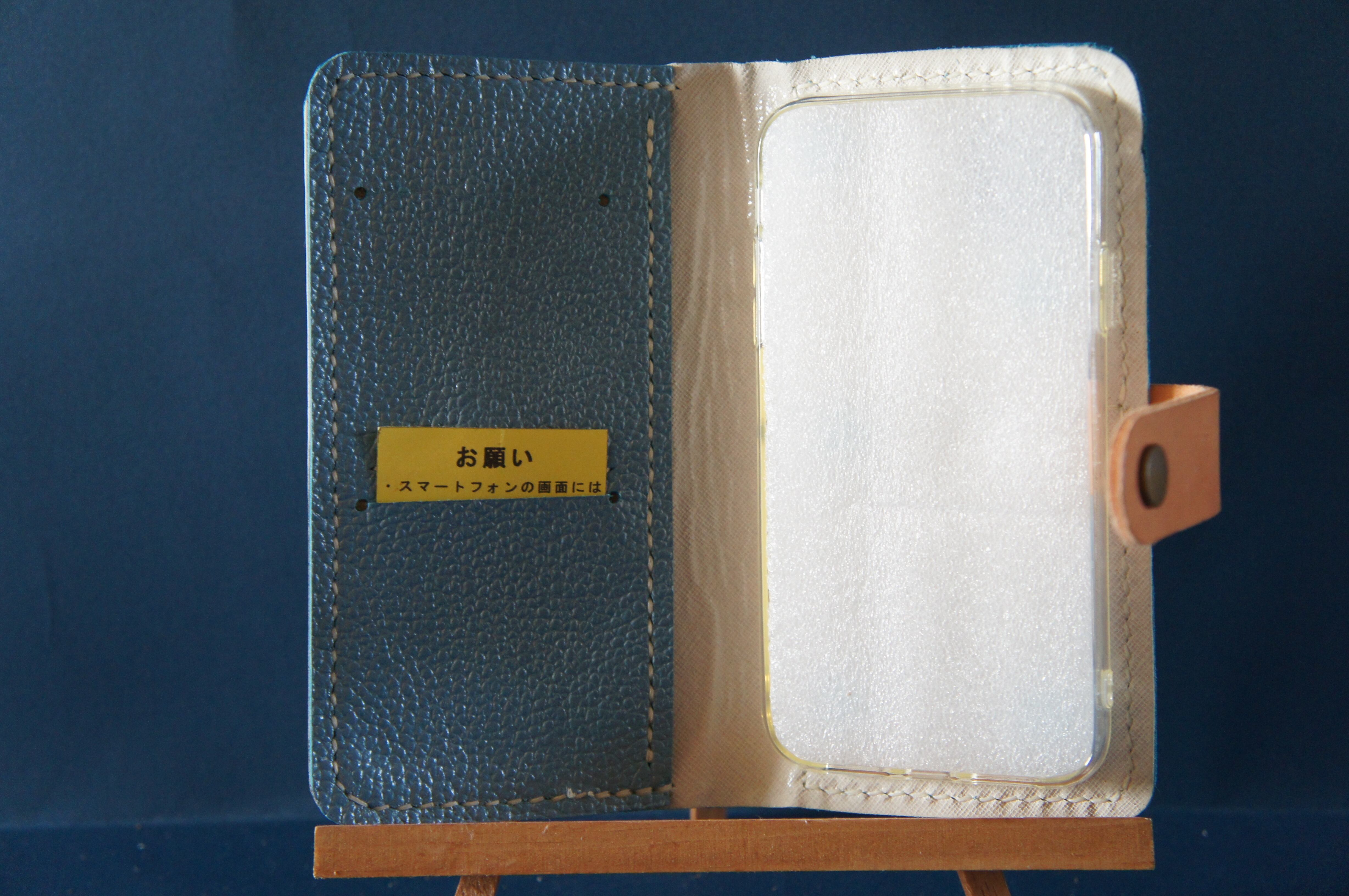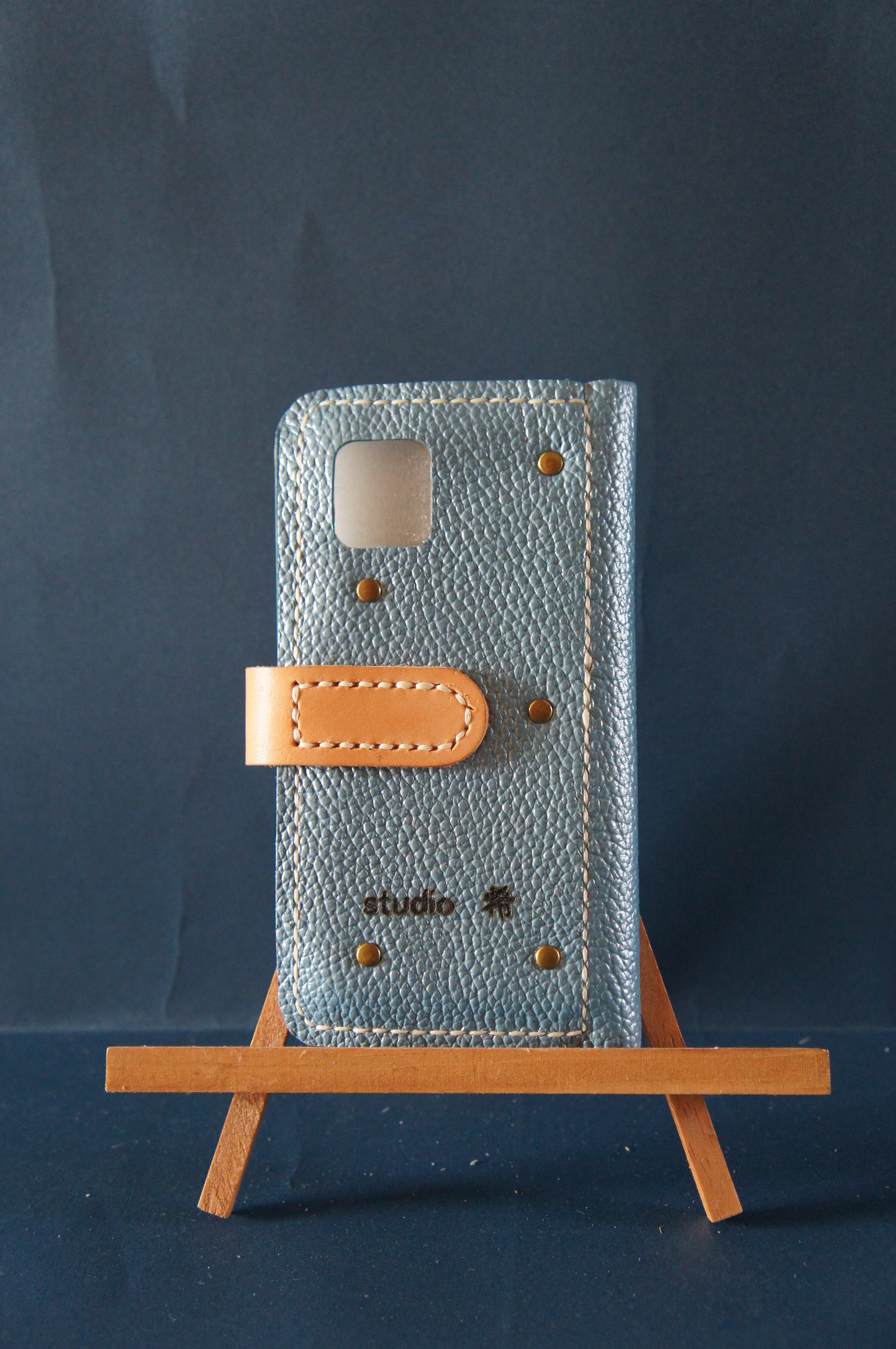一点物です。iPhone11用の手帳型スマートフォンケースです。本体、内側、カードホルダー、ホルダー裏の合計4枚の革を縫い合わせています。太さ1番の白色の糸ですべて手縫いで仕上げています。2本の針で縫っていますので、ほつれにくい構造になっています。本体は1.5mmの厚さのブルーメタリックのシュリンクの水色の牛革です。内側には厚さ0.8mmの牛革を使っています。カードホルダーが2つあります。カードホルダー部分の裏には収納スペースがあります。スマートフォンを固定する部分は、カシメ金具5個で固定してあります。バネホック、金具の色は銅色です。カメラ穴部分を固くするためには皮革硬化剤を使用しています。貼り付け部分はつるつるになるまでトコフィニッシュなどを使って磨いています。