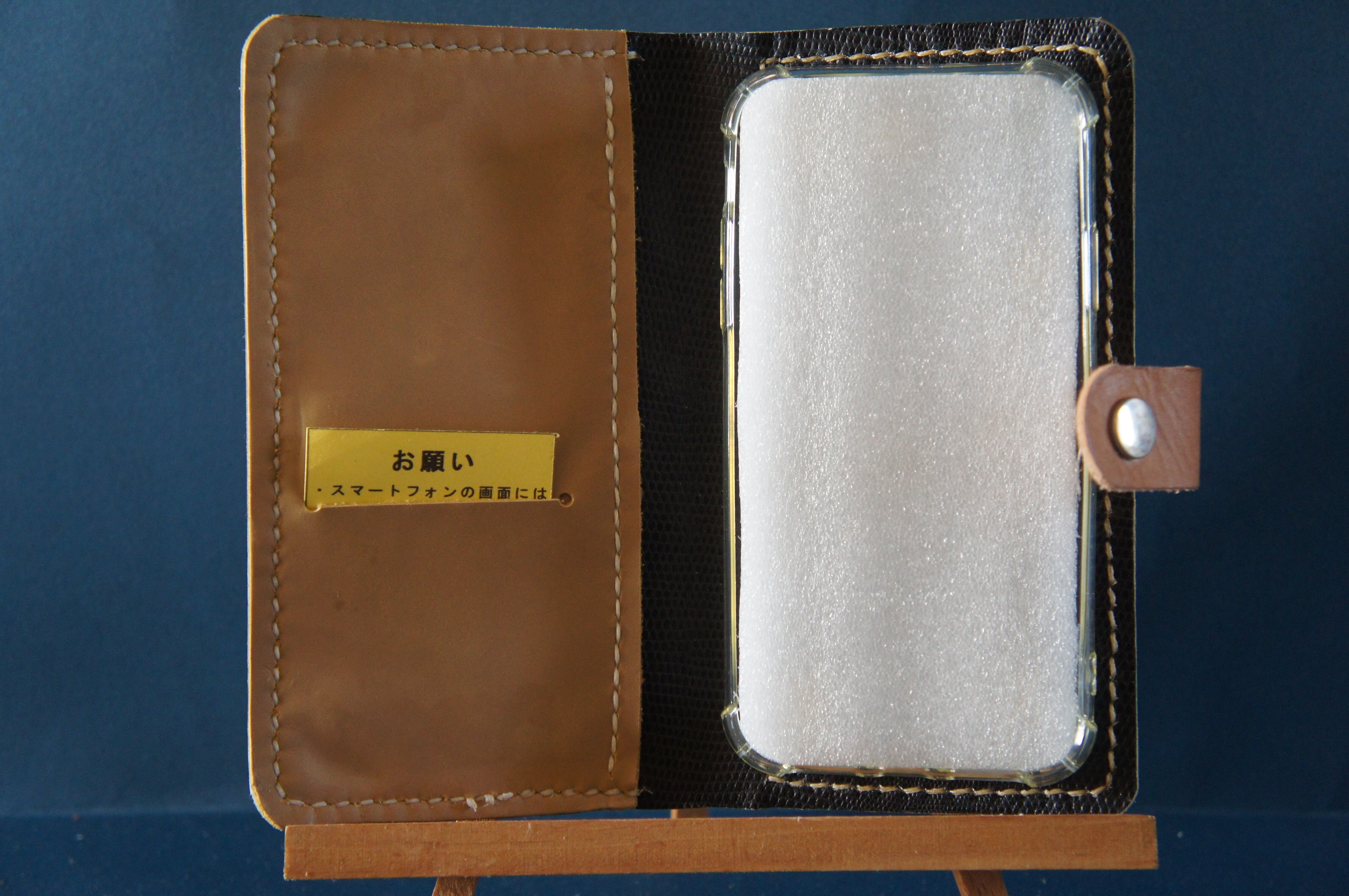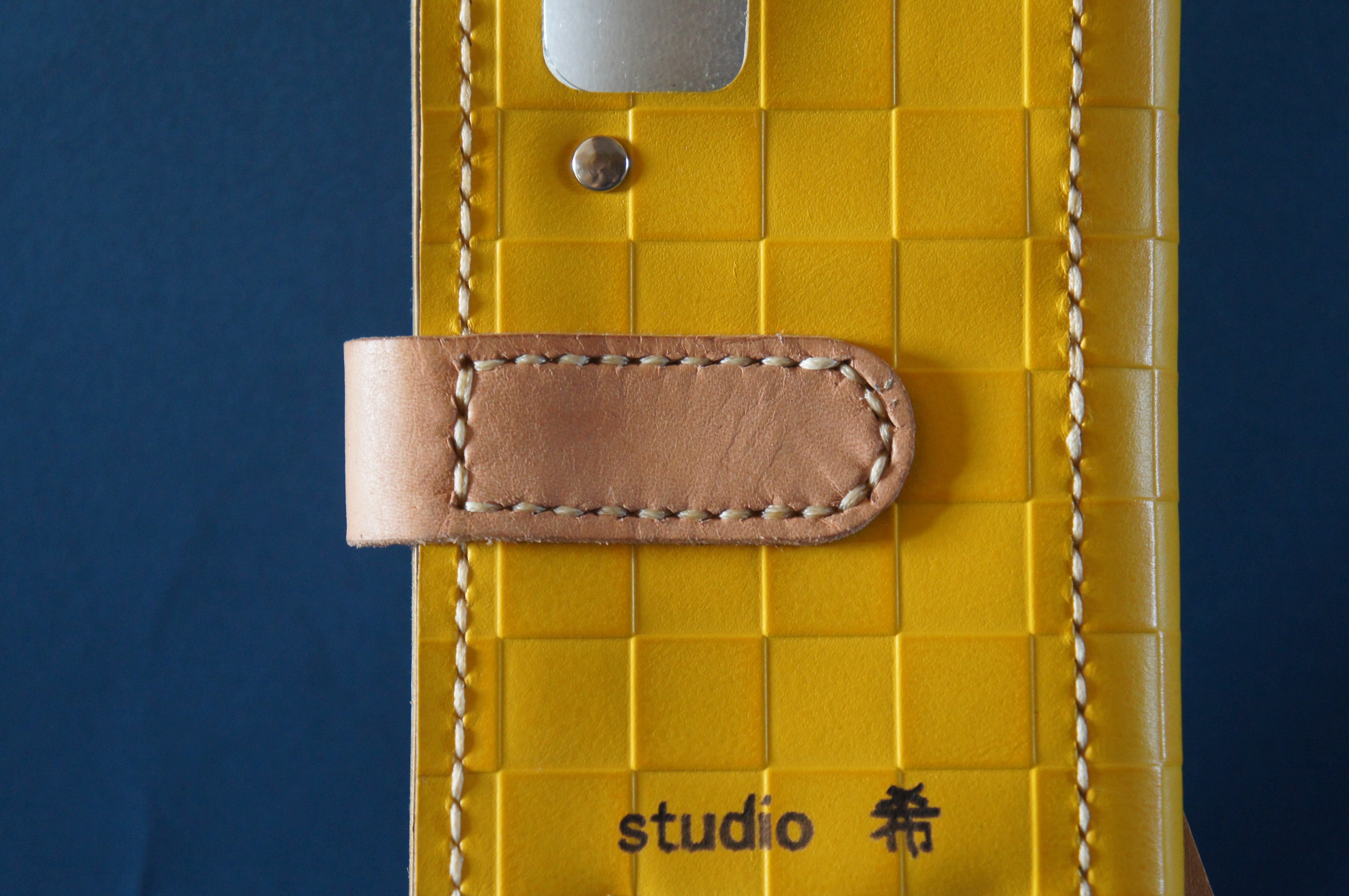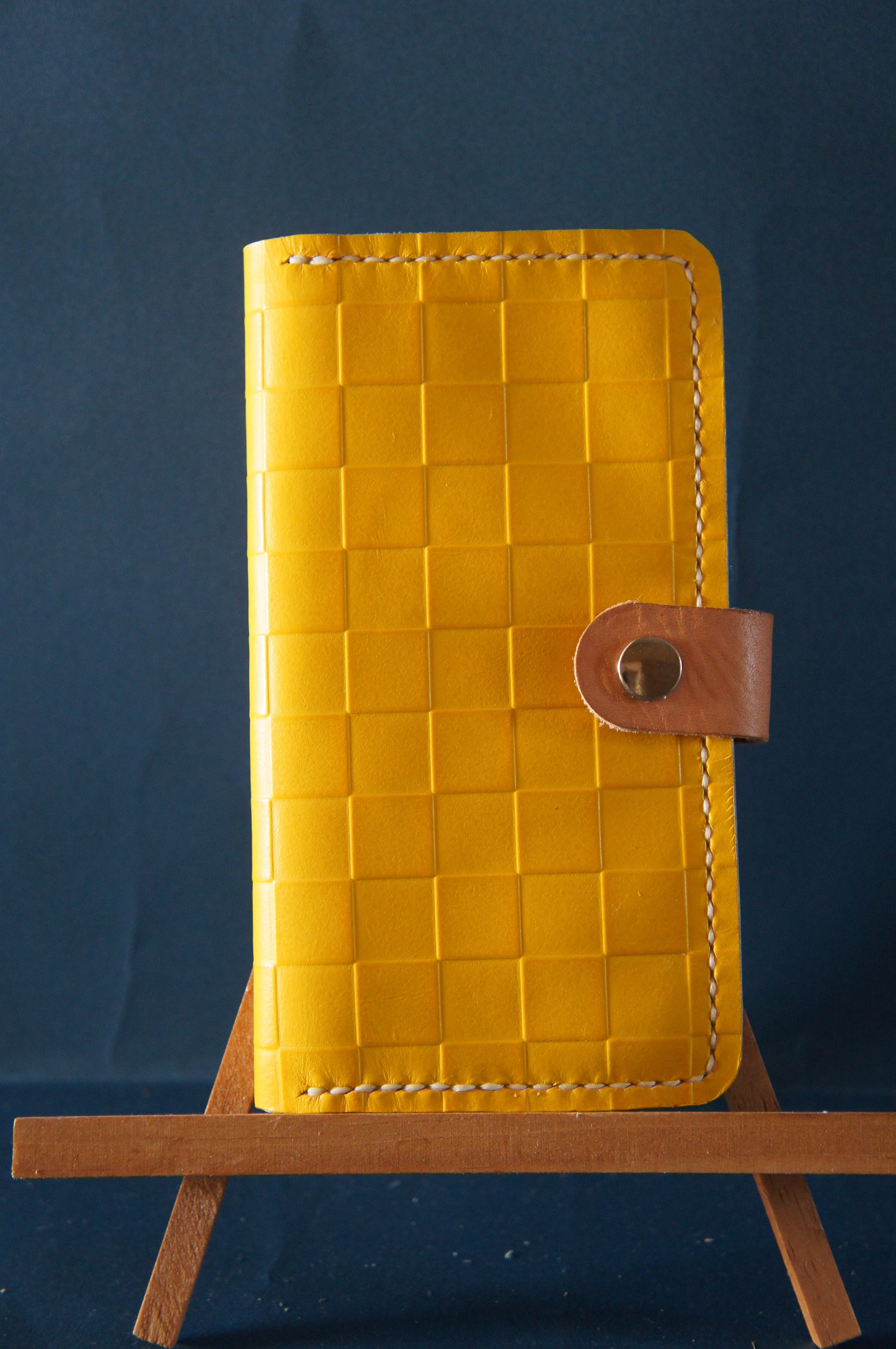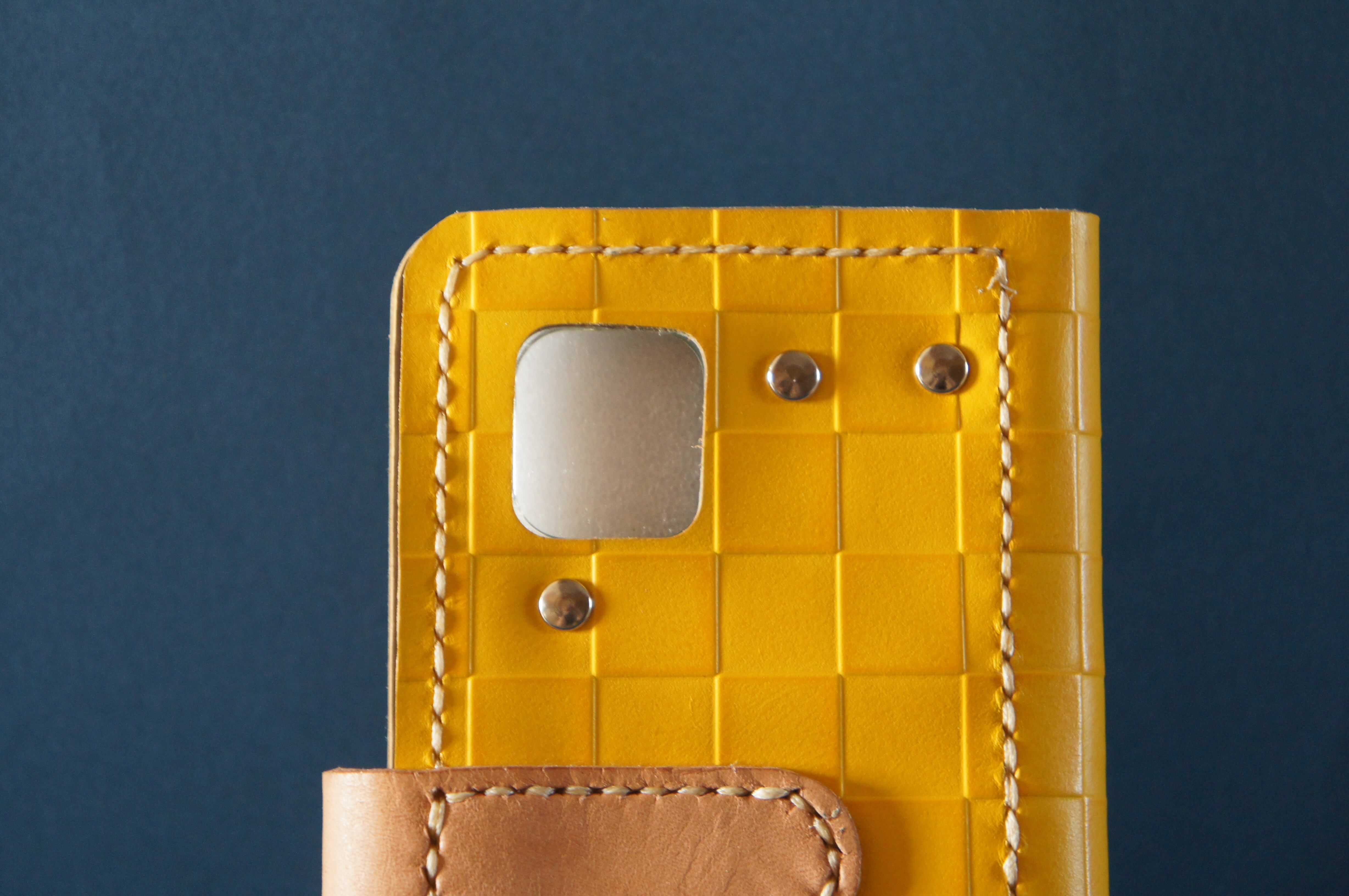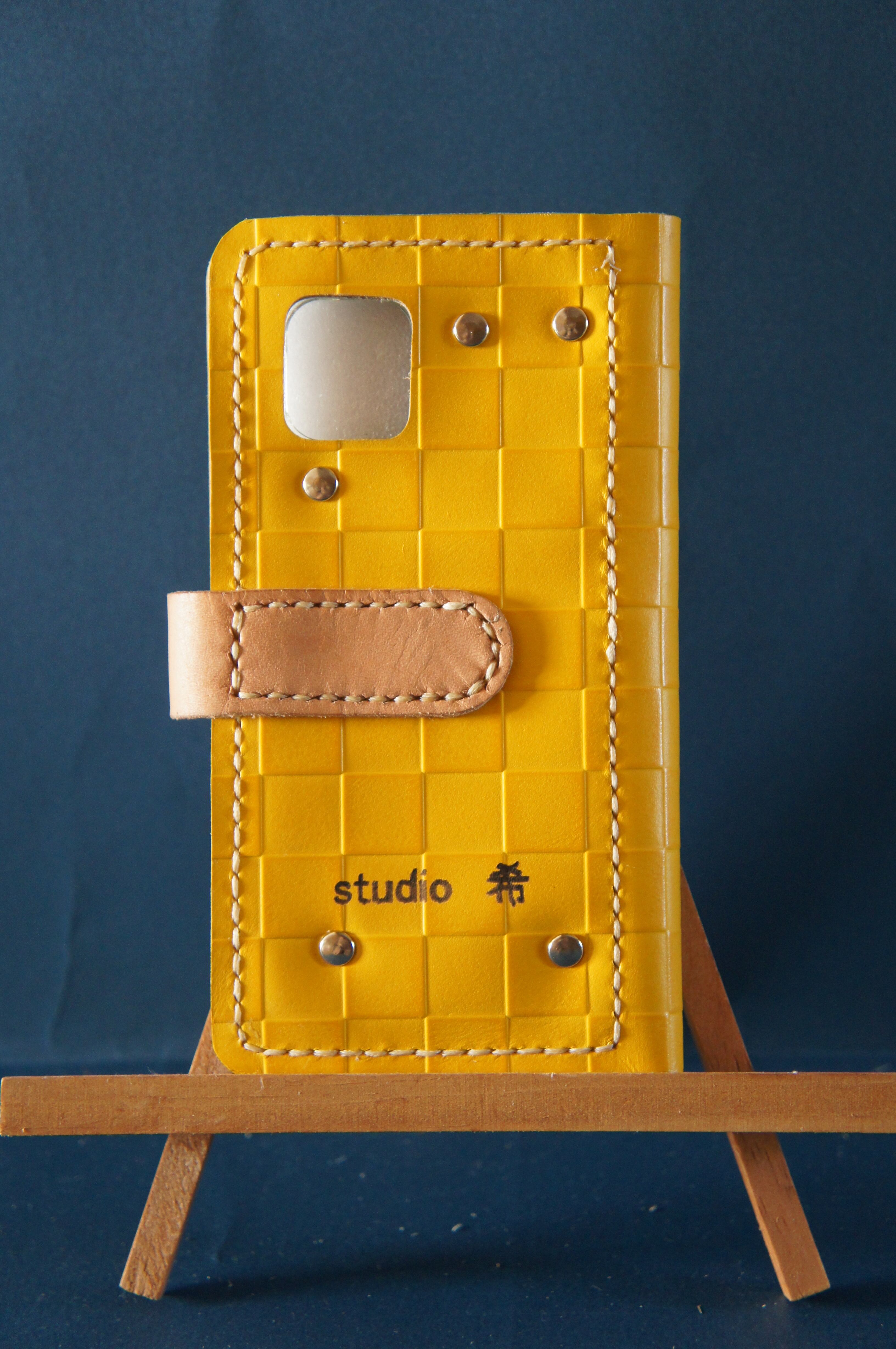 一点物です。iPhone11用の手帳型スマートフォンケースです。本体、内側、カードホルダー、ホルダー裏の合計4枚の革を縫い合わせています。太さ1番の白色の糸ですべて手縫いで仕上げています。2本の針で縫っていますので、ほつれにくい構造になっています。本体は1.5mmの厚さの市松模様の黄色の牛革です。内側には厚さ0.8mmの牛革を使っています。カードホルダーが1つあります。カードホルダー部分の裏には収納スペースがあります。スマートフォンを固定する部分は、カシメ金具5個で固定してあります。バネホック、金具の色はシルバーです。カメラ穴部分を固くするためには皮革硬化剤を使用しています。貼り付け部分はつるつるになるまでトコフィニッシュなどを使って磨いています。