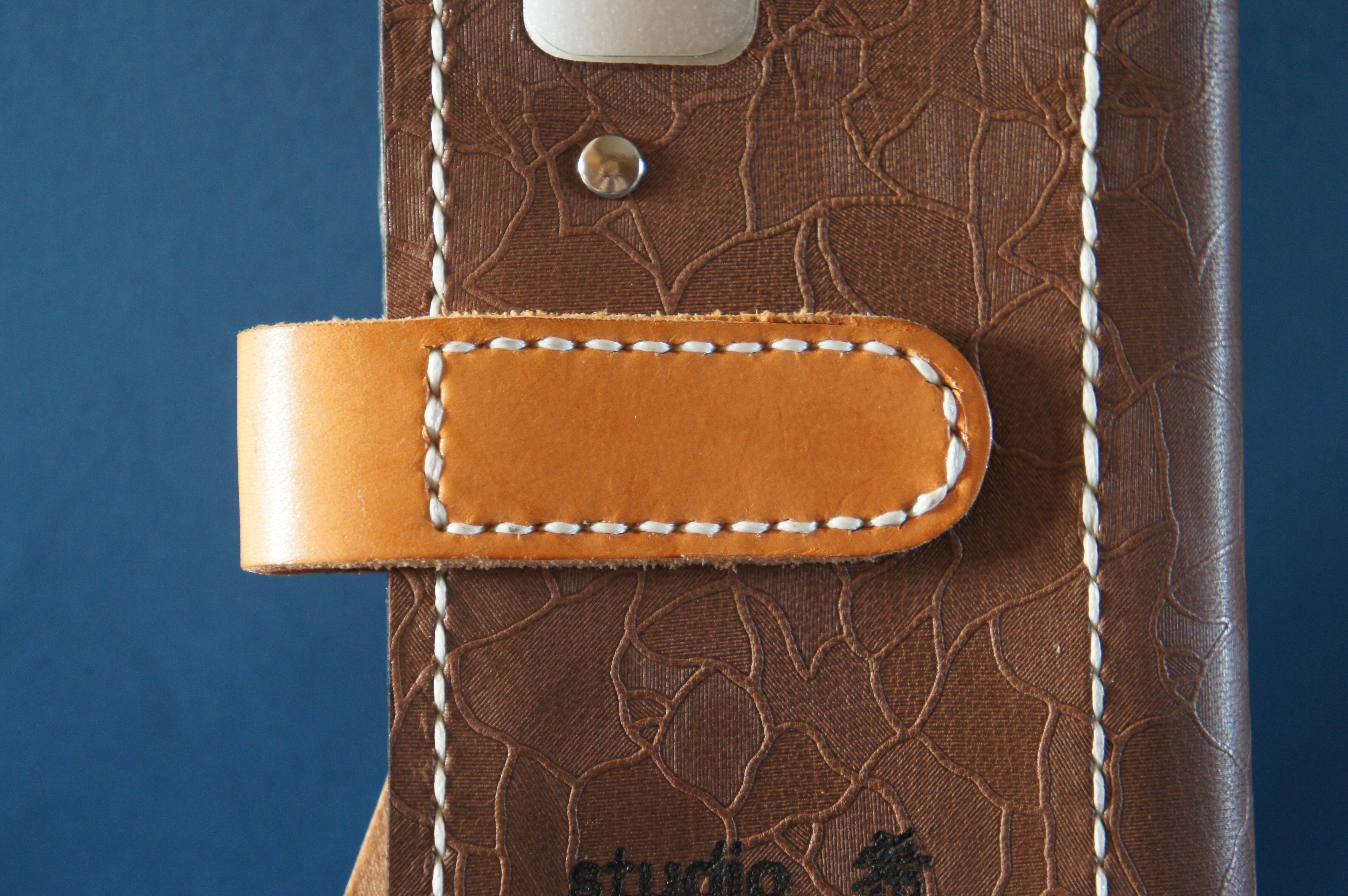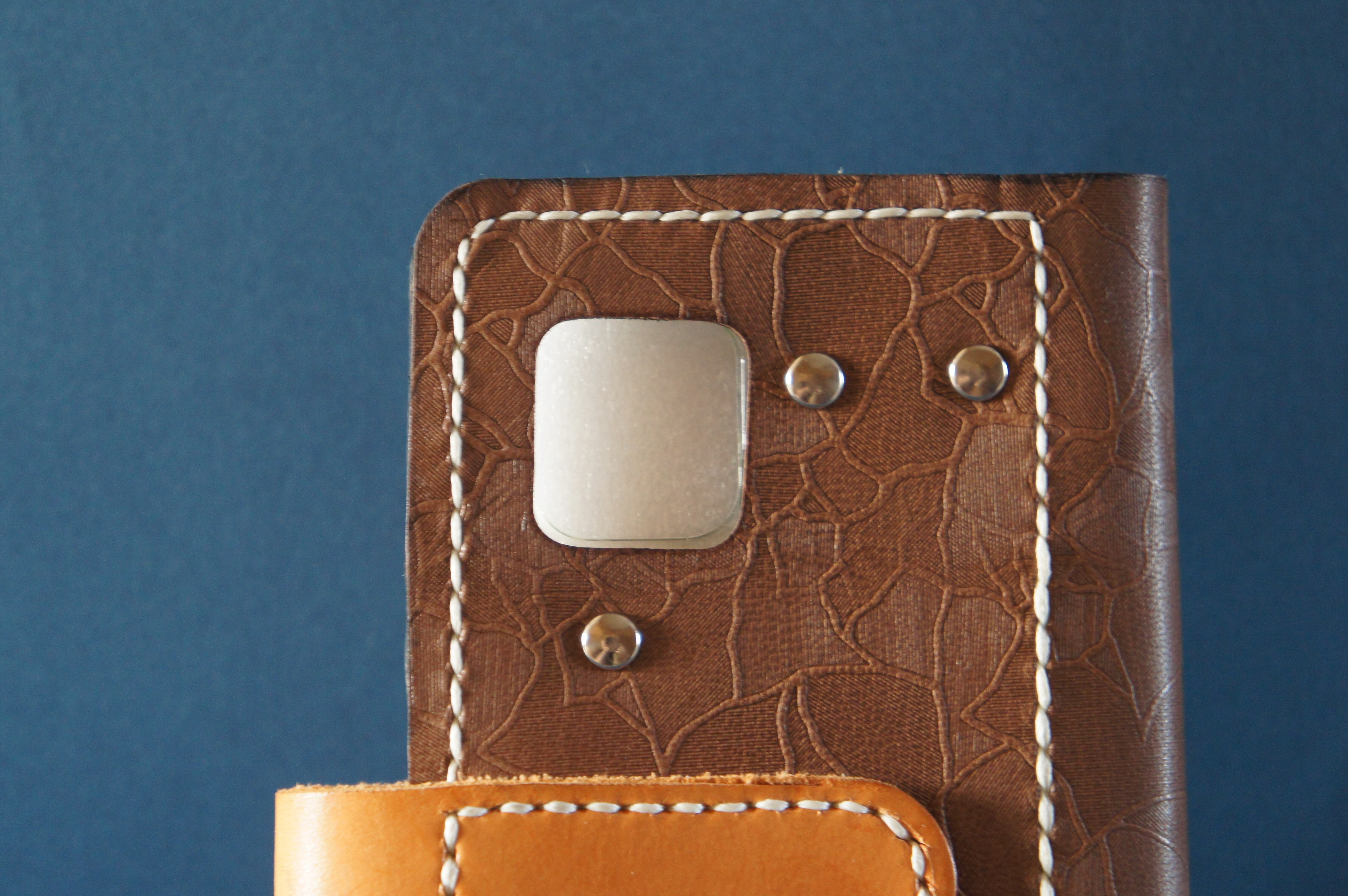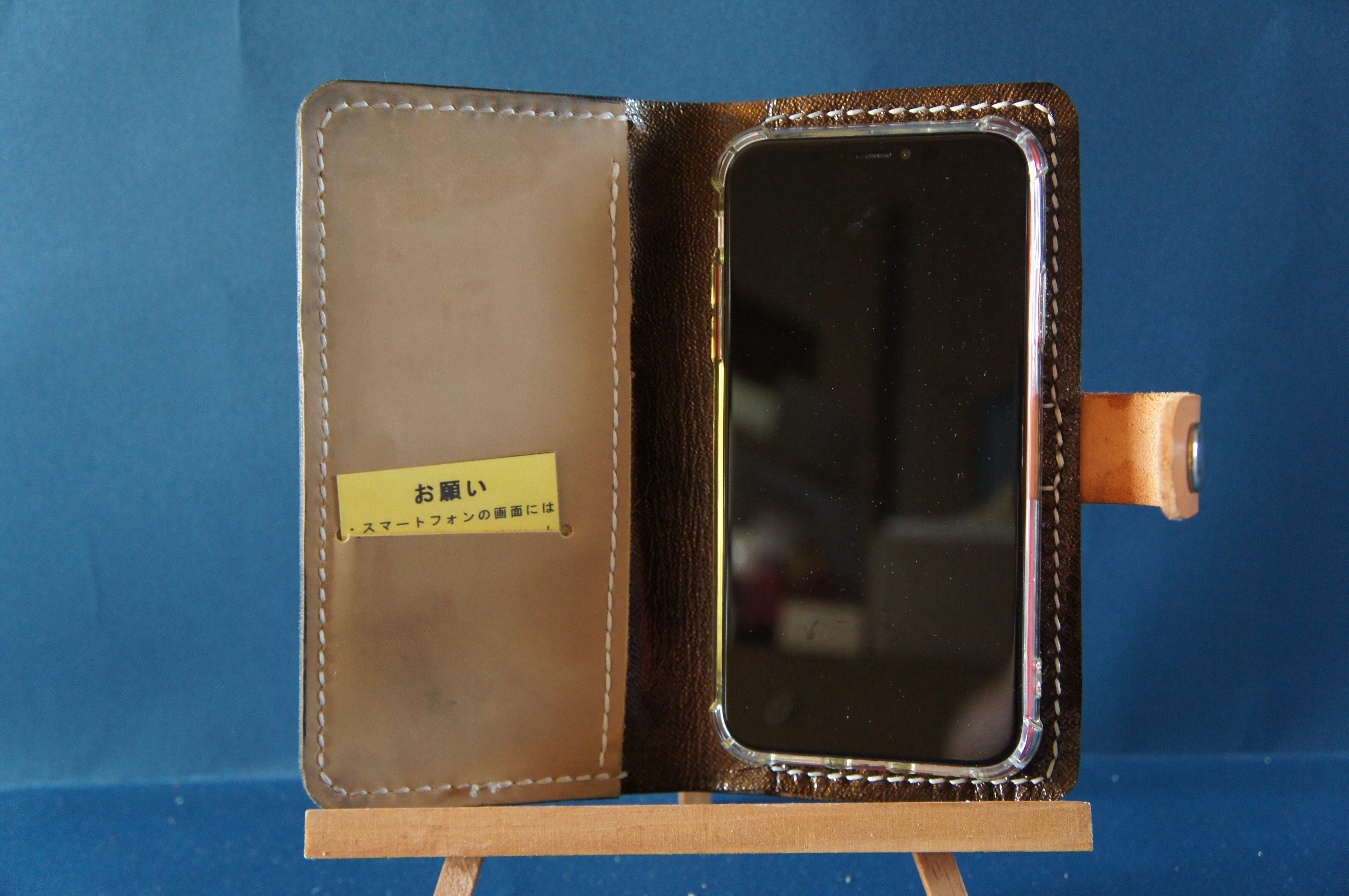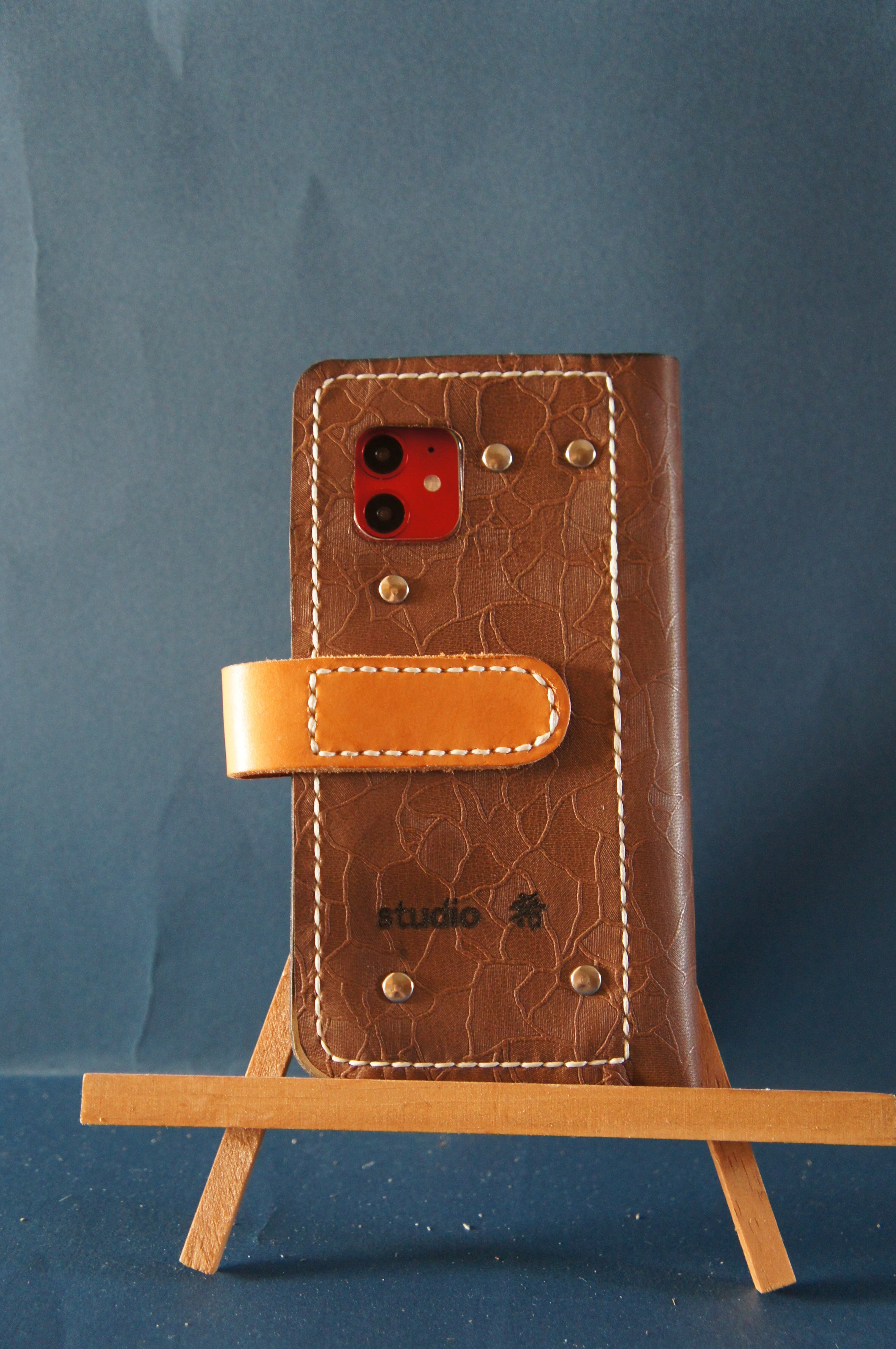 一点物です。iPhone11用の手帳型スマートフォンケースです。本体、内側、カードホルダー、ホルダー裏の合計4枚の革を縫い合わせています。太さ1番の白色の糸ですべて手縫いで仕上げています。2本の針で縫っていますので、ほつれにくい構造になっています。本体は1.5mmの厚さの和柄モザイク模様の茶色の牛革です。内側には厚さ0.8mmの水牛の革を使っています。カードホルダーが1つあります。カードホルダー部分の裏には収納スペースがあります。スマートフォンを固定する部分は、カシメ金具5個で固定してあります。バネホック、金具の色はシルバーです。カメラ穴部分を固くするためには皮革硬化剤を使用しています。貼り付け部分はつるつるになるまでトコフィニッシュなどを使って磨いています。
