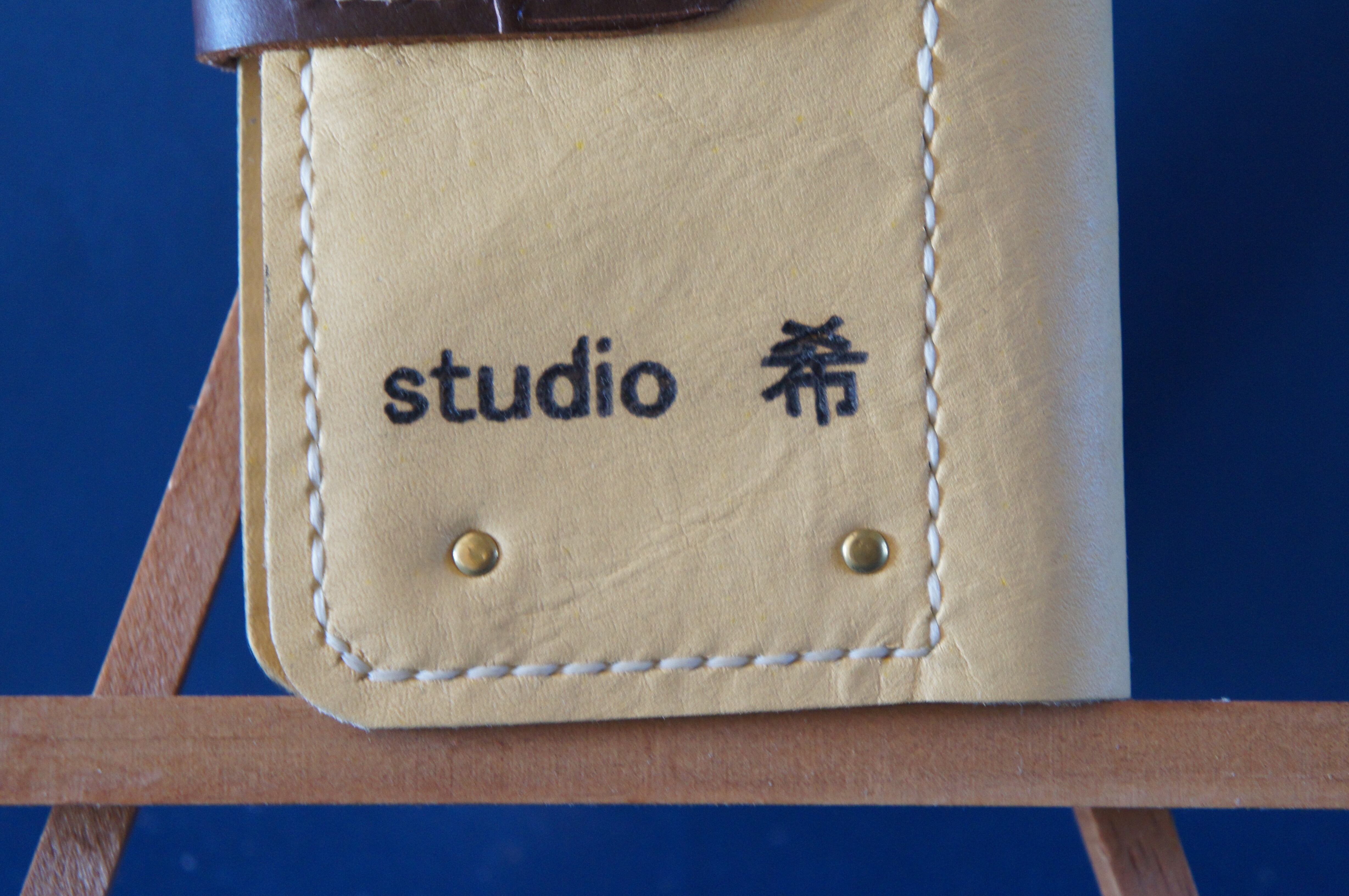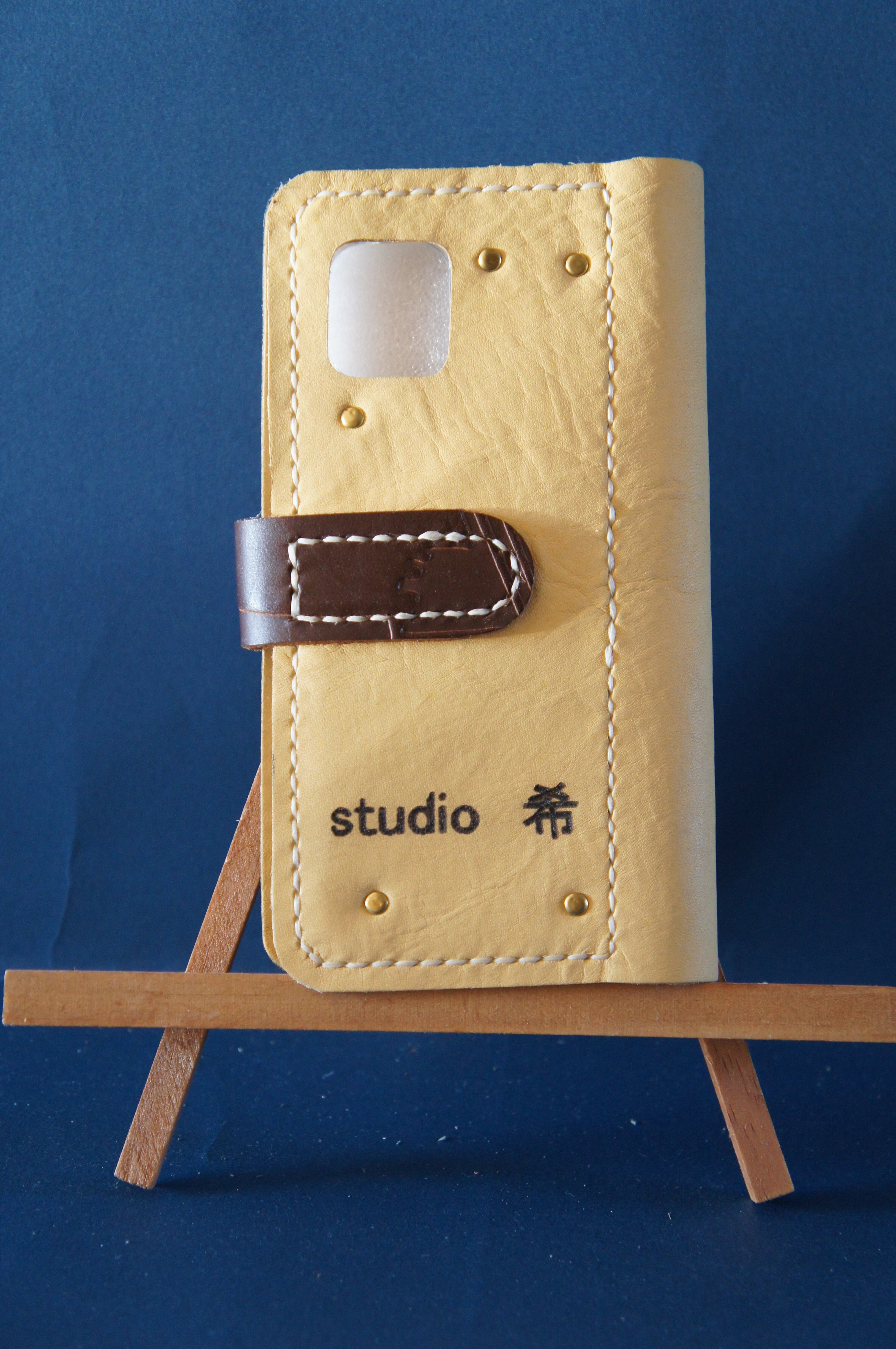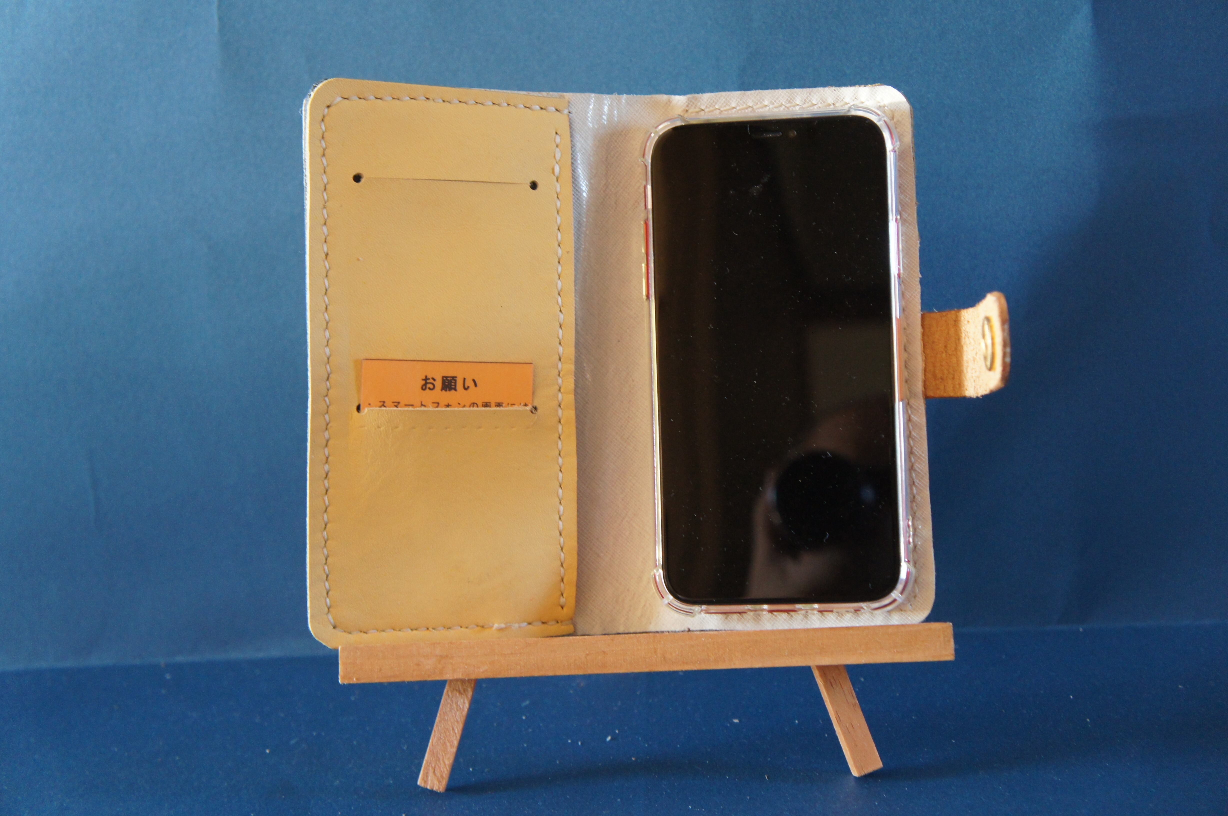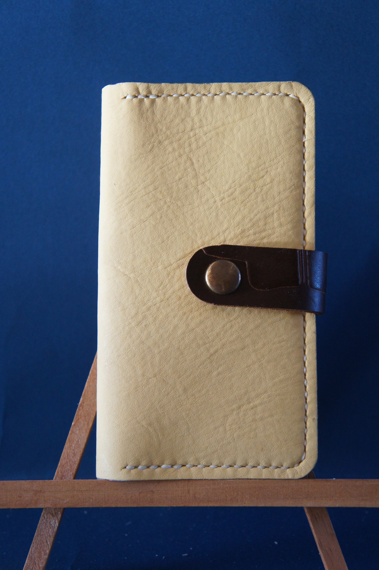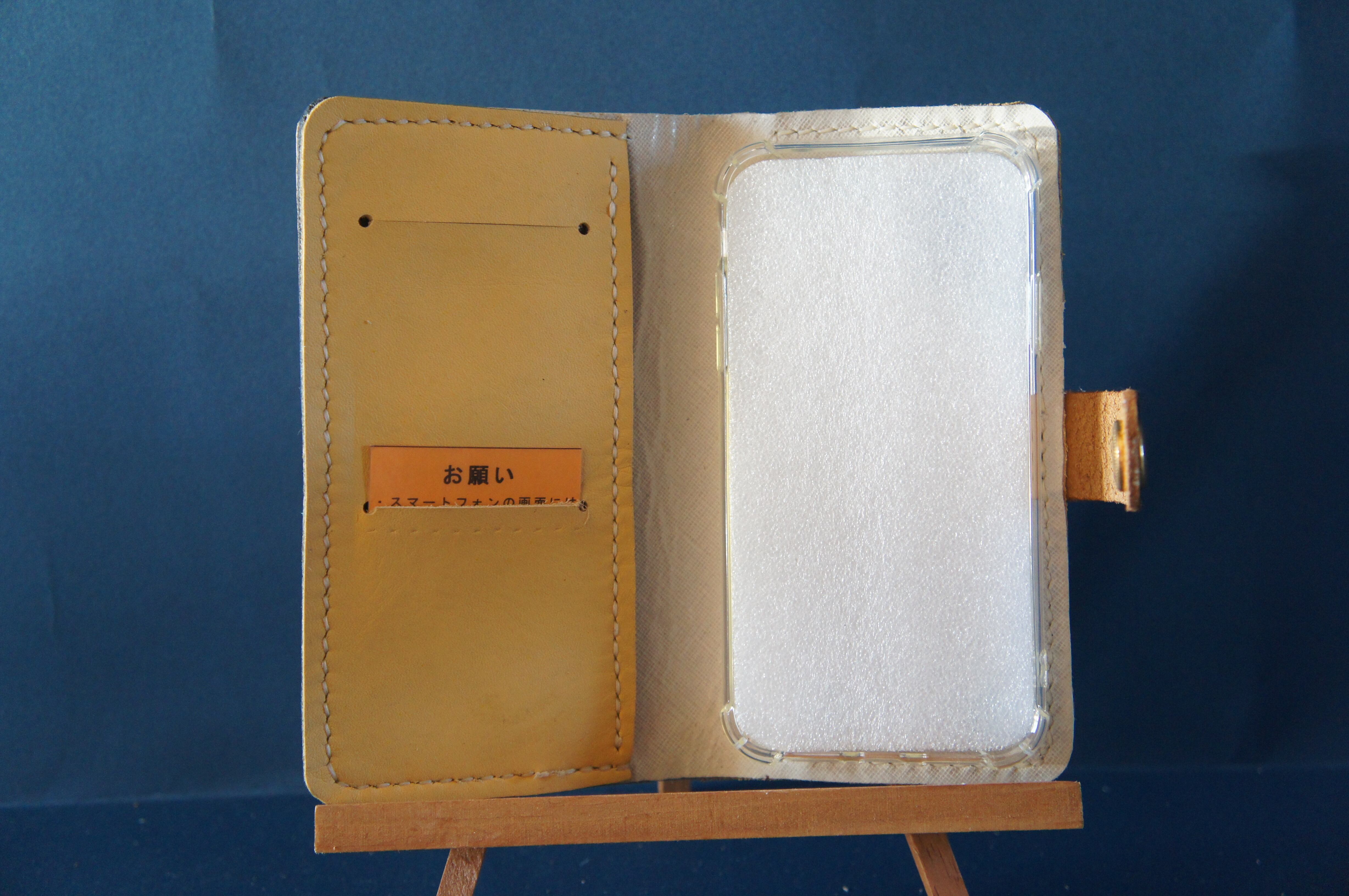 一点物です。iPhone11用の手帳型スマートフォンケースです。本体、内側、カードホルダー、ホルダー裏の合計4枚の革を縫い合わせています。太さ1番の白色の糸ですべて手縫いで仕上げています。2本の針で縫っていますので、ほつれにくい構造になっています。本体は1.5mmの厚さの黄土色の牛革です。内側には厚さ0.8mmの牛革を使っています。カードホルダーが2つあります。カードホルダー部分の裏には収納スペースがあります。スマートフォンを固定する部分は、カシメ金具5個で固定してあります。バネホック、金具の色は金色です。カメラ穴部分を固くするためには皮革硬化剤を使用しています。貼り付け部分はつるつるになるまでトコフィニッシュなどを使って磨いています。