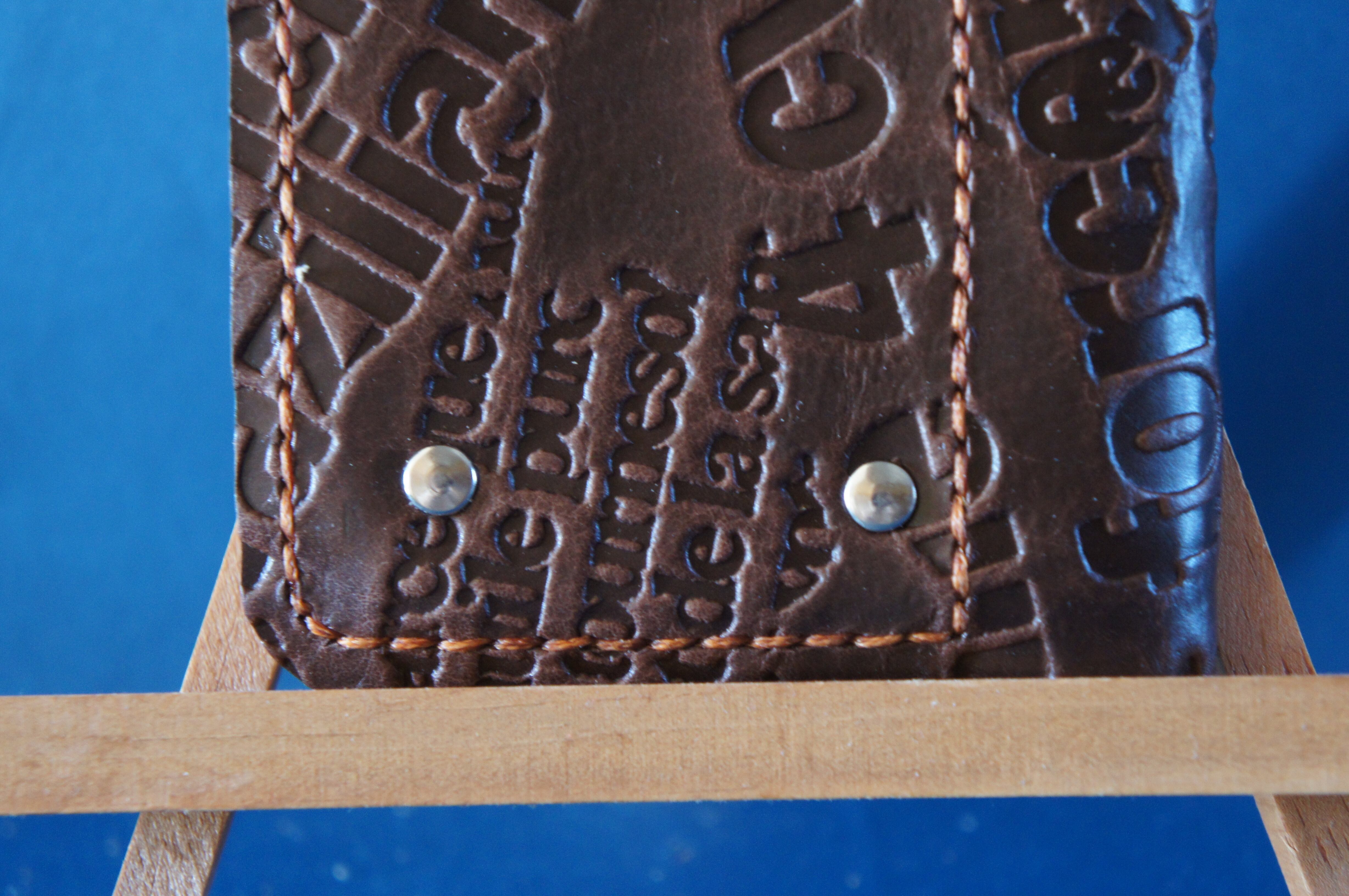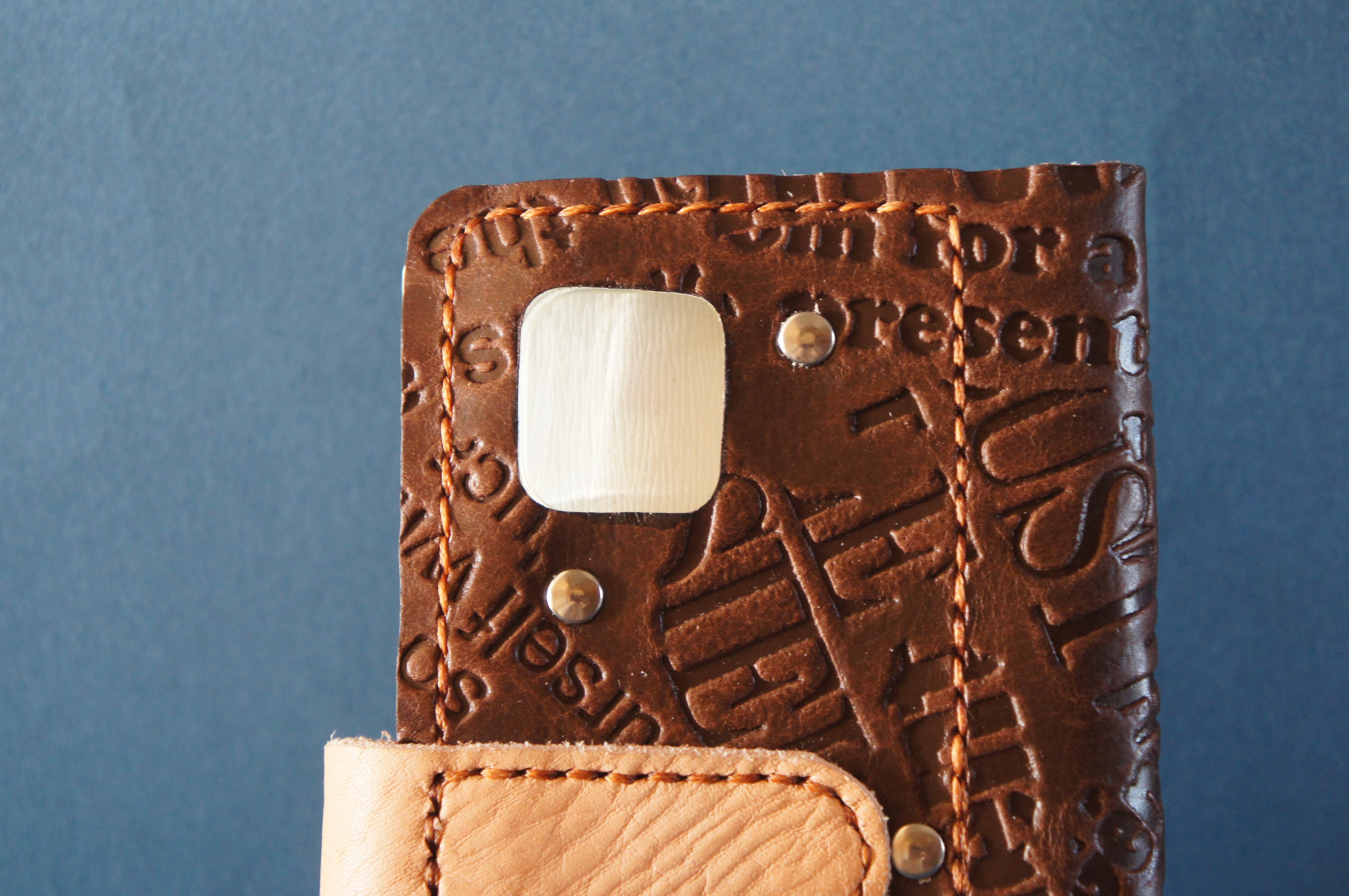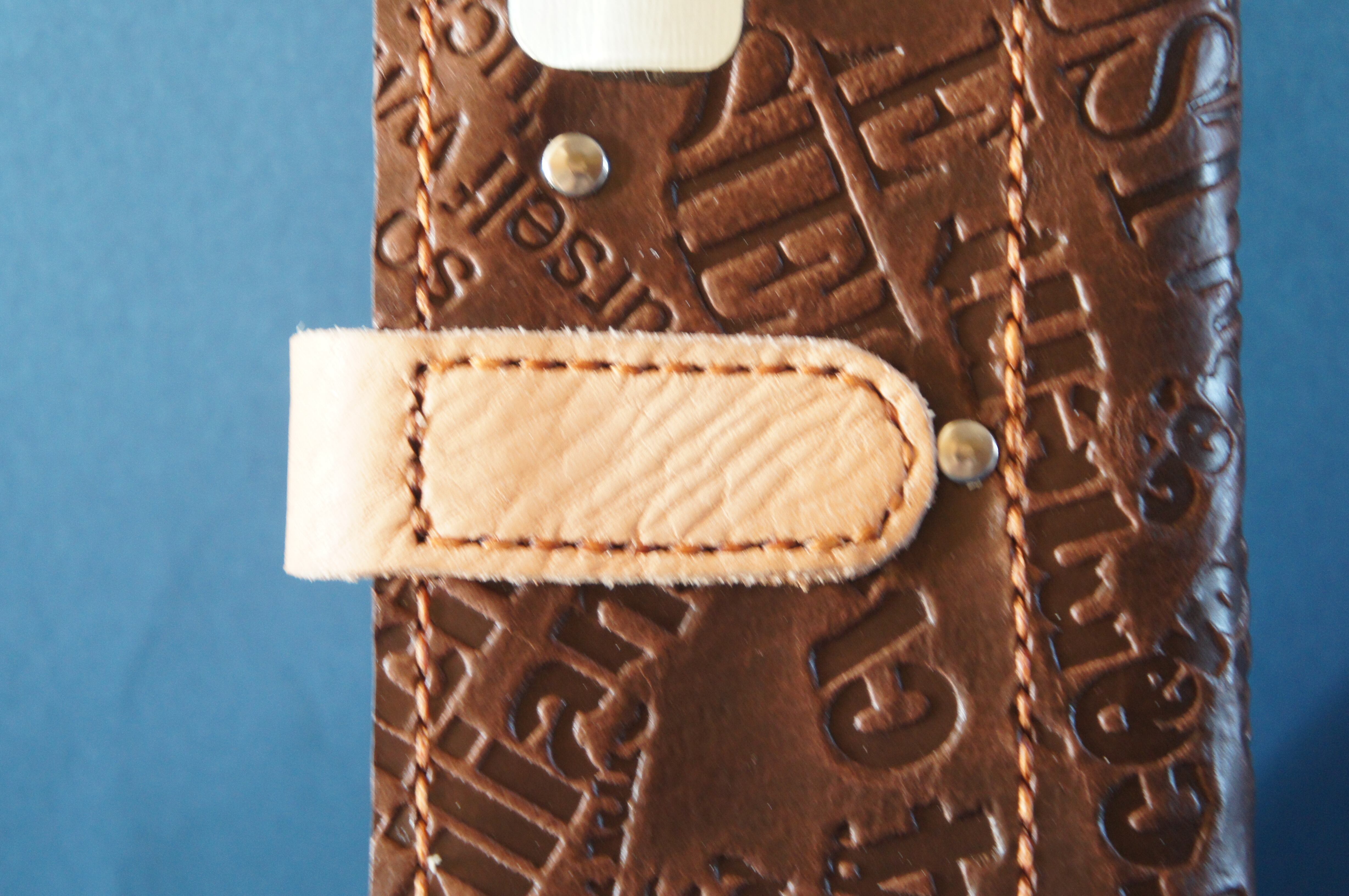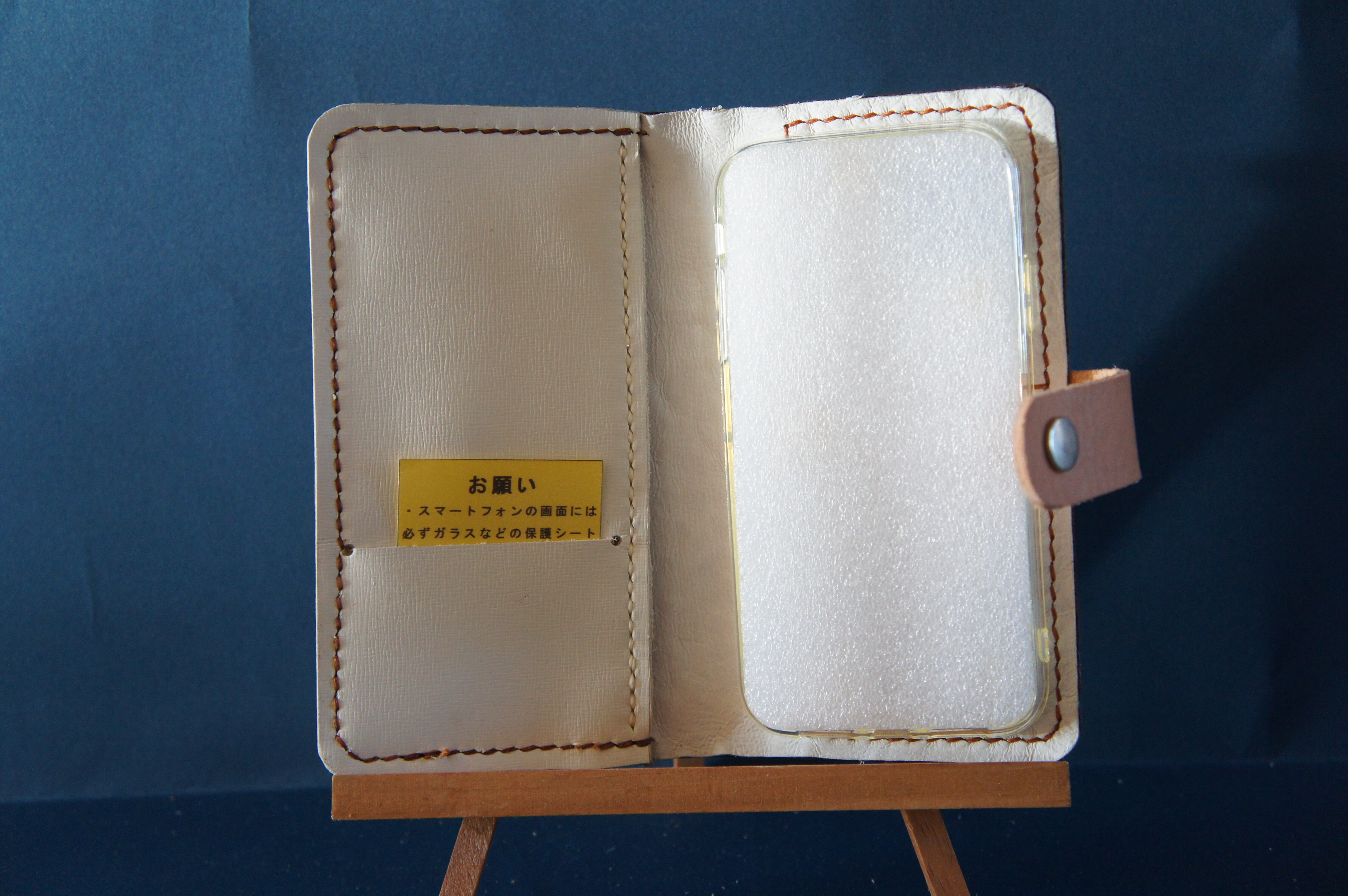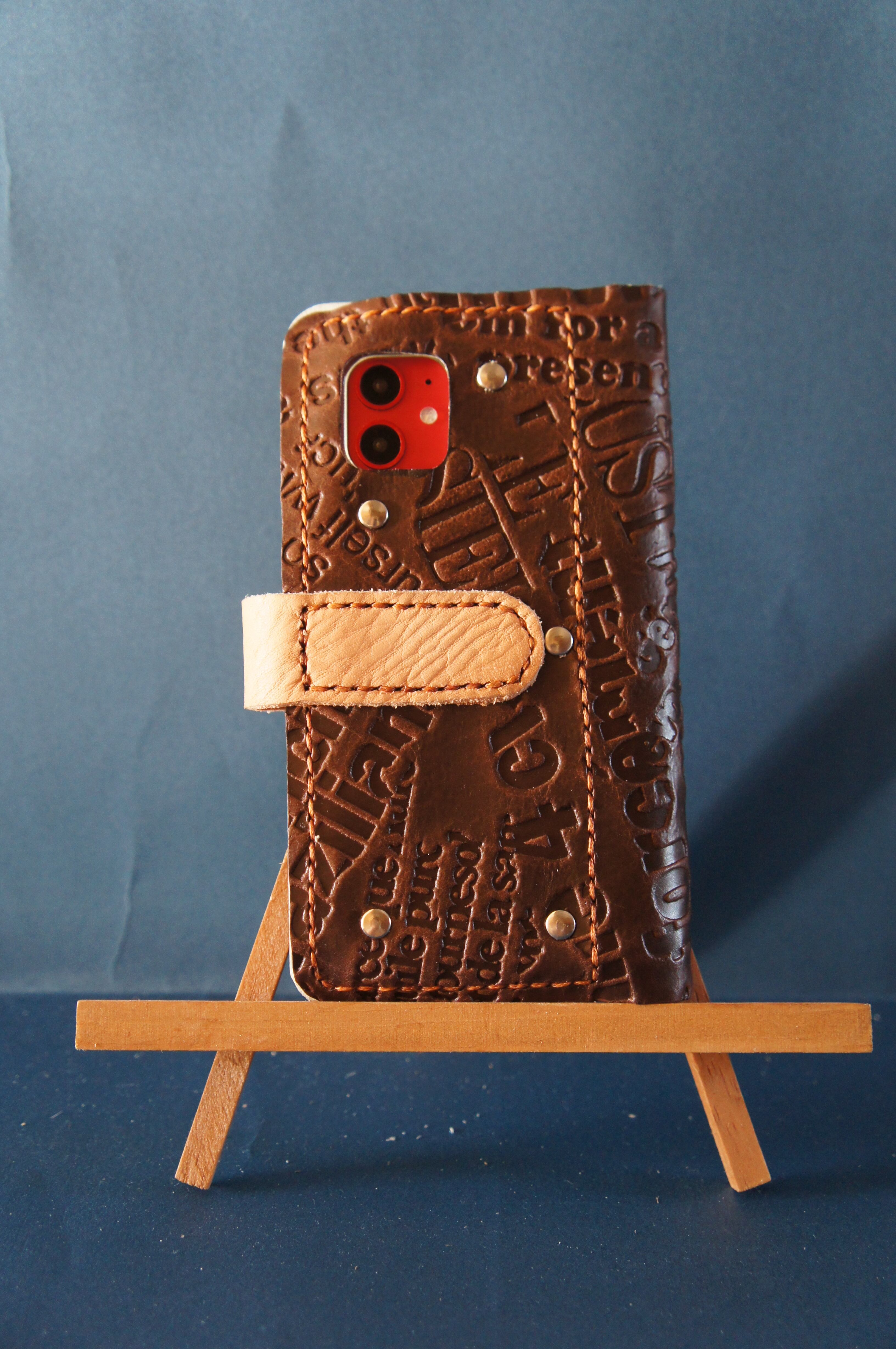 一点物です。iPhone11用の手帳型スマートフォンケースです。本体、内側、カードホルダー、ホルダー裏の合計4枚の革を縫い合わせています。太さ1番の茶色の糸ですべて手縫いで仕上げています。2本の針で縫っていますので、ほつれにくい構造になっています。本体は1.5mmの厚さの英文字型押しの茶色の牛革です。内側には厚さ0.8mmの牛革を使っています。カードホルダーが1つあります。カードホルダー部分の裏には収納スペースがあります。スマートフォンを固定する部分は、カシメ金具5個で固定してあります。バネホック、金具の色は銀色です。カメラ穴部分を固くするためには皮革硬化剤を使用しています。貼り付け部分はつるつるになるまでトコフィニッシュなどを使って磨いています。