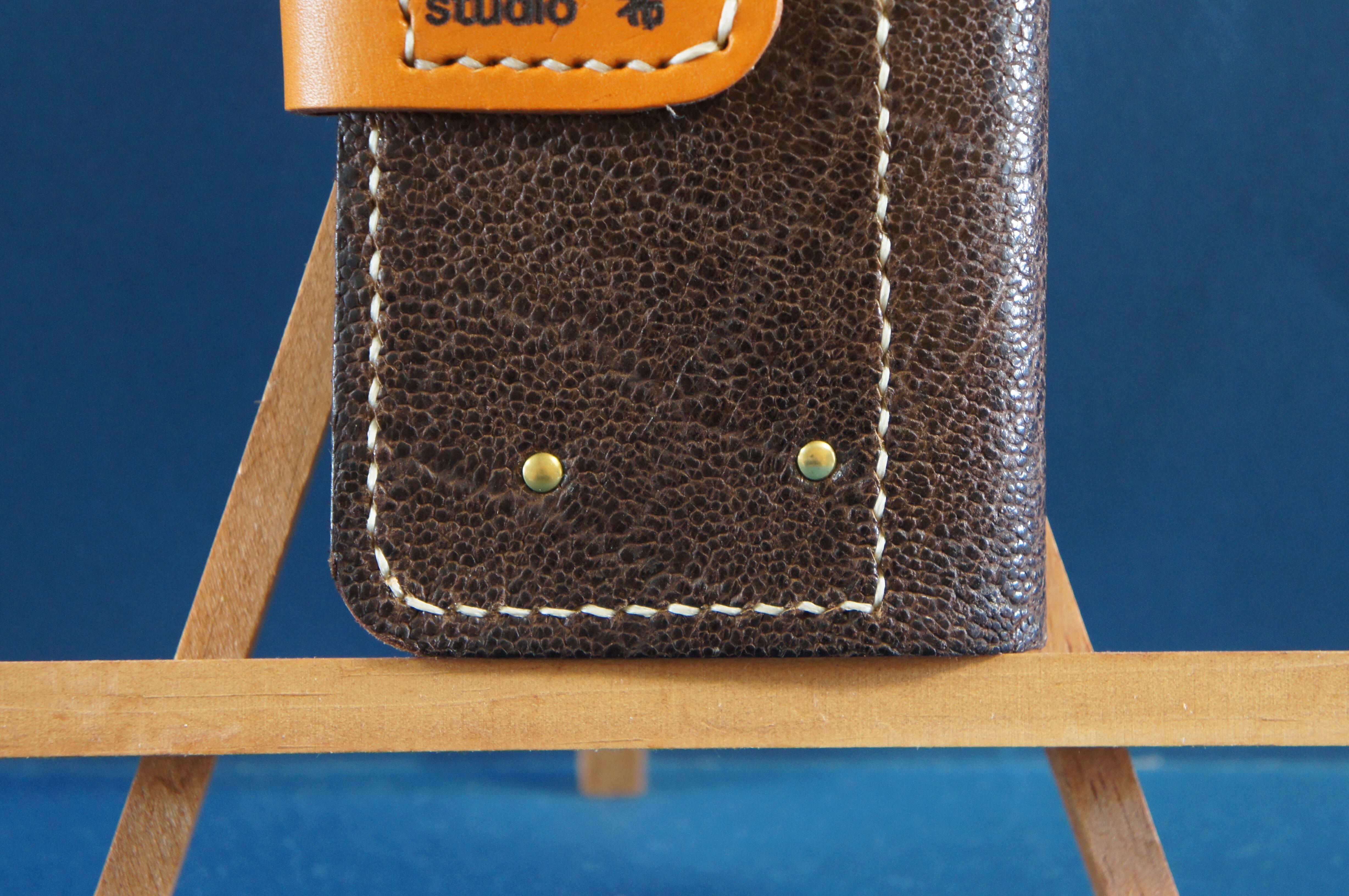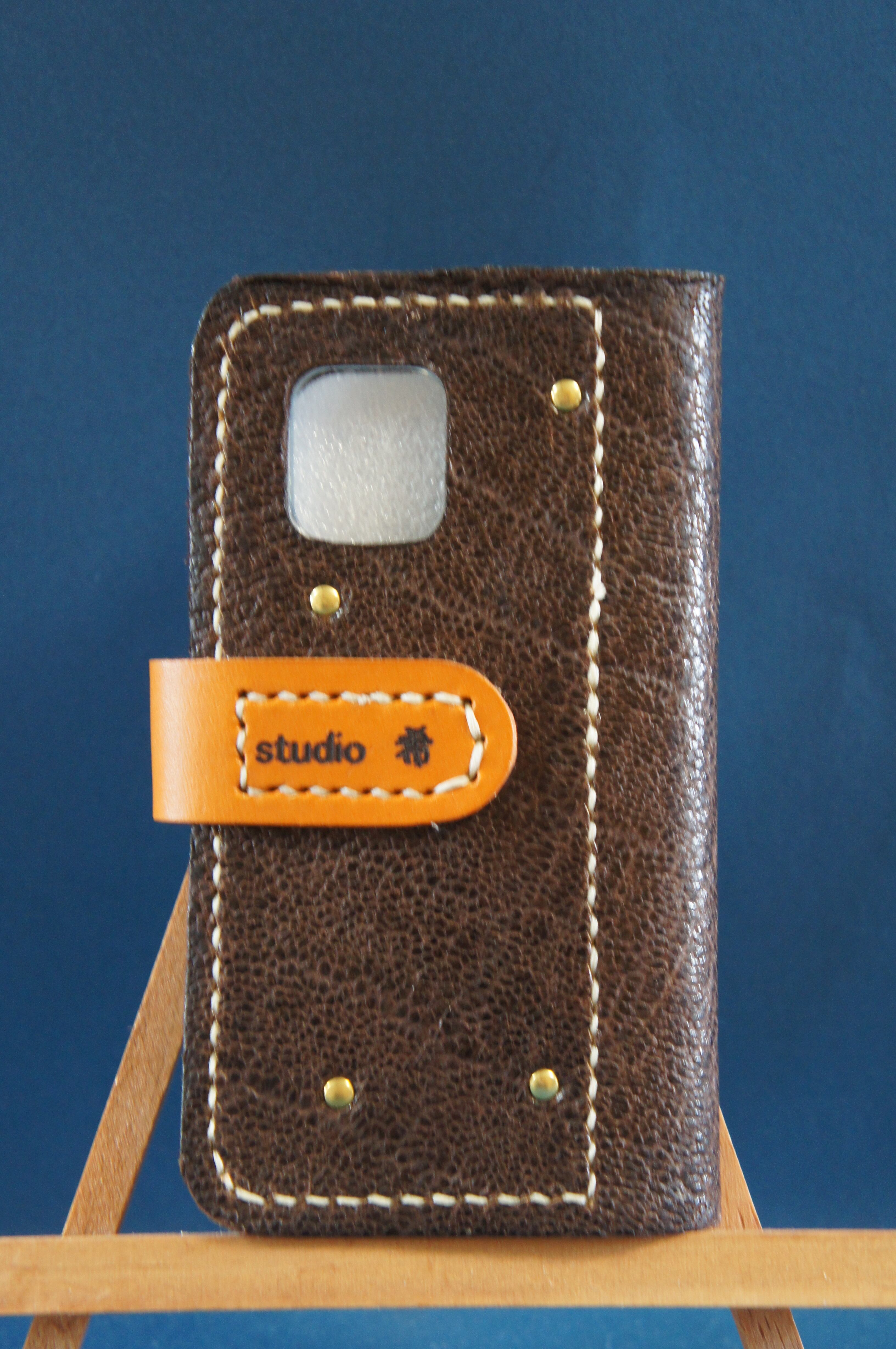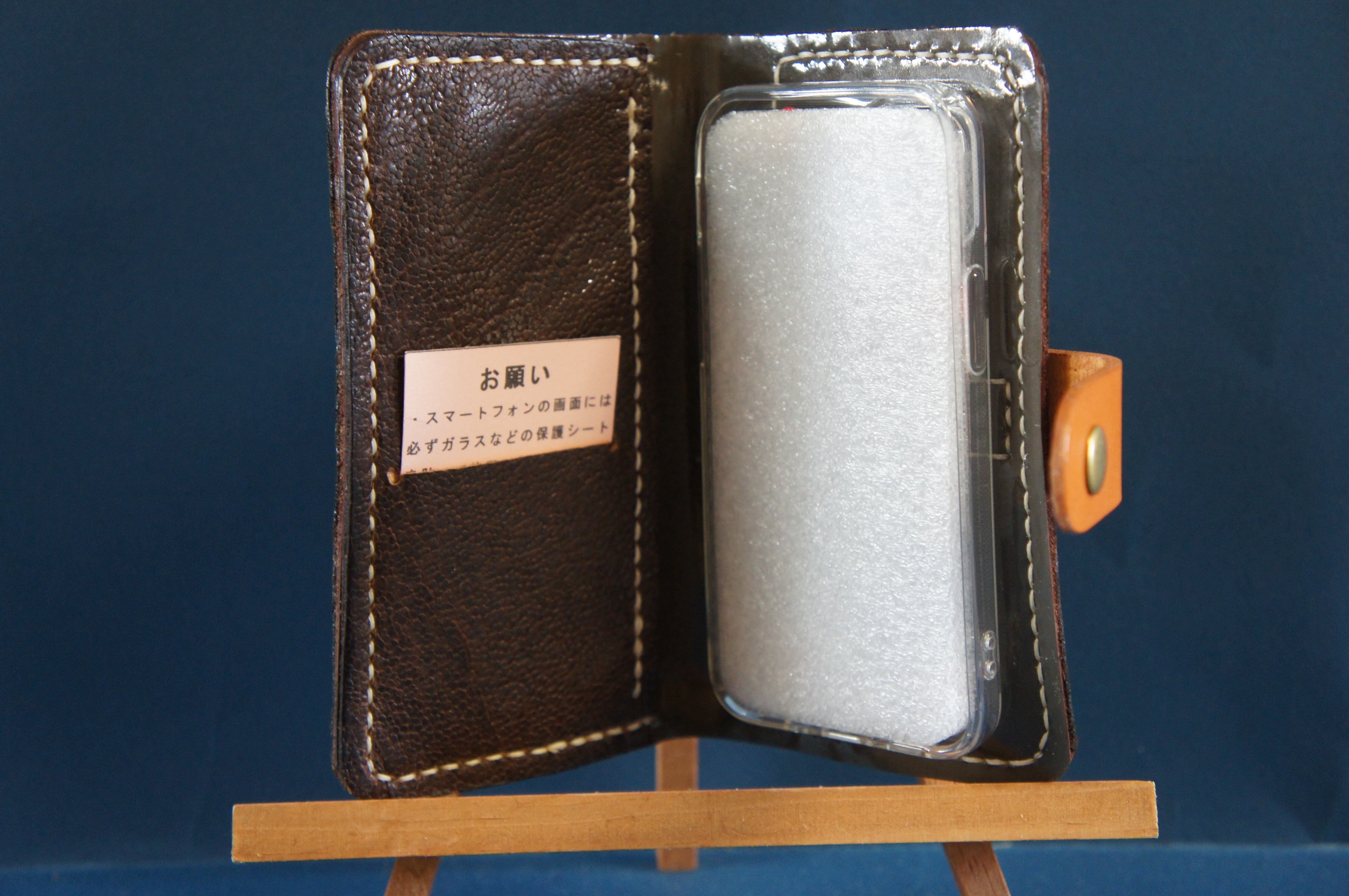 日和山クラフト・アートフェア出店記念で製作した一点物です。頑丈なiPhone12mini用の手帳型スマートフォンケースです。本体、内側、カードホルダー、ホルダー裏の合計4枚の革を縫い合わせています。太さ1番の白色の糸ですべて手縫いで仕上げています。2本の針で縫っていますので、ほつれにくい構造になっています。本体は2.0mmの厚さの象型押しの豚革です。内側には厚さ0.8mmのアメ豚革を使っています。カードホルダーが1つあります。カードホルダー部分の裏には収納スペースがあります。スマートフォンを固定する部分は、カシメ金具4個で固定してあります。バネホック、金具の色は銅色です。カメラ穴部分を固くするためには皮革硬化剤を使用しています。貼り付け部分はつるつるになるまでトコフィニッシュなどを使って磨いています。