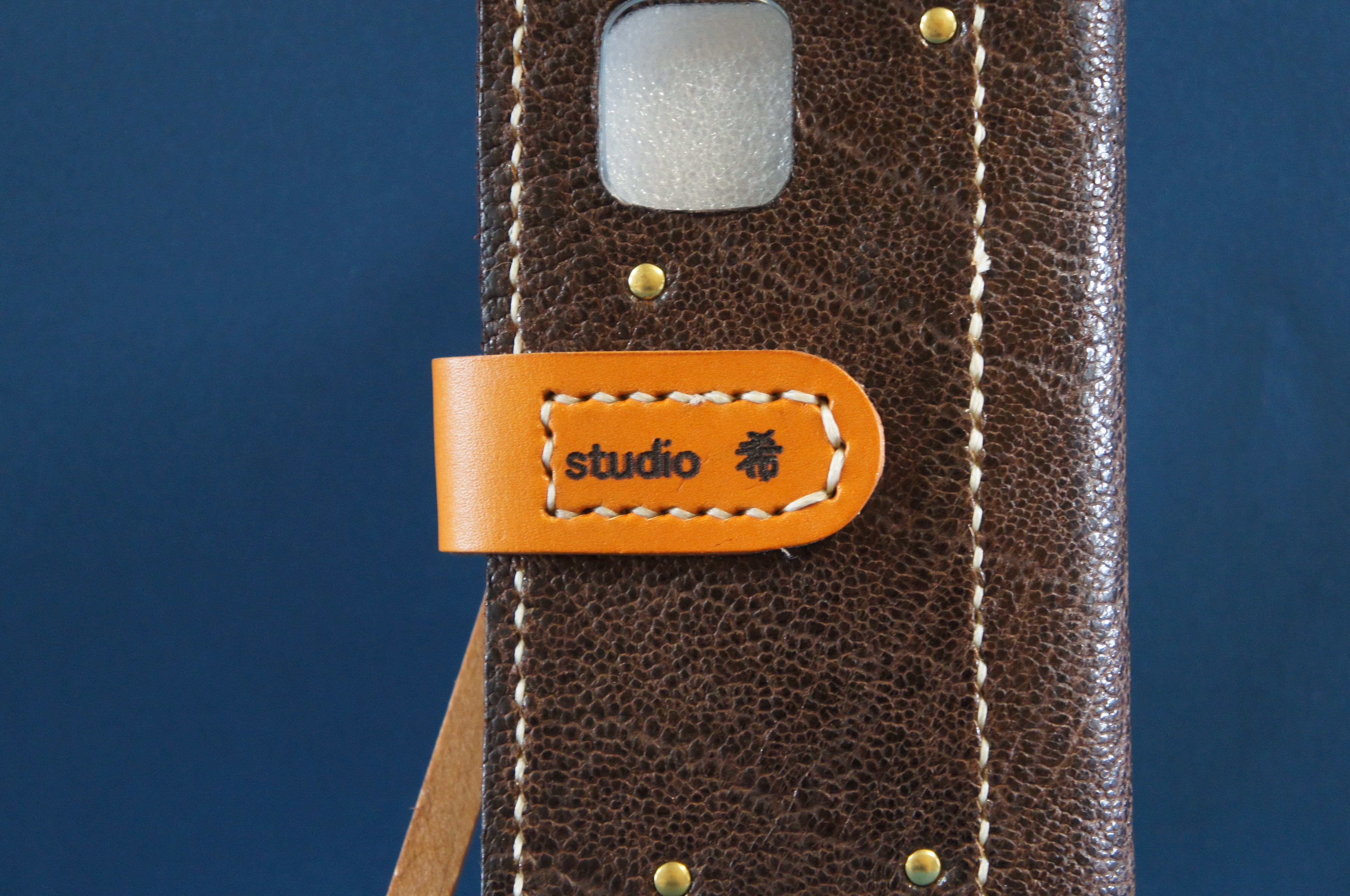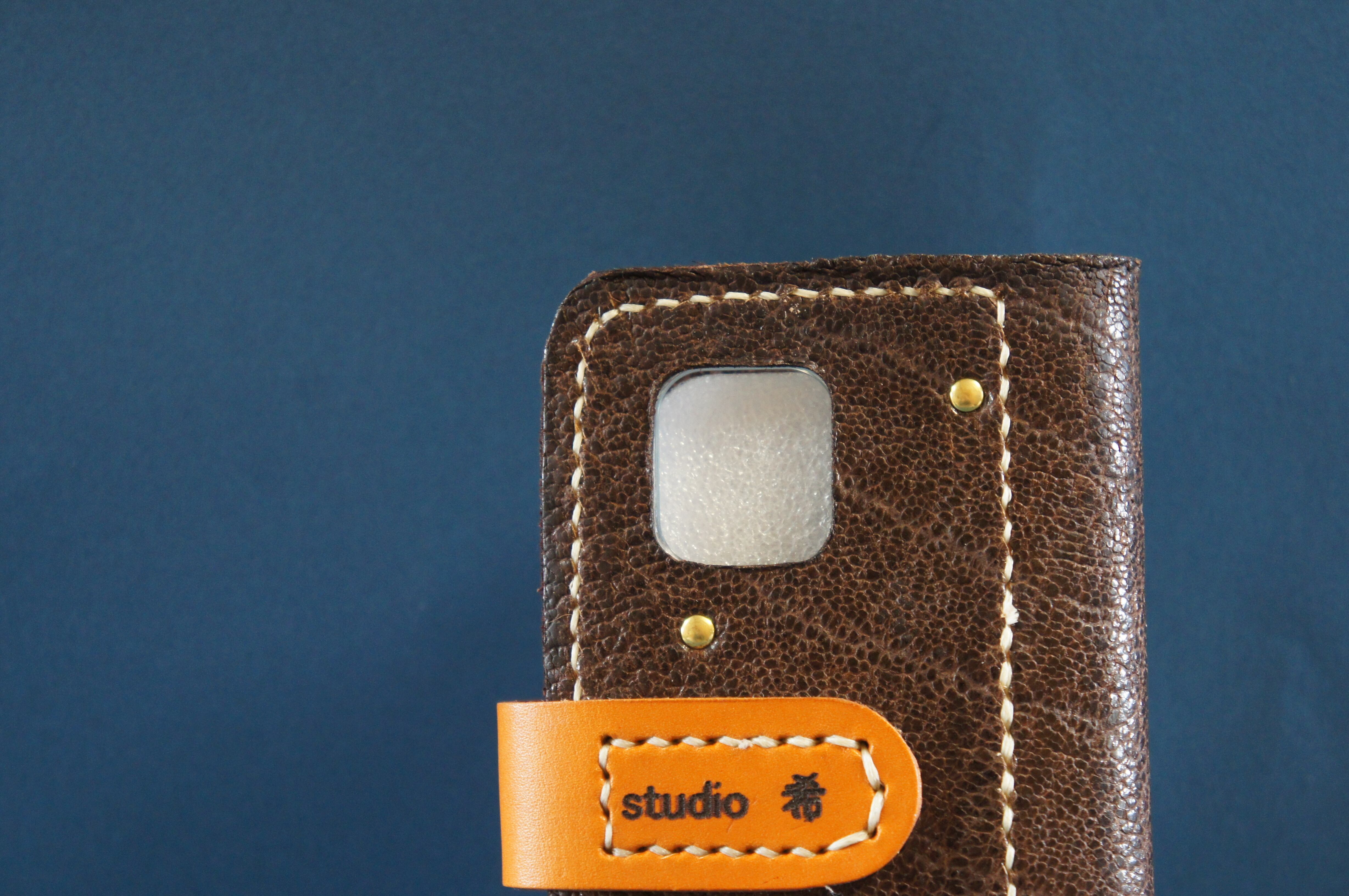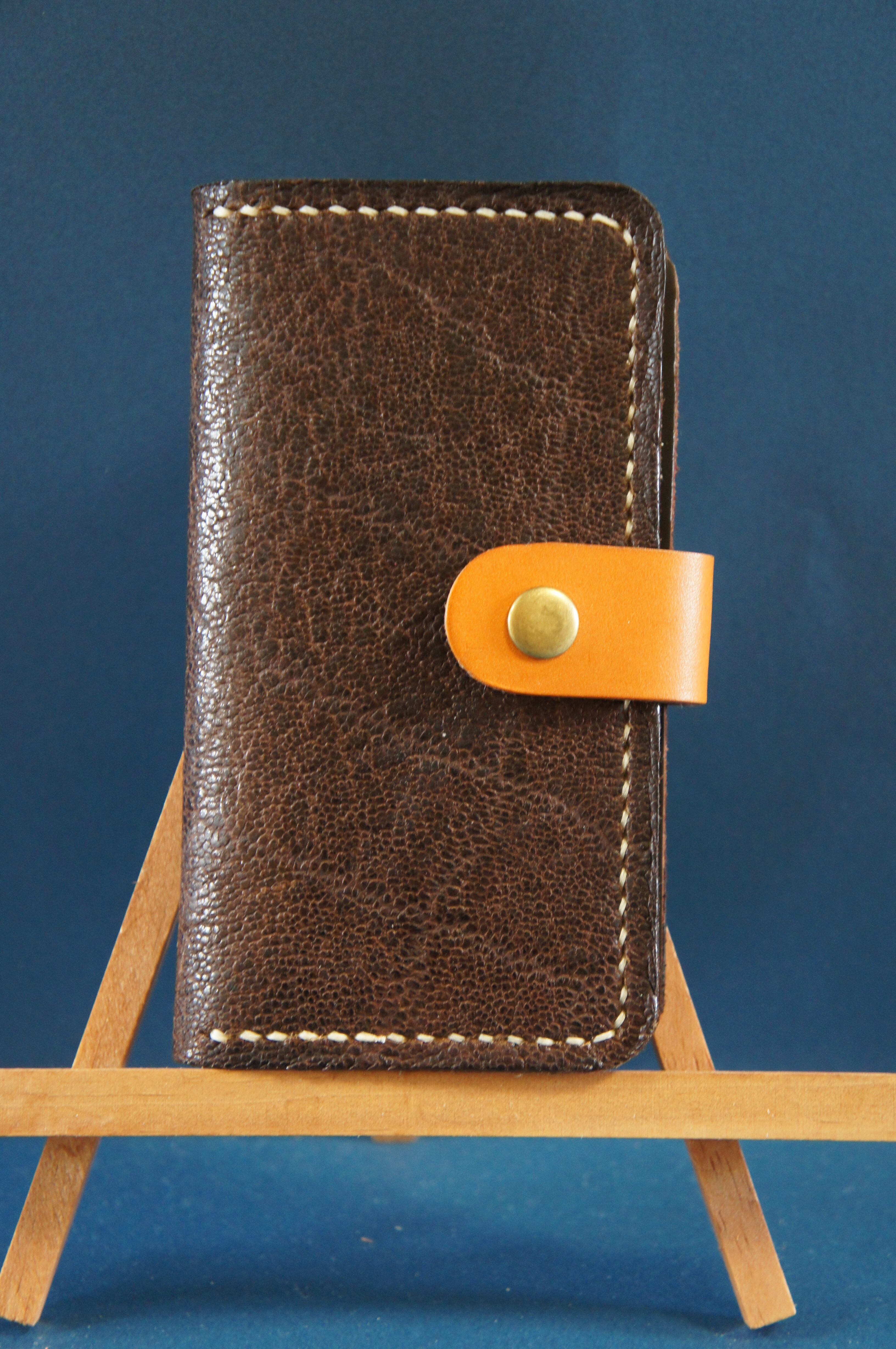 日和山クラフト・アートフェア出店記念で製作した一点物です。頑丈なiPhone12mini用の手帳型スマートフォンケースです。本体、内側、カードホルダー、ホルダー裏の合計4枚の革を縫い合わせています。太さ1番の白色の糸ですべて手縫いで仕上げています。2本の針で縫っていますので、ほつれにくい構造になっています。本体は2.0mmの厚さの象型押しの豚革です。内側には厚さ0.8mmのアメ豚革を使っています。カードホルダーが1つあります。カードホルダー部分の裏には収納スペースがあります。スマートフォンを固定する部分は、カシメ金具4個で固定してあります。バネホック、金具の色は銅色です。カメラ穴部分を固くするためには皮革硬化剤を使用しています。貼り付け部分はつるつるになるまでトコフィニッシュなどを使って磨いています。