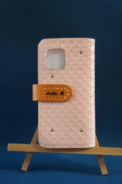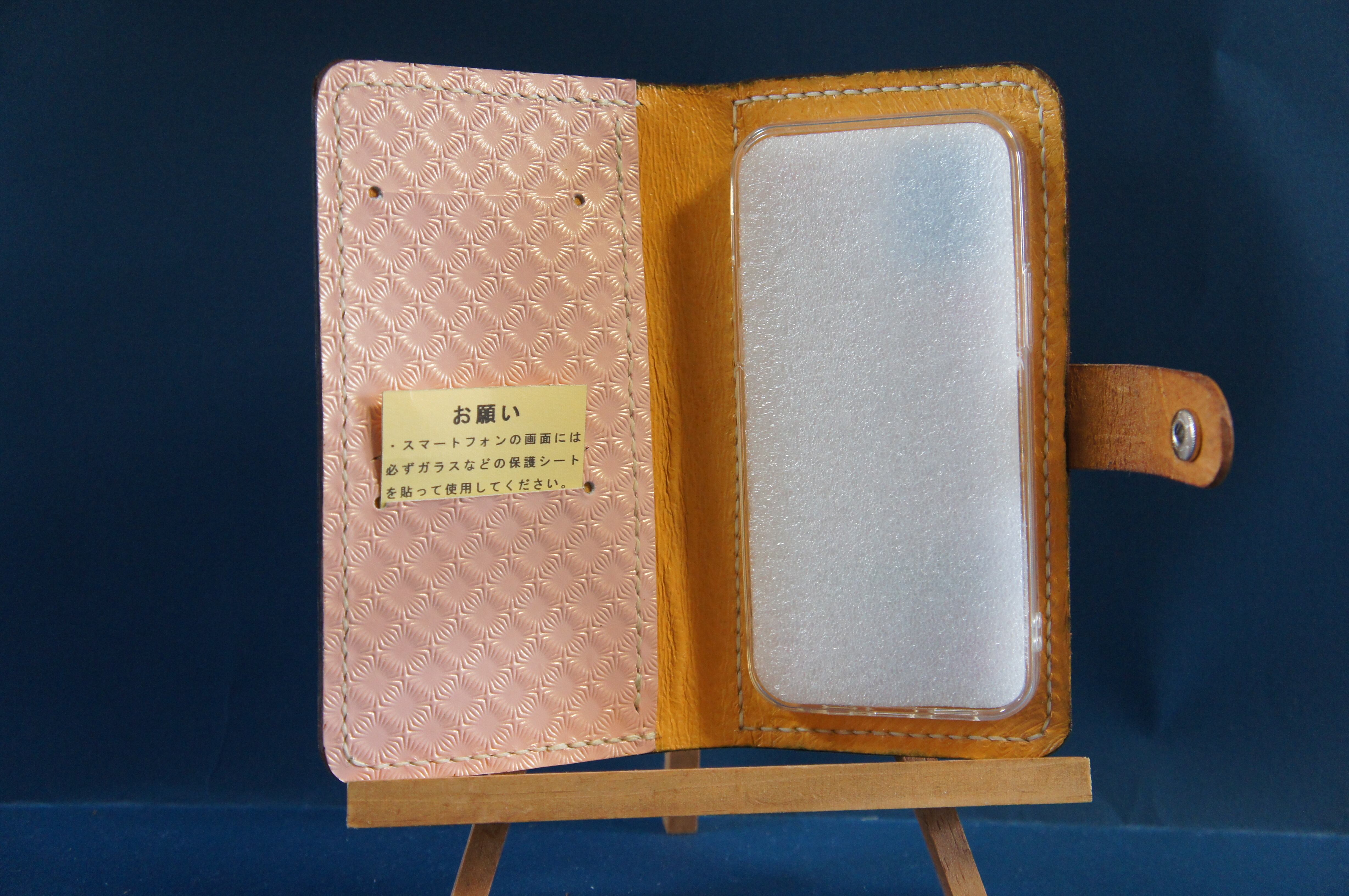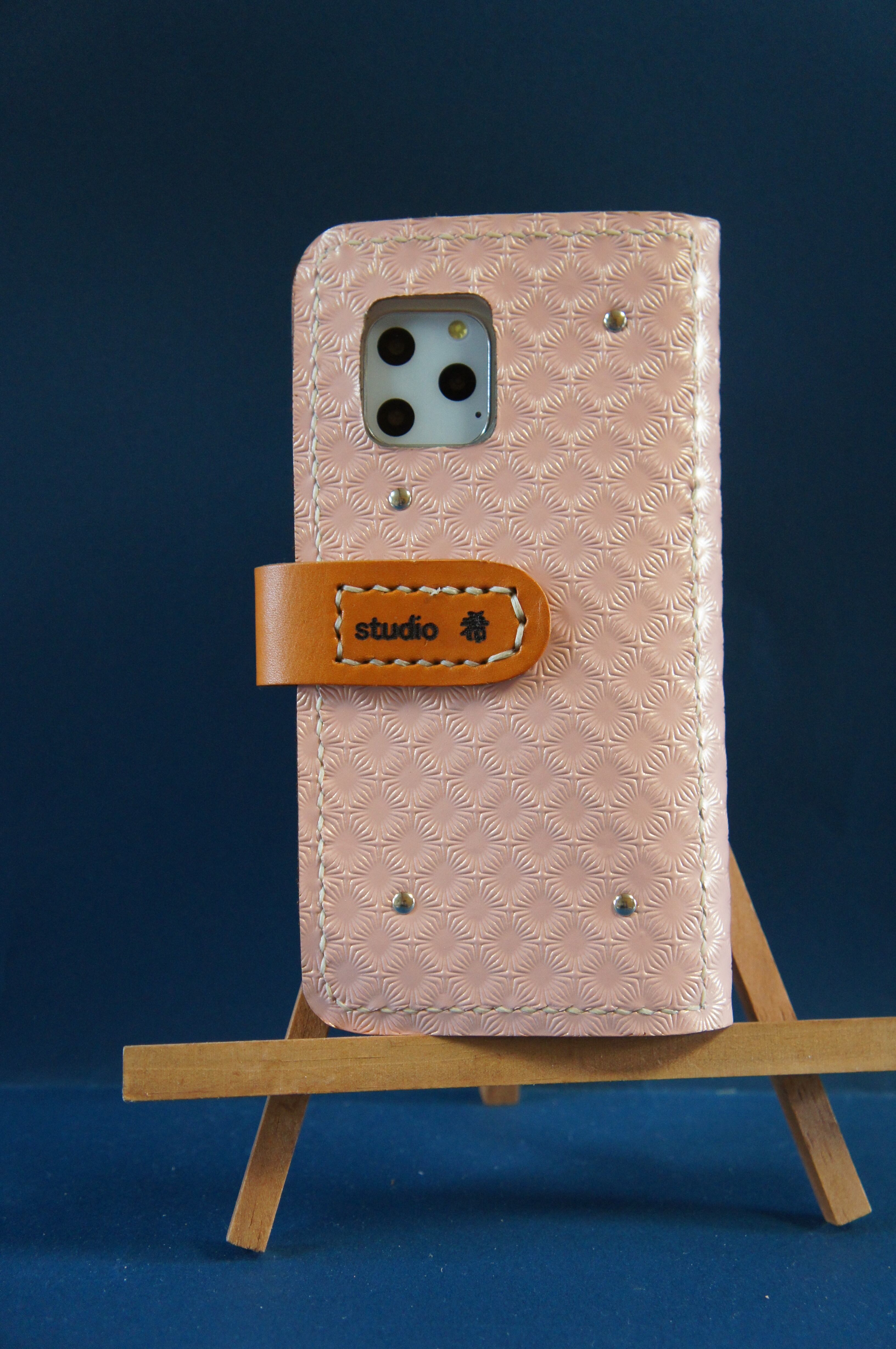 日和山クラフト・アートフェア出店記念で製作した一点物です。iPhone12Pro用の手帳型スマートフォンケースです。本体、内側、カードホルダー、ホルダー裏の合計4枚の革を縫い合わせています。太さ1番の白色の糸ですべて手縫いで仕上げています。2本の針で縫っていますので、ほつれにくい構造になっています。本体は張りのある1.5mmの厚さの和柄メタリックピンクの牛革です。内側には厚さ0.8mmのアメ豚革を使っています。カードホルダーが1つあります。カードホルダー部分の裏には収納スペースがあります。スマートフォンを固定する部分は、カシメ金具4個で固定してあります。バネホック、金具の色はシルバーです。カメラ穴部分を固くするためには皮革硬化剤を使用しています。貼り付け部分は黒く染色しています。貼り付け部分はつるつるになるまでトコフィニッシュなどを使って磨いています。