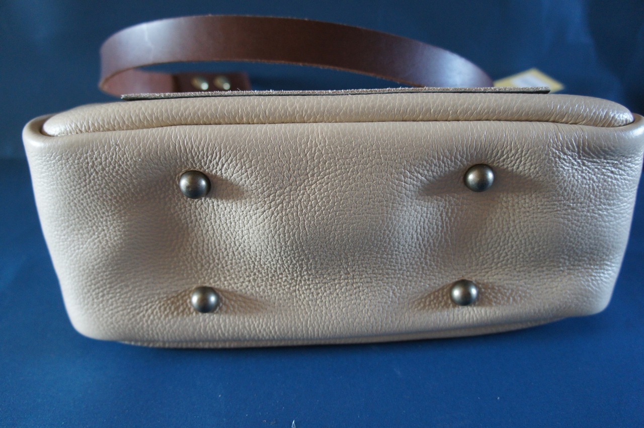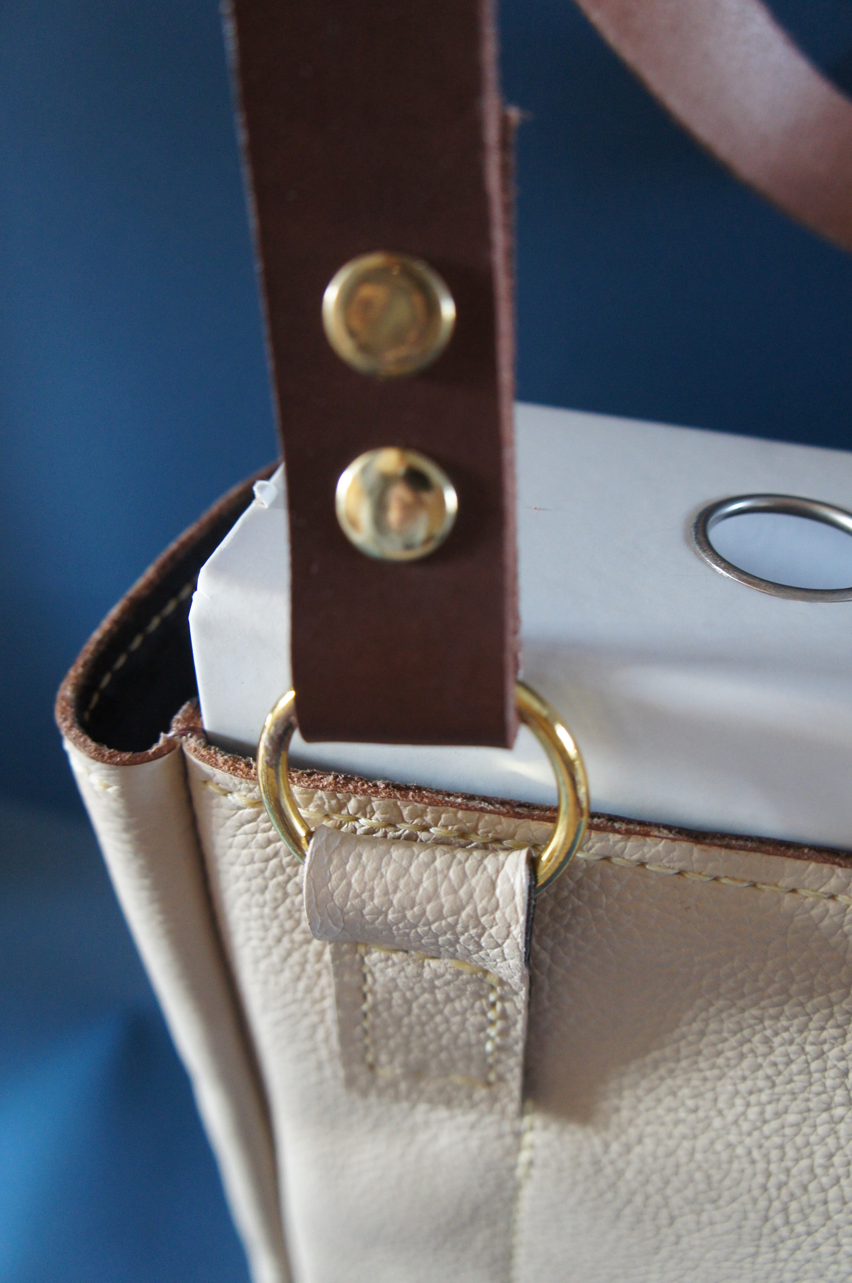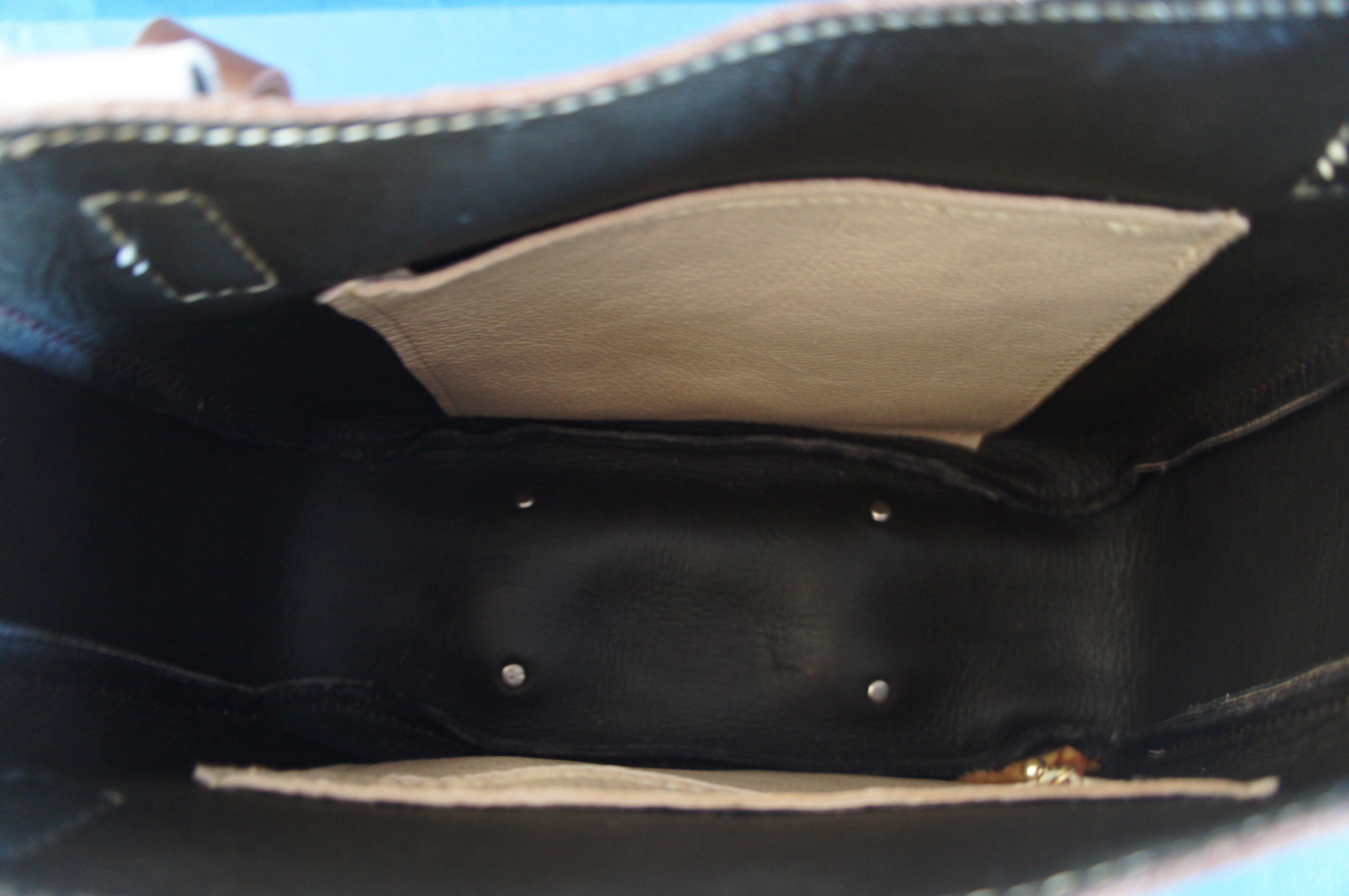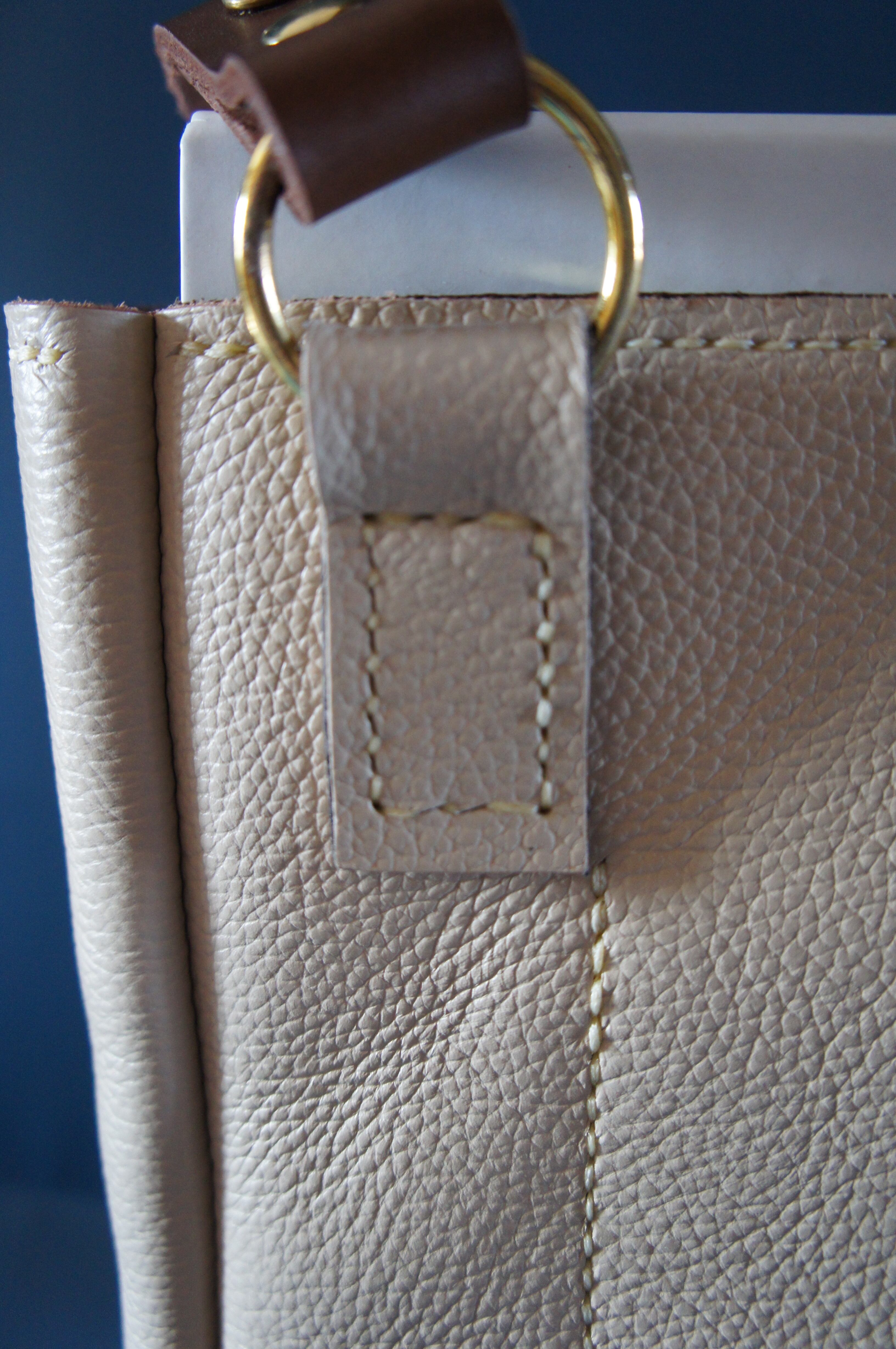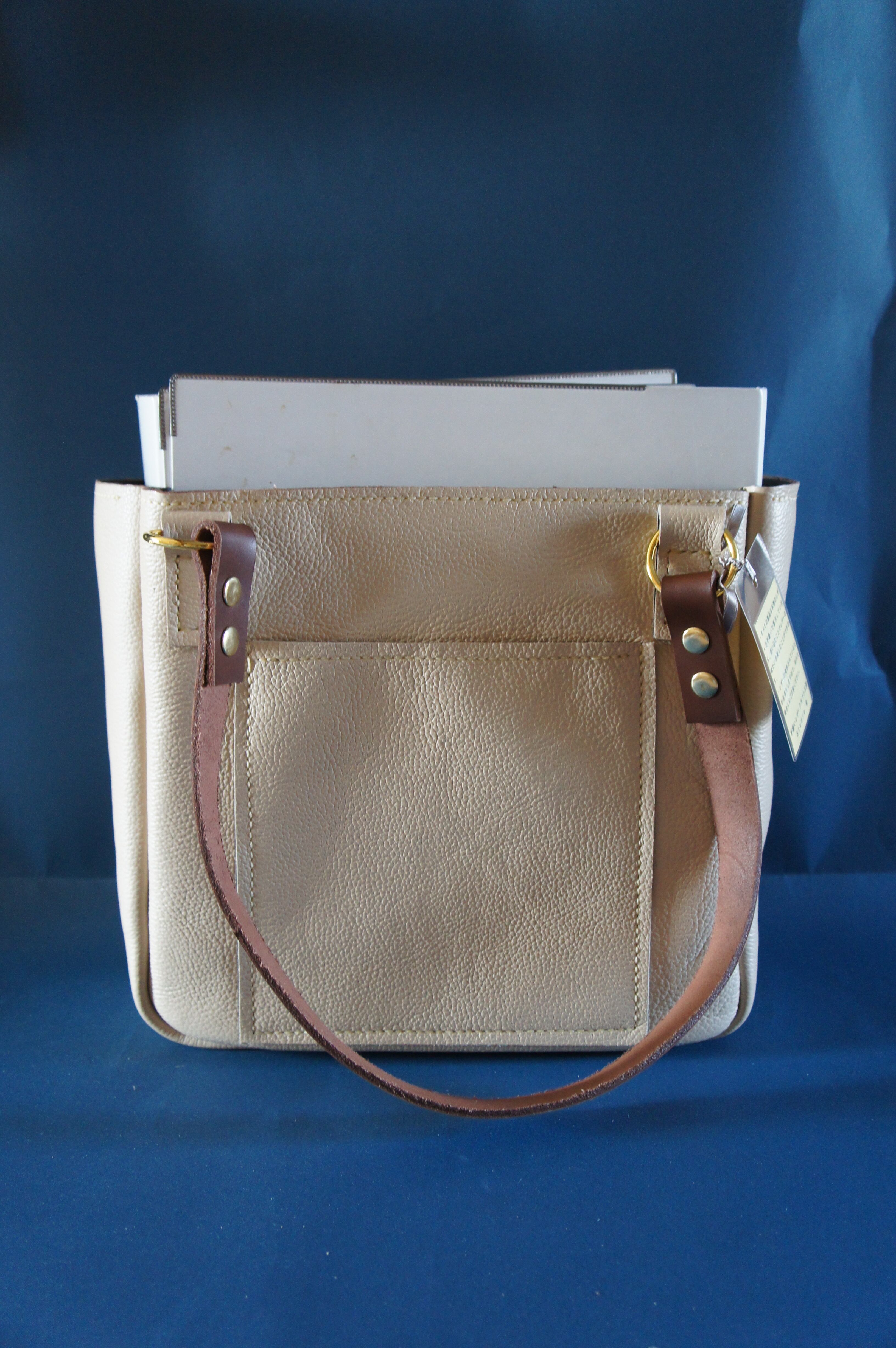 現品限り一点物です。女性ビジネス向けのトートバックです。サイズは縦30cm、横30cm、幅11cm、持ち手は50cmです。大きさは1枚目から5枚目の写真を参考にしてください。(大型のA4ファイルが2個入ります。)収納力は抜群です。重さは約650gです。太さ1番のクリーム色の糸ですべて手縫いで仕上げています。2本の針で縫っていますので、ほつれにくい構造になっています。本体は2.0mmの厚さのクリーム色のシュリンクの牛革です。内側には厚さ0.5mmの牛革を張っています。全体が2枚の革を張り合わせた構造のため、通常の2倍以上の強度があります。内部には大きめのポケットが1つとファスナー付きのポケットが1つあります。外にはポケットが1つあります。底には底鋲が4つあります。持ち手は、切れることのない厚さ3.0mmのヌメ革をしようしています。縫い合わせた部分は、コバコートでツルツルです。