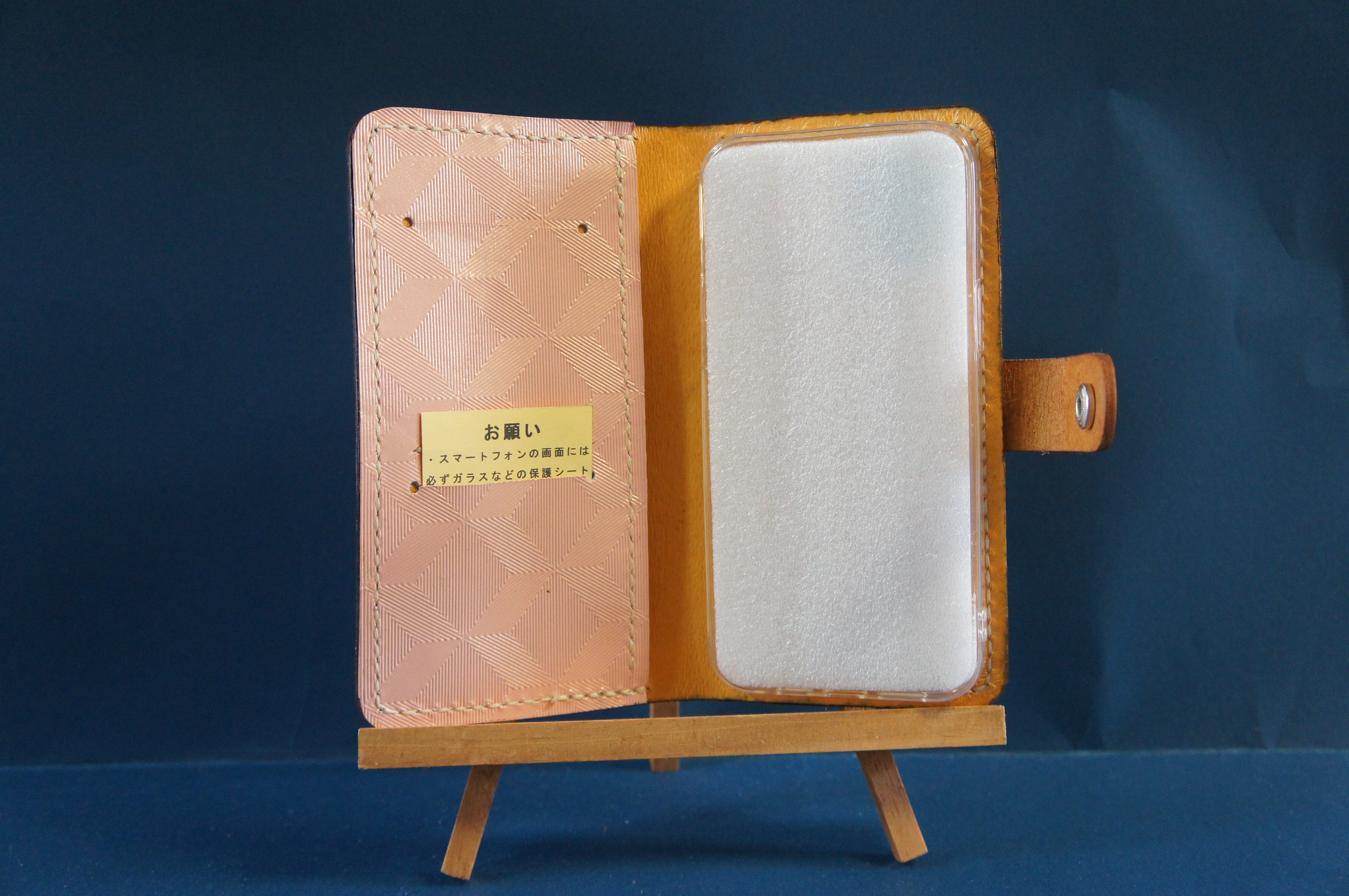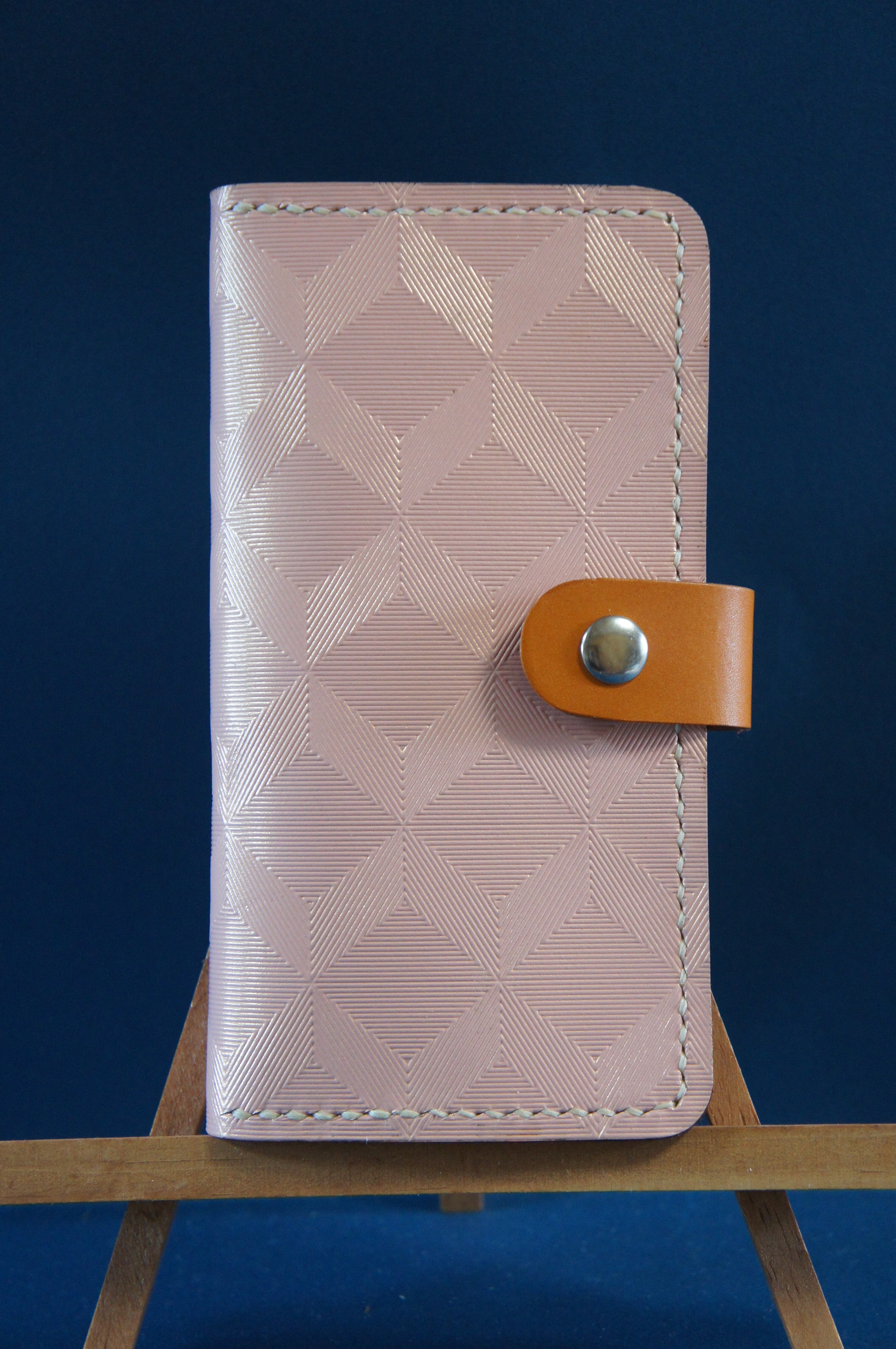 iPhone13Pro用の手帳型スマートフォンケースです。本体、内側、カードホルダー、ホルダー裏の合計4枚の革を縫い合わせています。太さ1番の白色の糸ですべて手縫いで仕上げています。2本の針で縫っていますので、ほつれにくい構造になっています。本体は張りのある1.5mmの厚さの和柄メタリックピンクの牛革です。内側には厚さ0.8mmのアメ豚革を使っています。カードホルダーが1つあります。カードホルダー部分の裏には収納スペースがあります。スマートフォンを固定する部分は、カシメ金具4個で固定してあります。バネホック、金具の色はシルバーです。カメラ穴部分を固くするためには皮革硬化剤を使用しています。貼り付け部分はつるつるになるまでトコフィニッシュなどを使って磨いています。