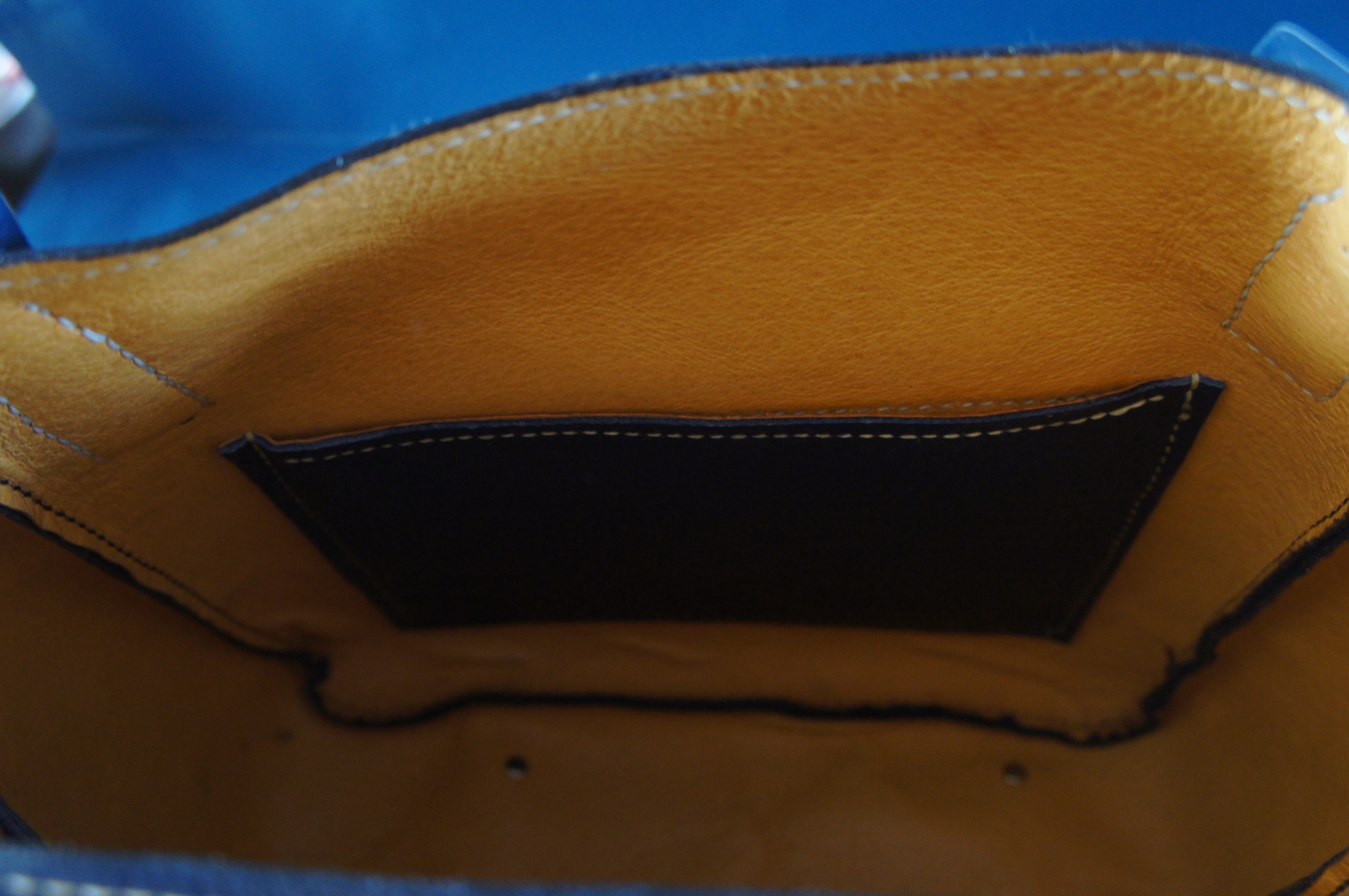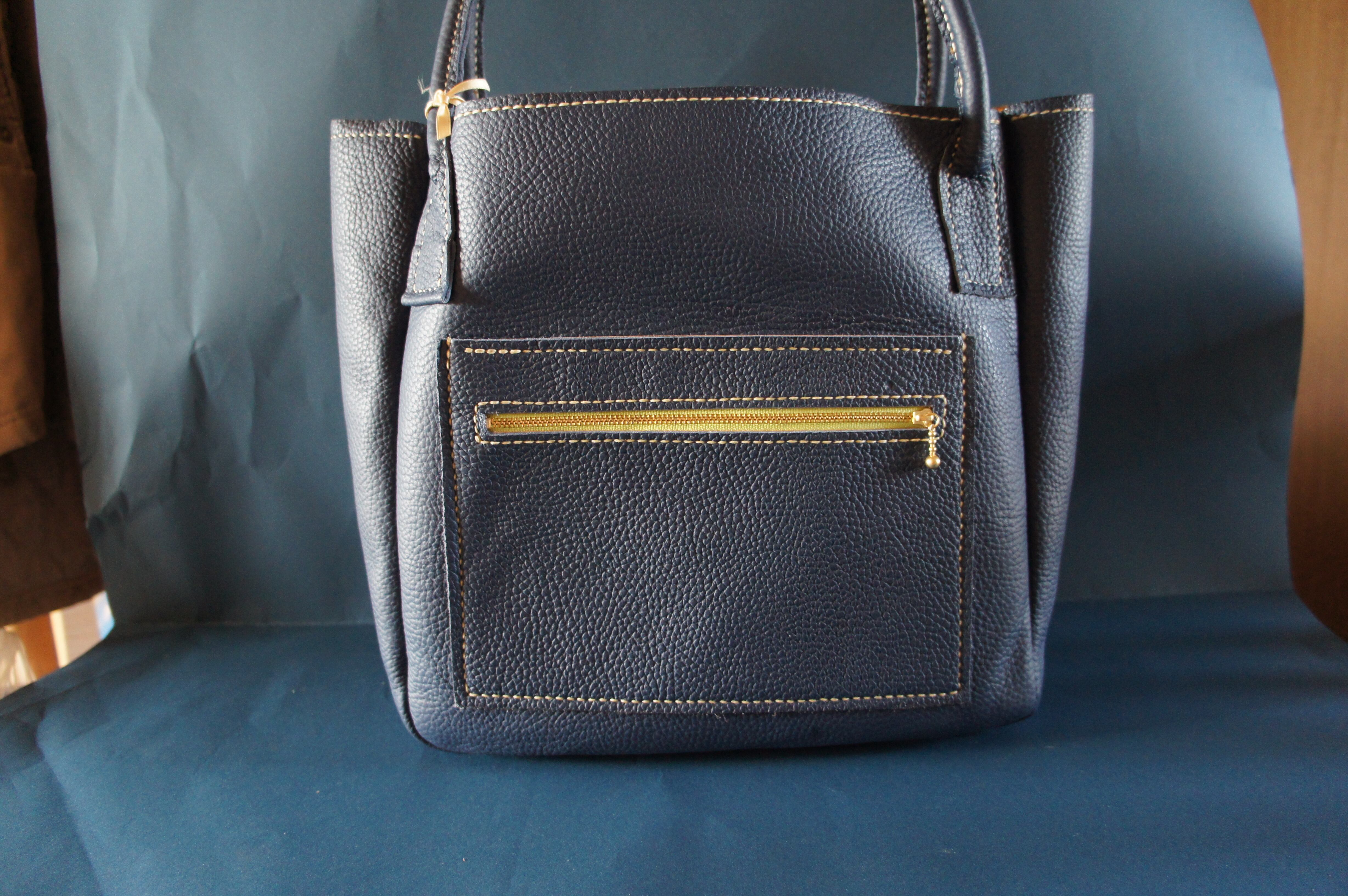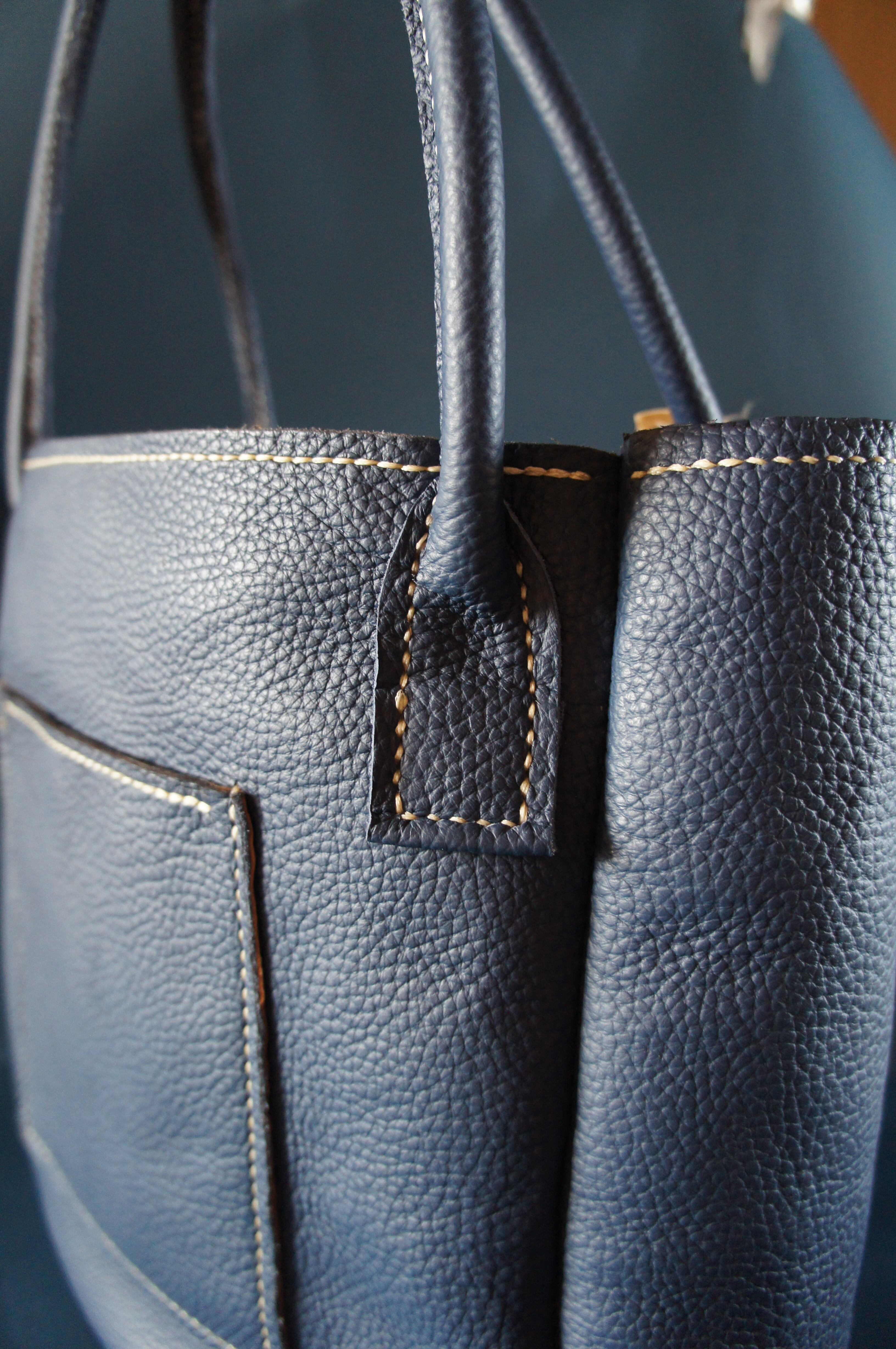 現品限り一点物です。女性ビジネス向けのトートバックです。サイズは縦30cm、横32cm、幅12cm、持ち手は50cmです。大きさは写真を参考にしてください。(大型のA4ファイルが2個入ります。)収納力は抜群です。重さは約650gです。太さ1番のクリーム色の糸ですべて手縫いで仕上げています。2本の針で縫っていますので、ほつれにくい構造になっています。本体は2.0mmの厚さの紺色の牛革です。内側には厚さ0.5mmの豚革を張っています。全体が2枚の革を張り合わせた構造のため、通常の2倍以上の強度があります。内部には大きめのポケットが1つとスマホ用のポケットが1つあります。外にはポケットが1つとファスナー付きのポケットが1つあります。底には底鋲が4つあります。持ち手は、本体と同じ革に芯を入れて丸い持ち手に仕上げています。縫い合わせた部分は、コバコートでツルツルです。