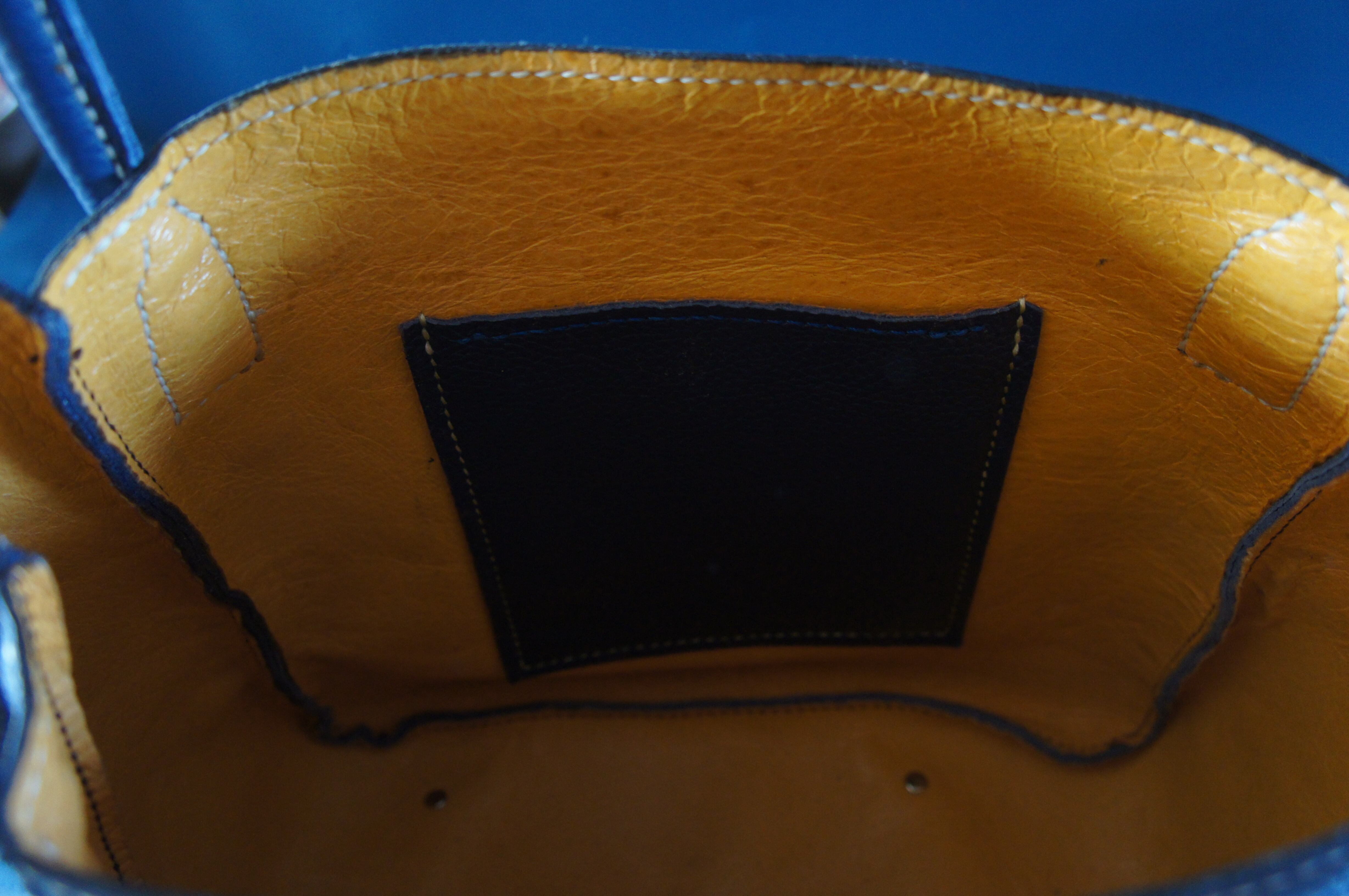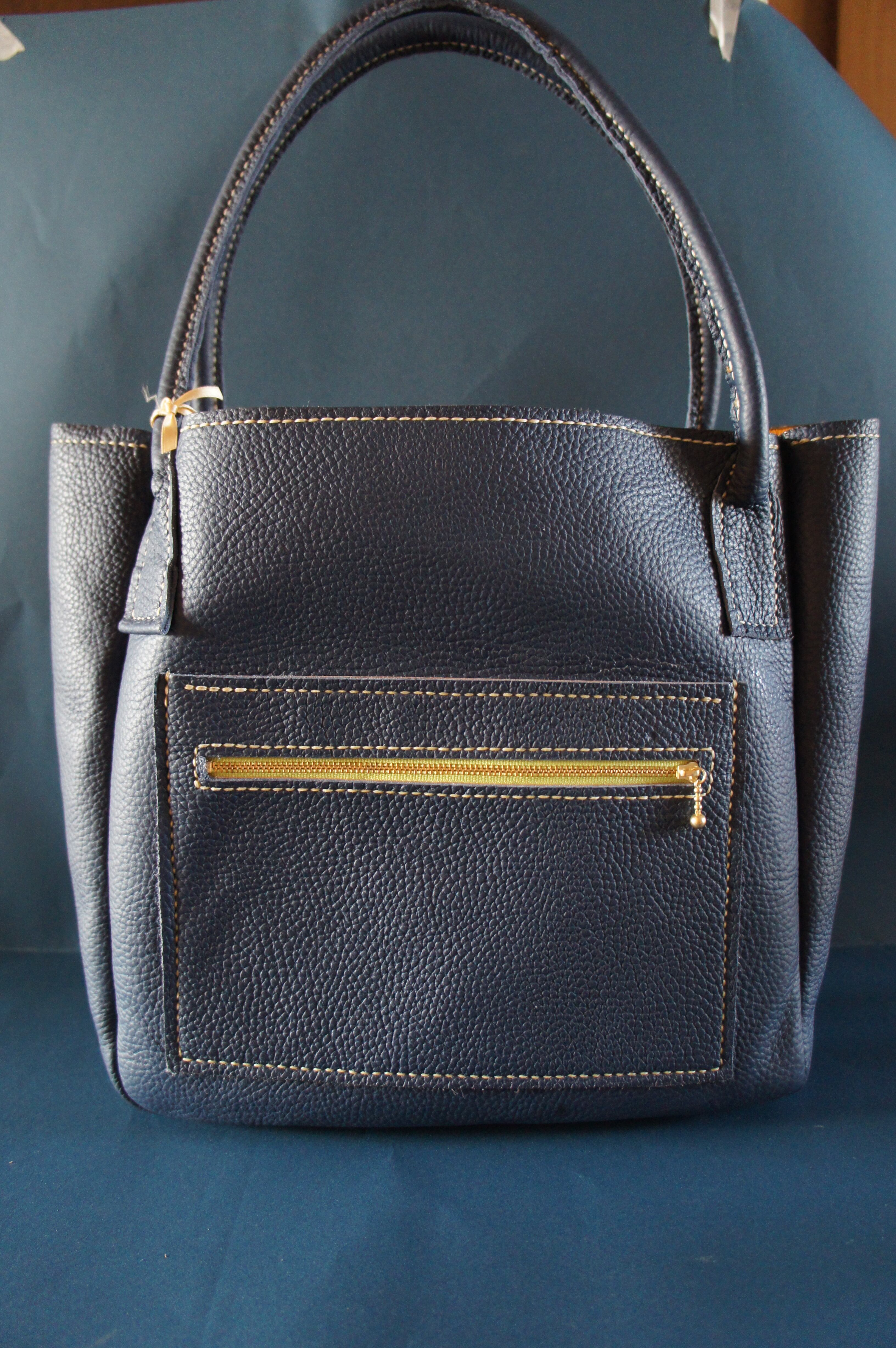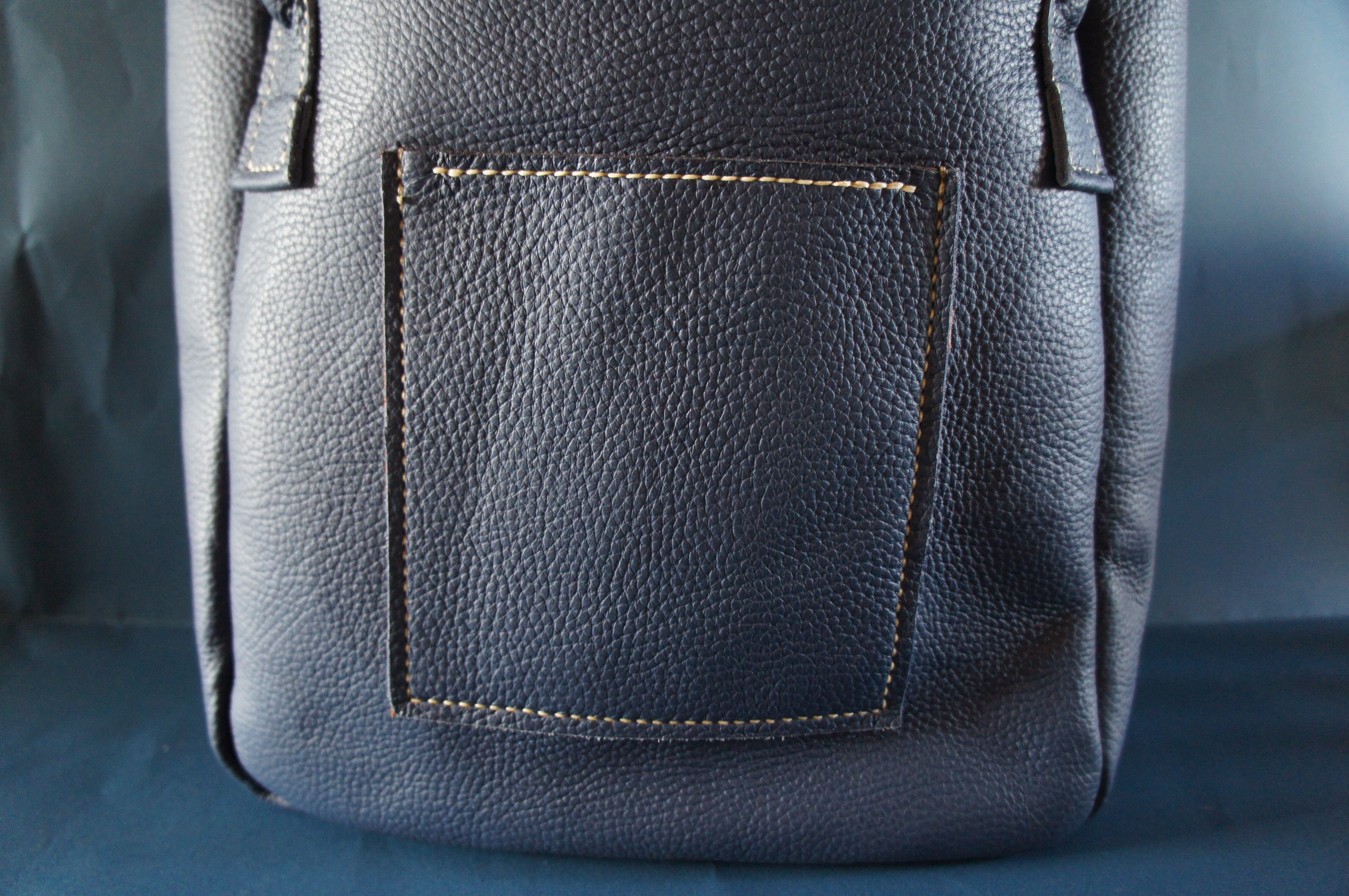 現品限り一点物です。女性ビジネス向けのトートバックです。サイズは縦30cm、横32cm、幅12cm、持ち手は50cmです。大きさは写真を参考にしてください。(大型のA4ファイルが2個入ります。)収納力は抜群です。重さは約650gです。太さ1番のクリーム色の糸ですべて手縫いで仕上げています。2本の針で縫っていますので、ほつれにくい構造になっています。本体は2.0mmの厚さの紺色の牛革です。内側には厚さ0.5mmの豚革を張っています。全体が2枚の革を張り合わせた構造のため、通常の2倍以上の強度があります。内部には大きめのポケットが1つとスマホ用のポケットが1つあります。外にはポケットが1つとファスナー付きのポケットが1つあります。底には底鋲が4つあります。持ち手は、本体と同じ革に芯を入れて丸い持ち手に仕上げています。縫い合わせた部分は、コバコートでツルツルです。