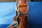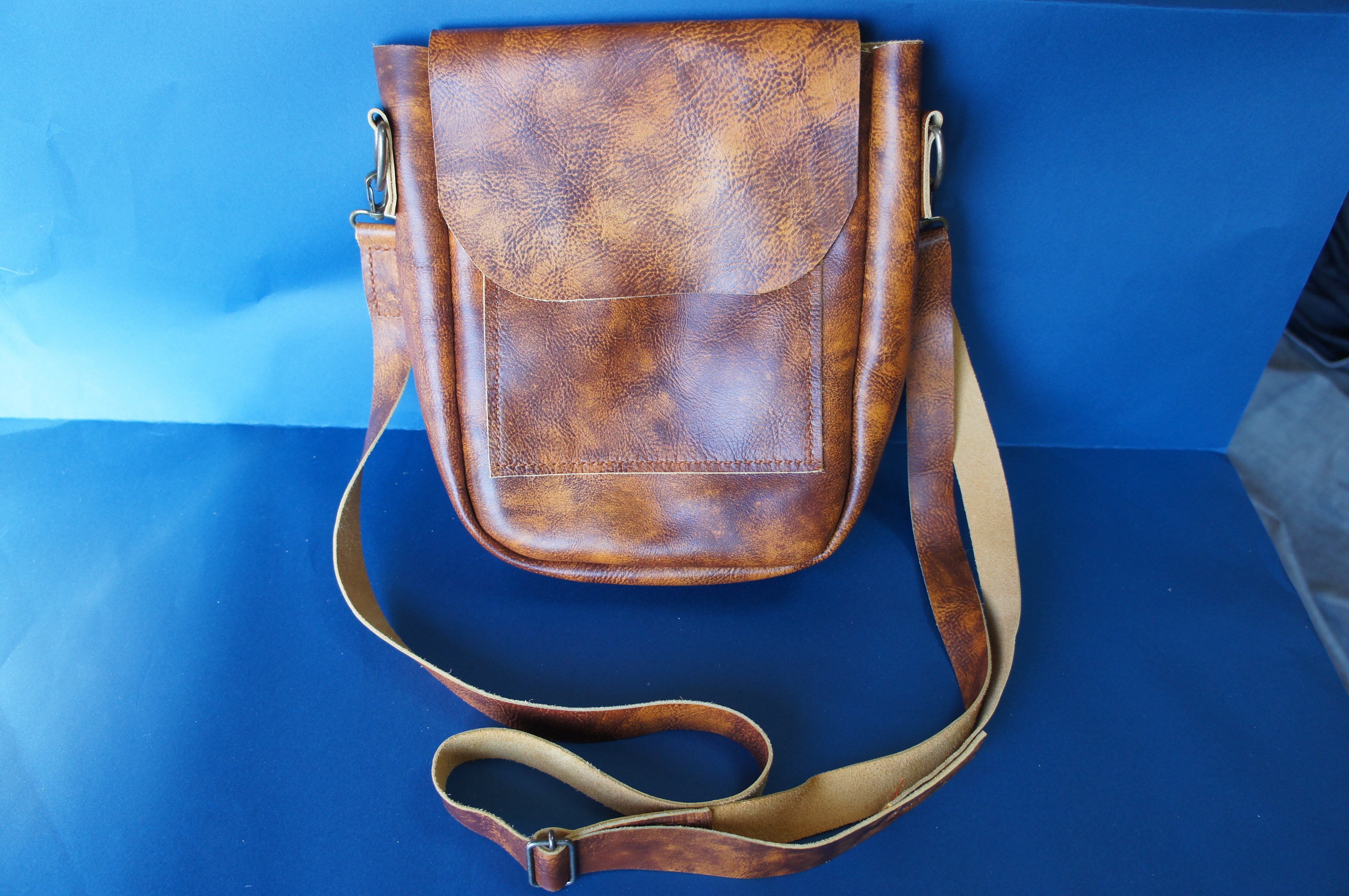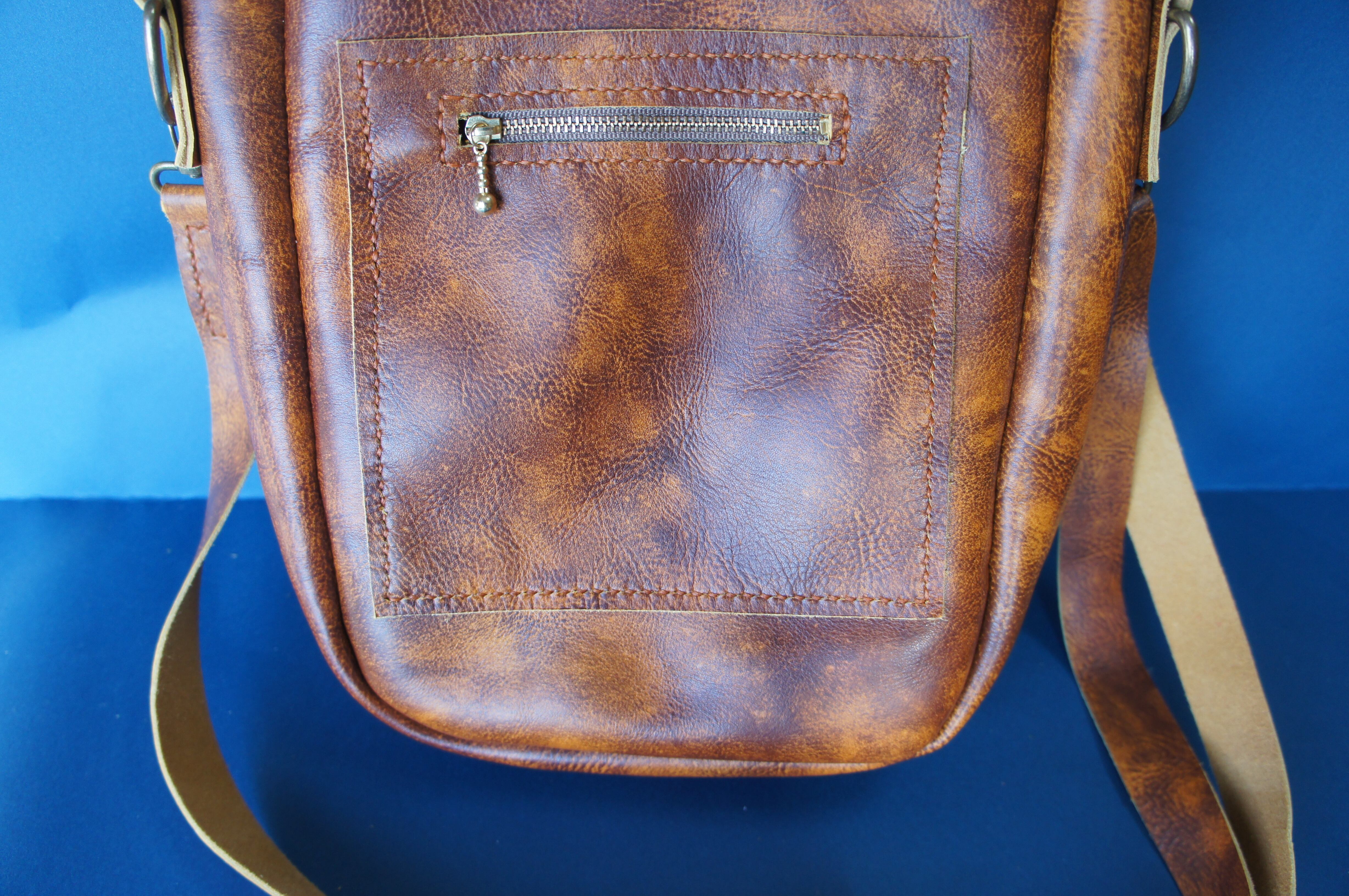 男性向けのショルダーバックです。サイズは縦25cm、横22cm、幅7cm、肩掛けの革は調節可能です。口にはかぶせがついています。重さは約300gです。太さ0番の強ナイロン糸ですべて手縫いで仕上げています。2本の針で縫っていますので、ほつれにくい構造になっています。本体は2.0mmの厚さの茶色の牛革です。脂分を含んだやわらかいで丈夫な革です。前面にはファスナーポケットが1つあります。後面にはスマートフォンが入るポケットがあります。縫い合わせた部分は、コバコートでツルツルです。