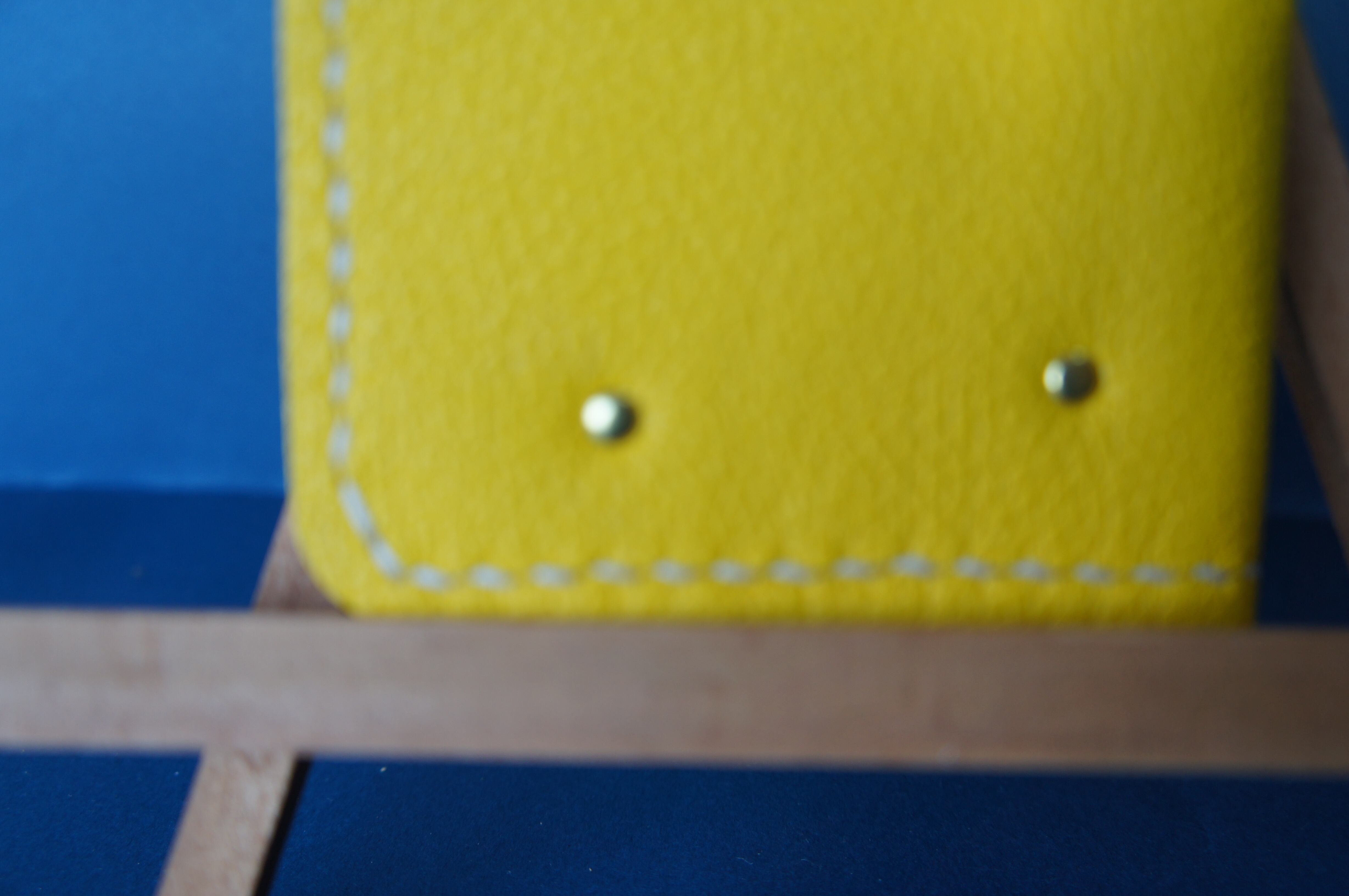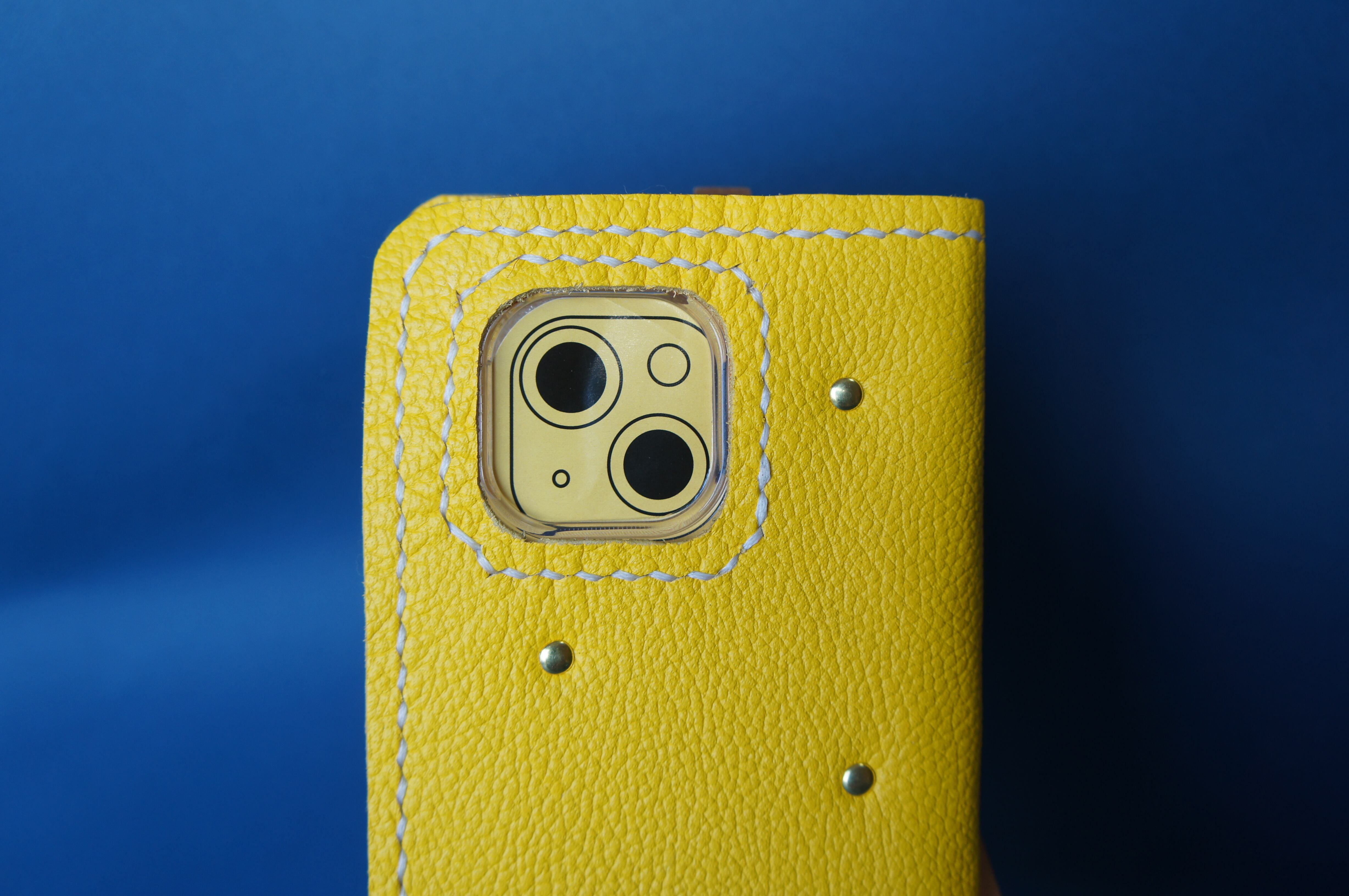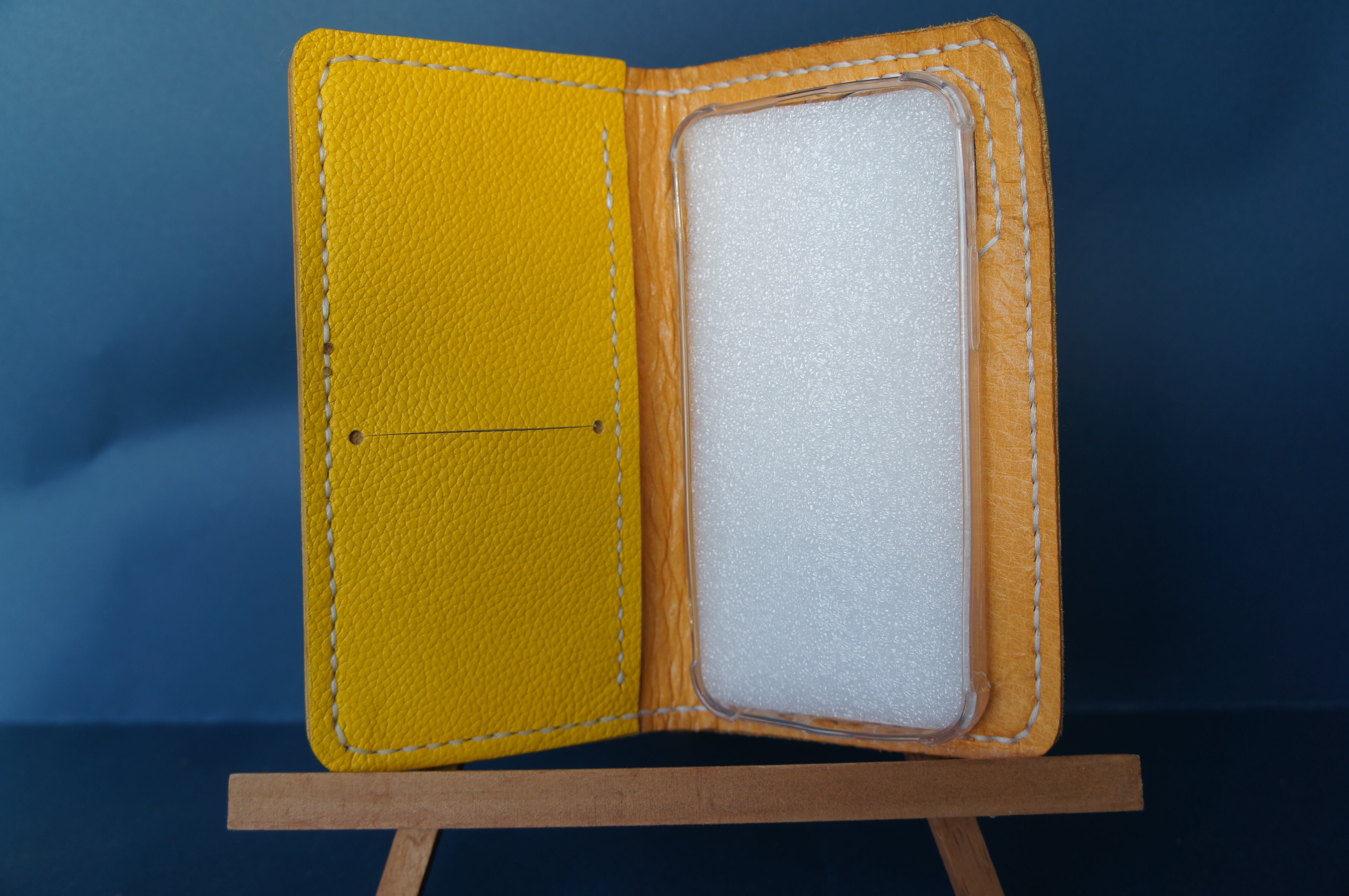 iPhone13mini用の手帳型スマートフォンケースです。バックルのないシンプルデザインです。本体、内側、カードホルダー、ホルダー裏の合計4枚の革を縫い合わせています。太さ1番の白色の糸ですべて手縫いで仕上げています。2本の針で縫っていますので、ほつれにくい構造になっています。本体は1.5mmの厚さのシュリンクイエローの牛革です。内側には厚さ0.8mmの豚革を使っています。カードホルダーが1つあります。カードホルダー部分の裏には収納スペースがあります。スマートフォンを固定する部分は、カシメ金具5個で固定してあります。金具の色は金色です。カメラ穴部分を丈夫にするためには周囲を縫っています。貼り付け部分はツルツルになるまでトコフィニッシュなどを使って磨いています。
