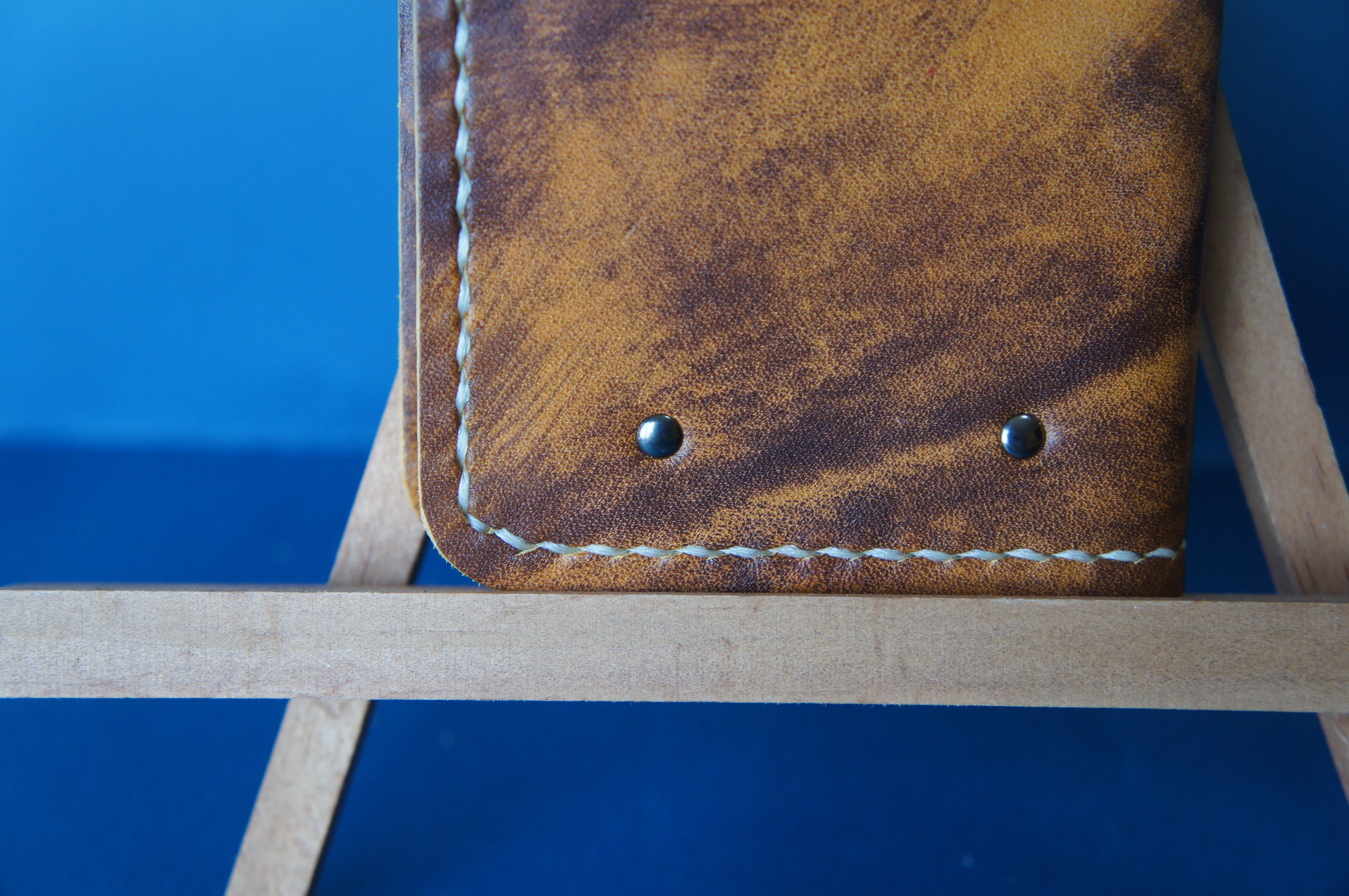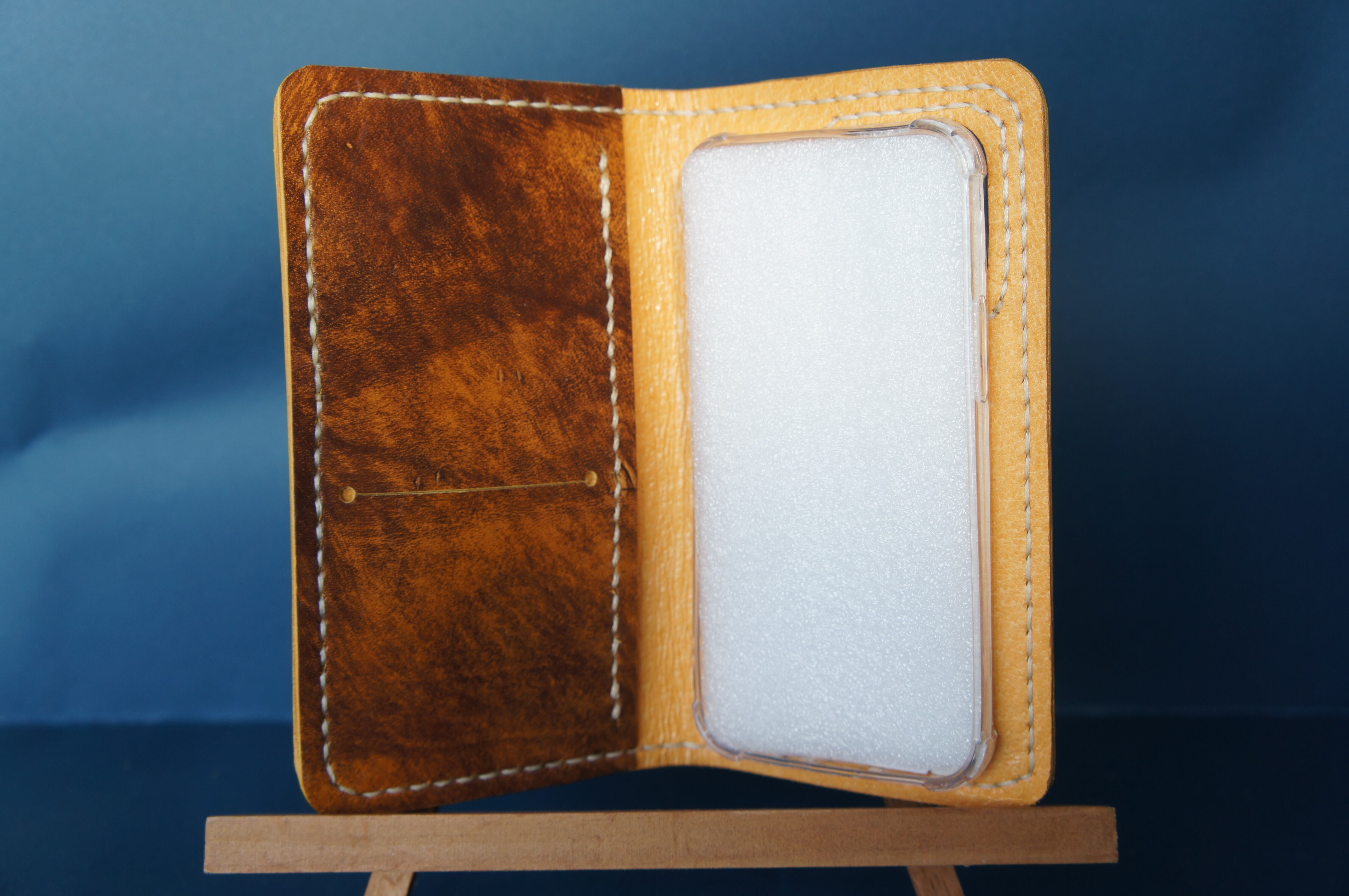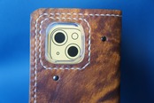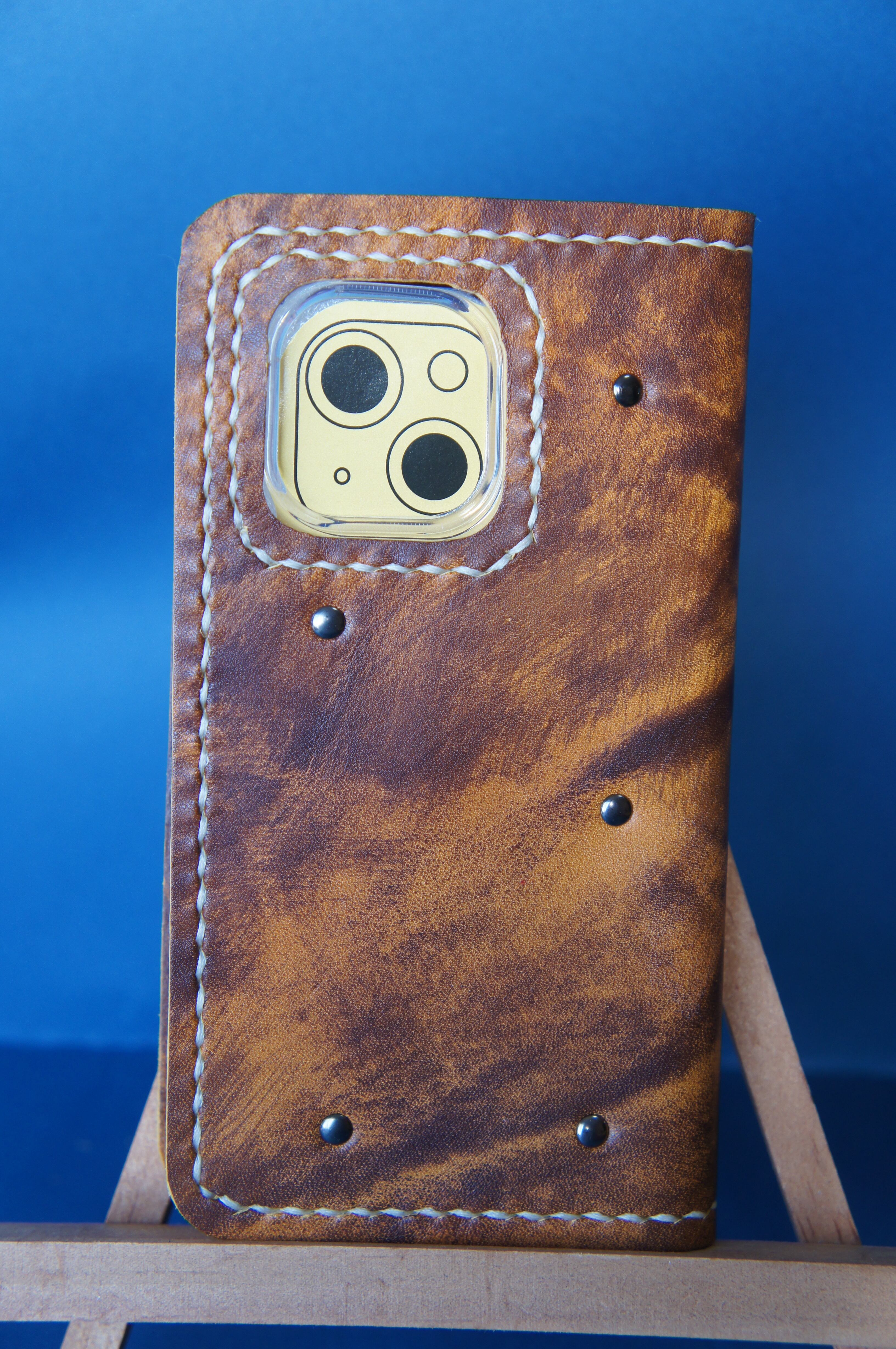 iPhone13mini用の手帳型スマートフォンケースです。バックルのないシンプルデザインです。本体、内側、カードホルダー、ホルダー裏の合計4枚の革を縫い合わせています。太さ1番のクリーム色の糸ですべて手縫いで仕上げています。2本の針で縫っていますので、ほつれにくい構造になっています。本体は1.5mmの厚さのトラ模様の茶色の牛革です。内側には厚さ0.8mmの豚革を使っています。カードホルダーが1つあります。カードホルダー部分の裏には収納スペースがあります。スマートフォンを固定する部分は、カシメ金具5個で固定してあります。金具の色はガンメタです。カメラ穴部分を丈夫にするためには周囲を縫っています。貼り付け部分はツルツルになるまでトコフィニッシュなどを使って磨いています。