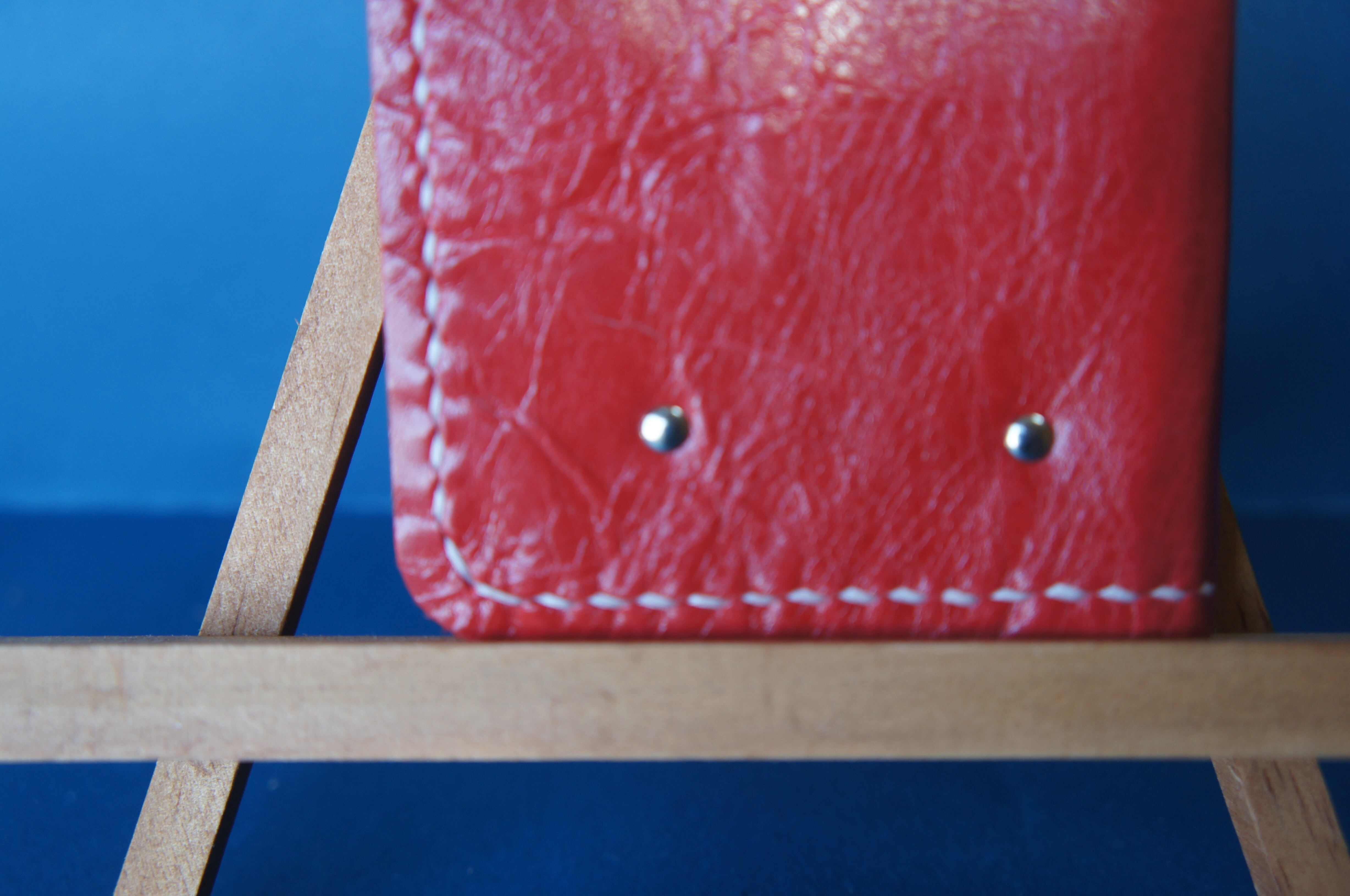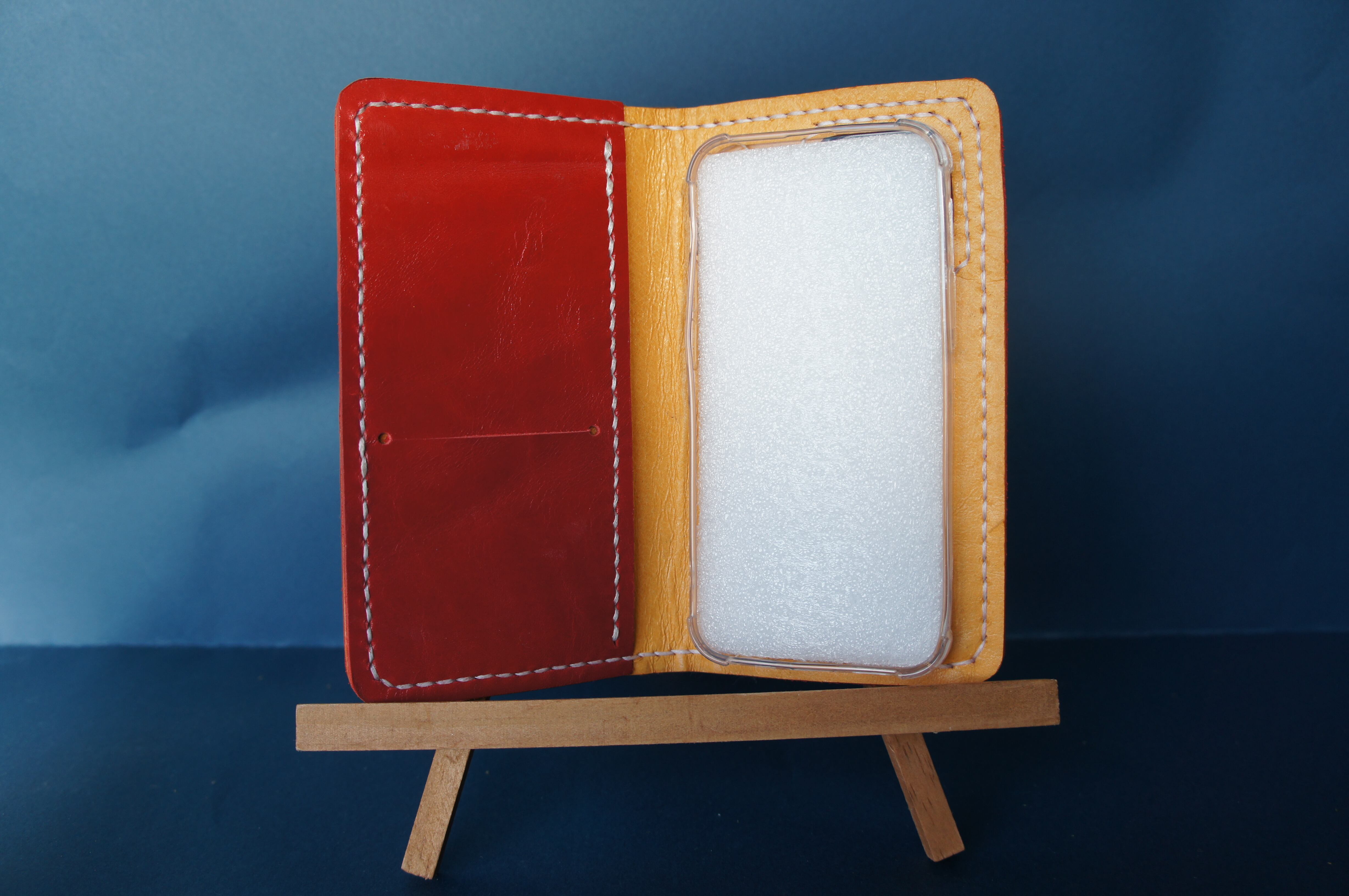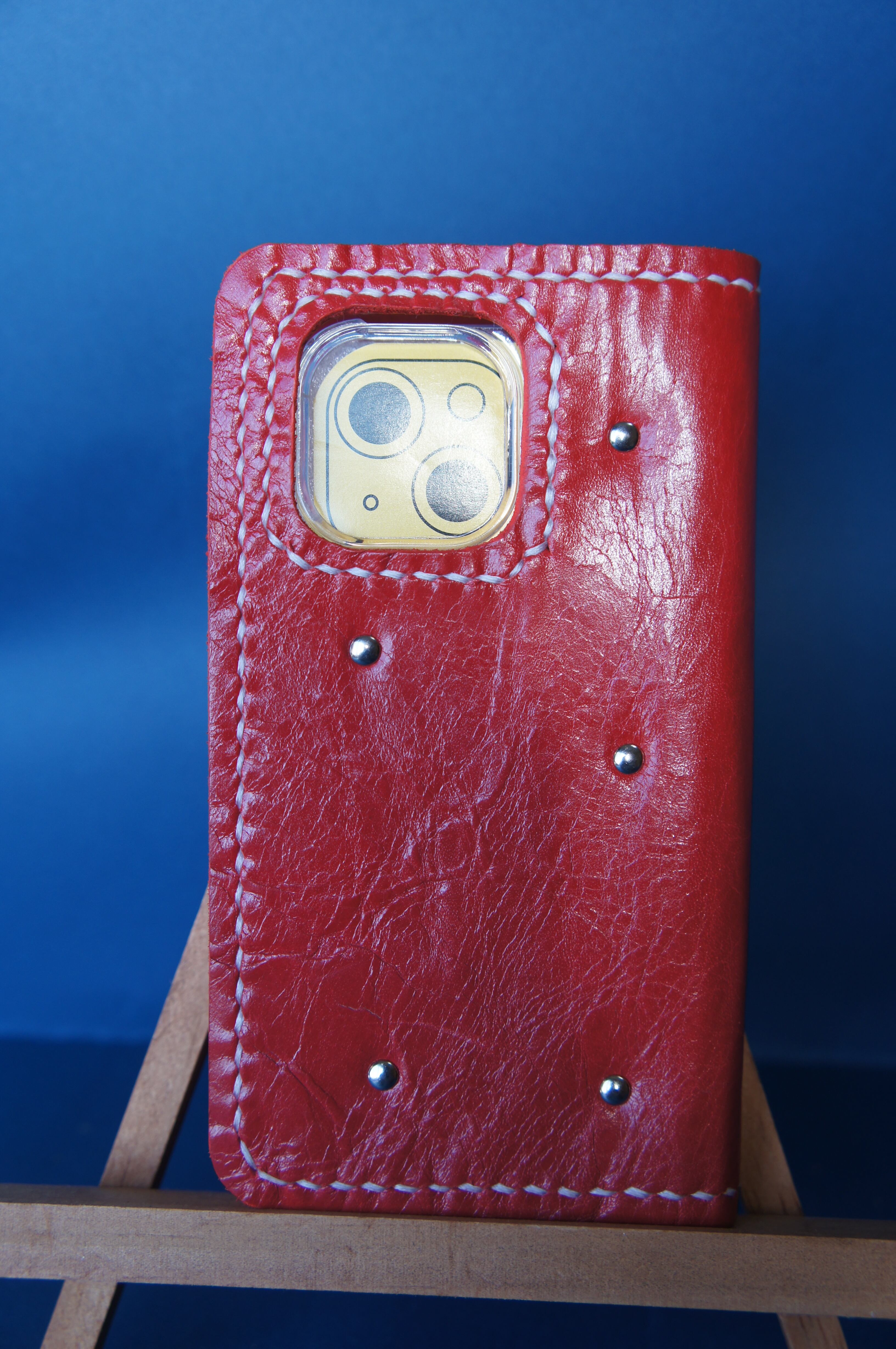 iPhone13mini用の手帳型スマートフォンケースです。バックルのないシンプルデザインです。本体、内側、カードホルダー、ホルダー裏の合計4枚の革を縫い合わせています。太さ1番のクリーム色の糸ですべて手縫いで仕上げています。2本の針で縫っていますので、ほつれにくい構造になっています。本体は1.5mmの厚さの赤色の牛革です。内側には厚さ0.8mmの豚革を使っています。カードホルダーが1つあります。カードホルダー部分の裏には収納スペースがあります。スマートフォンを固定する部分は、カシメ金具5個で固定してあります。金具の色はシルバーです。カメラ穴部分を丈夫にするために周囲を縫っています。貼り付け部分はツルツルになるまでトコフィニッシュなどを使って磨いています。