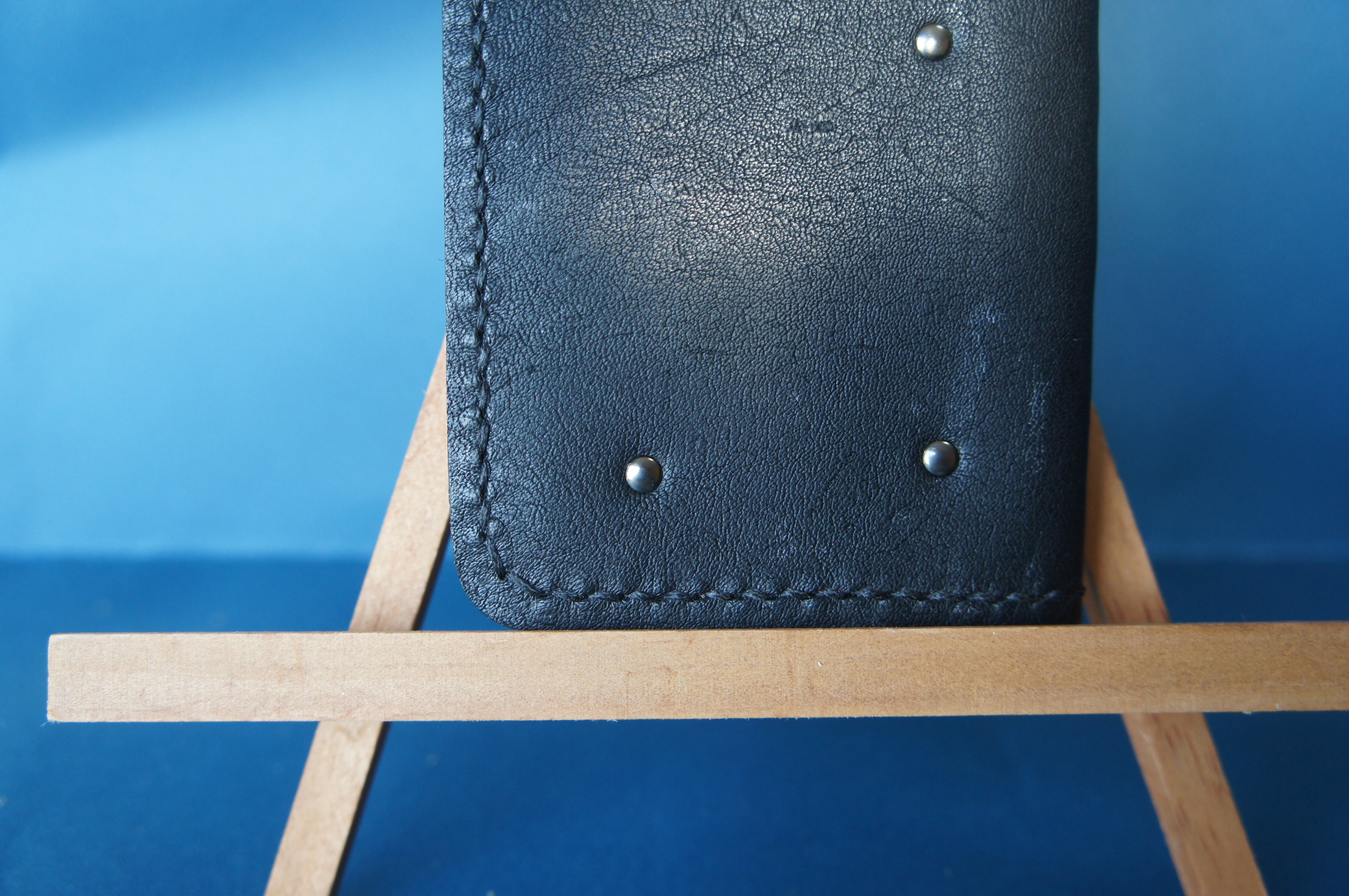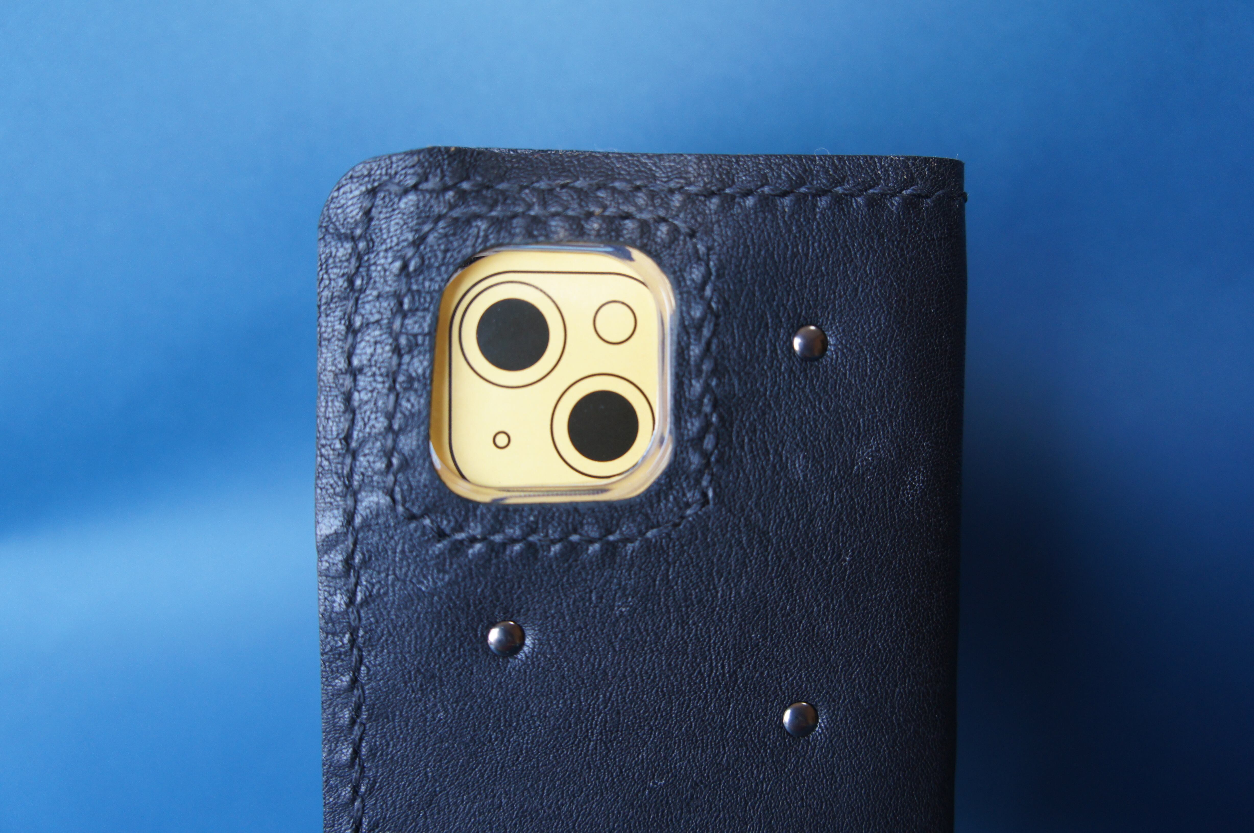 iPhone13mini用の手帳型スマートフォンケースです。バックルのないシンプルデザインです。本体、内側、カードホルダー、ホルダー裏の合計4枚の革を縫い合わせています。太さ1番の黒色の糸ですべて手縫いで仕上げています。2本の針で縫っていますので、ほつれにくい構造になっています。本体は1.0mmの厚さの黒色の牛革です。内側には厚さ0.8mmの豚革を使っています。カードホルダーが1つあります。カードホルダー部分の裏には収納スペースがあります。スマートフォンを固定する部分は、カシメ金具5個で固定してあります。金具の色はガンメタです。カメラ穴部分を丈夫にするために周囲を縫っています。貼り付け部分はツルツルになるまでトコフィニッシュなどを使って磨いています。