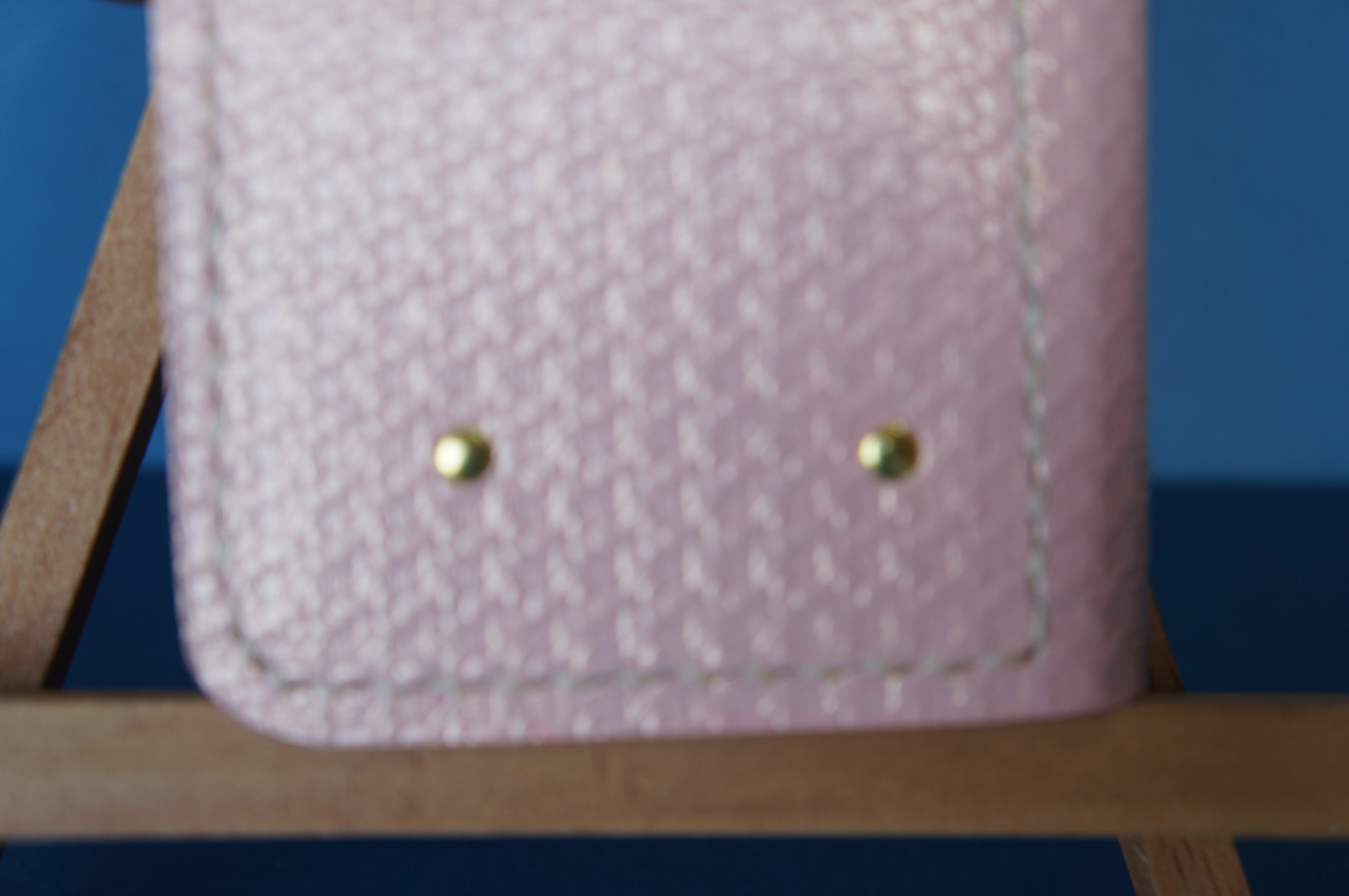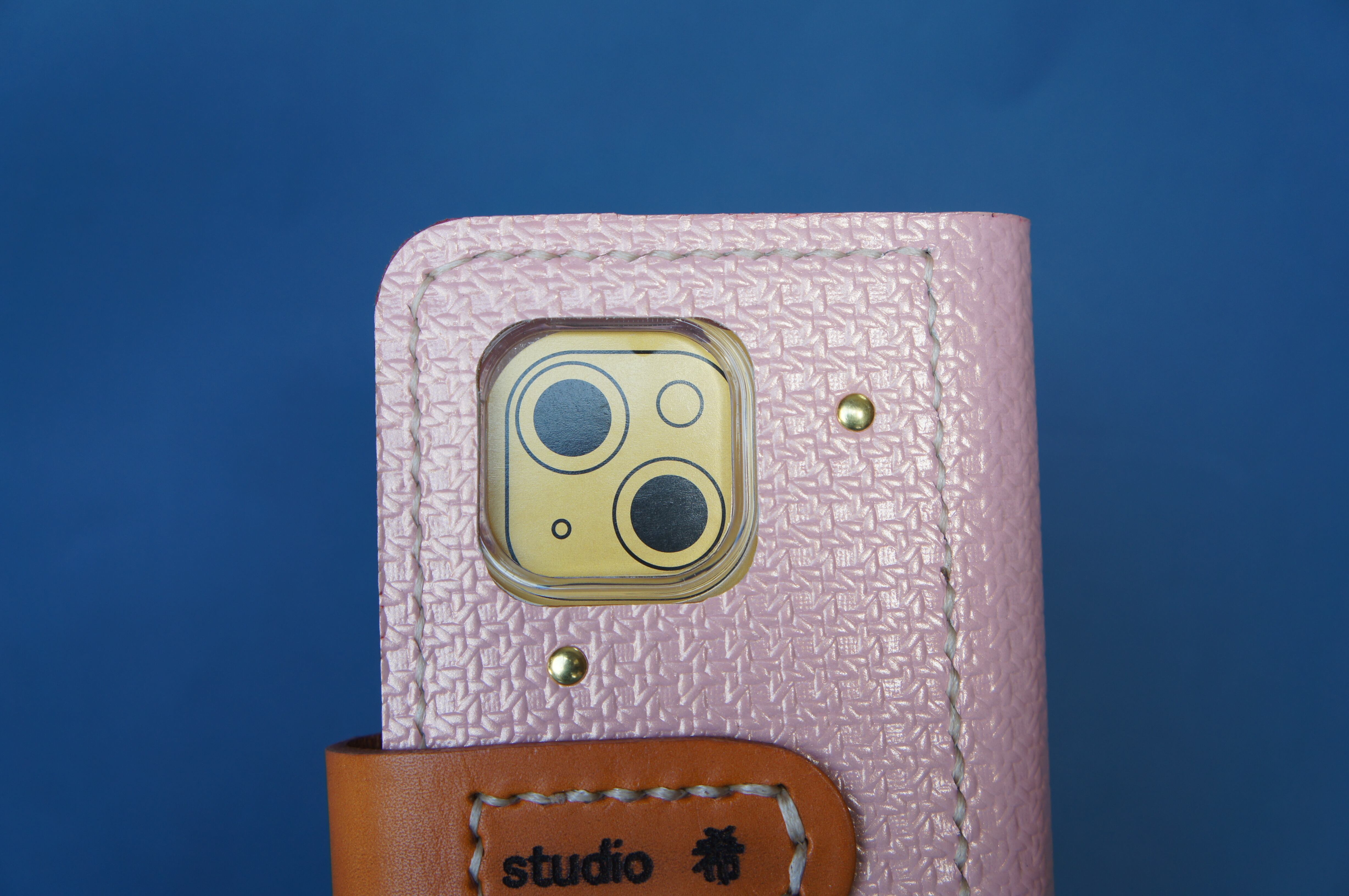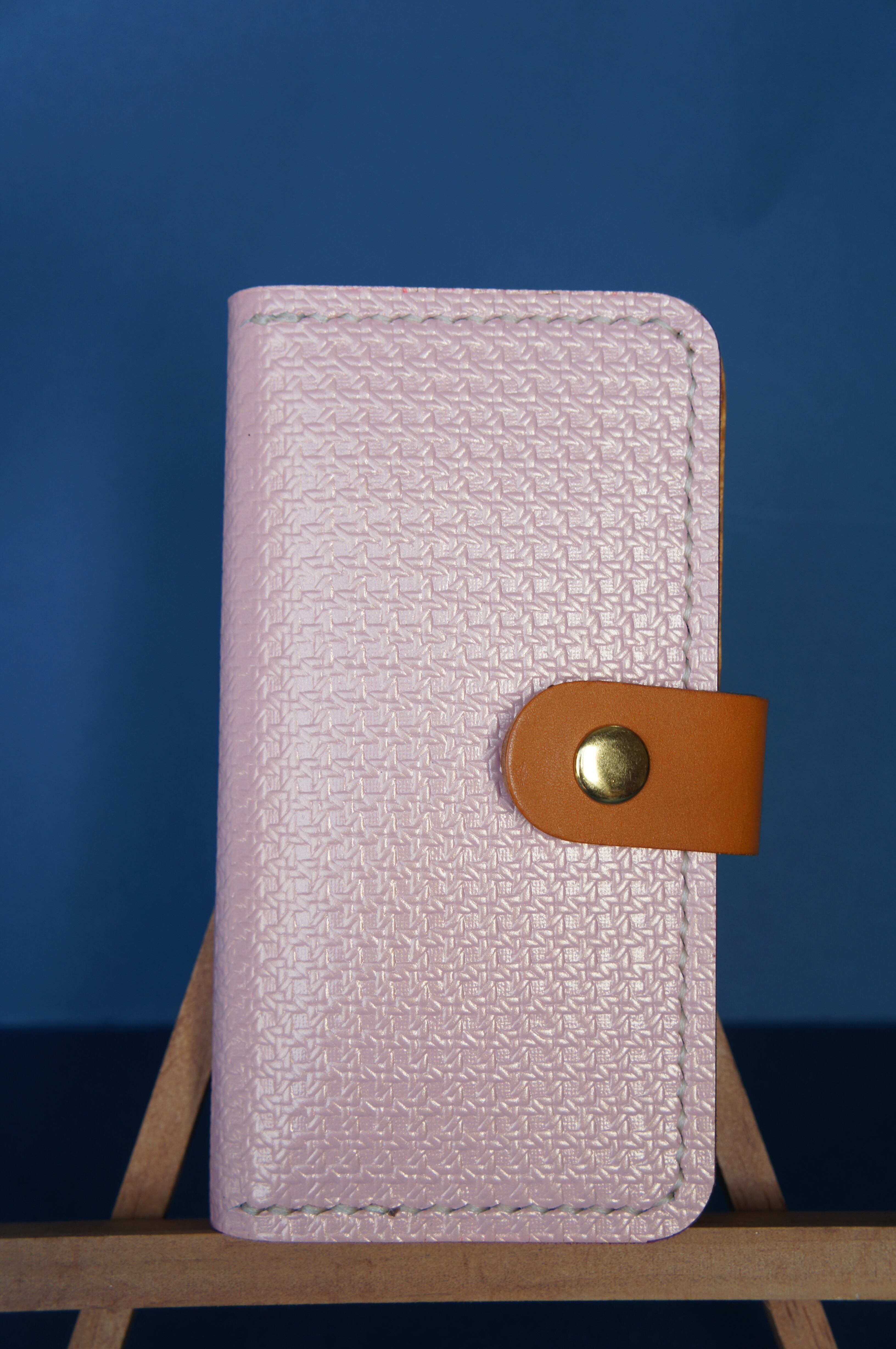 iPhone13mini用の手帳型スマートフォンケースです。本体、内側、カードホルダー、ホルダー裏、バックルの合計5枚の革を縫い合わせています。太さ1番のクリーム色の糸ですべて手縫いで仕上げています。2本の針で縫っていますので、ほつれにくい構造になっています。本体は1.5mmの厚さの和柄ピンク色の牛革です。内側には厚さ0.8mmの豚革を使っています。カードホルダーが1つあります。カードホルダー部分の裏には収納スペースがあります。スマートフォンを固定する部分は、カシメ金具5個で固定してあります。金具の色はガンメタです。貼り付け部分はツルツルになるまでトコフィニッシュなどを使って磨いています。
