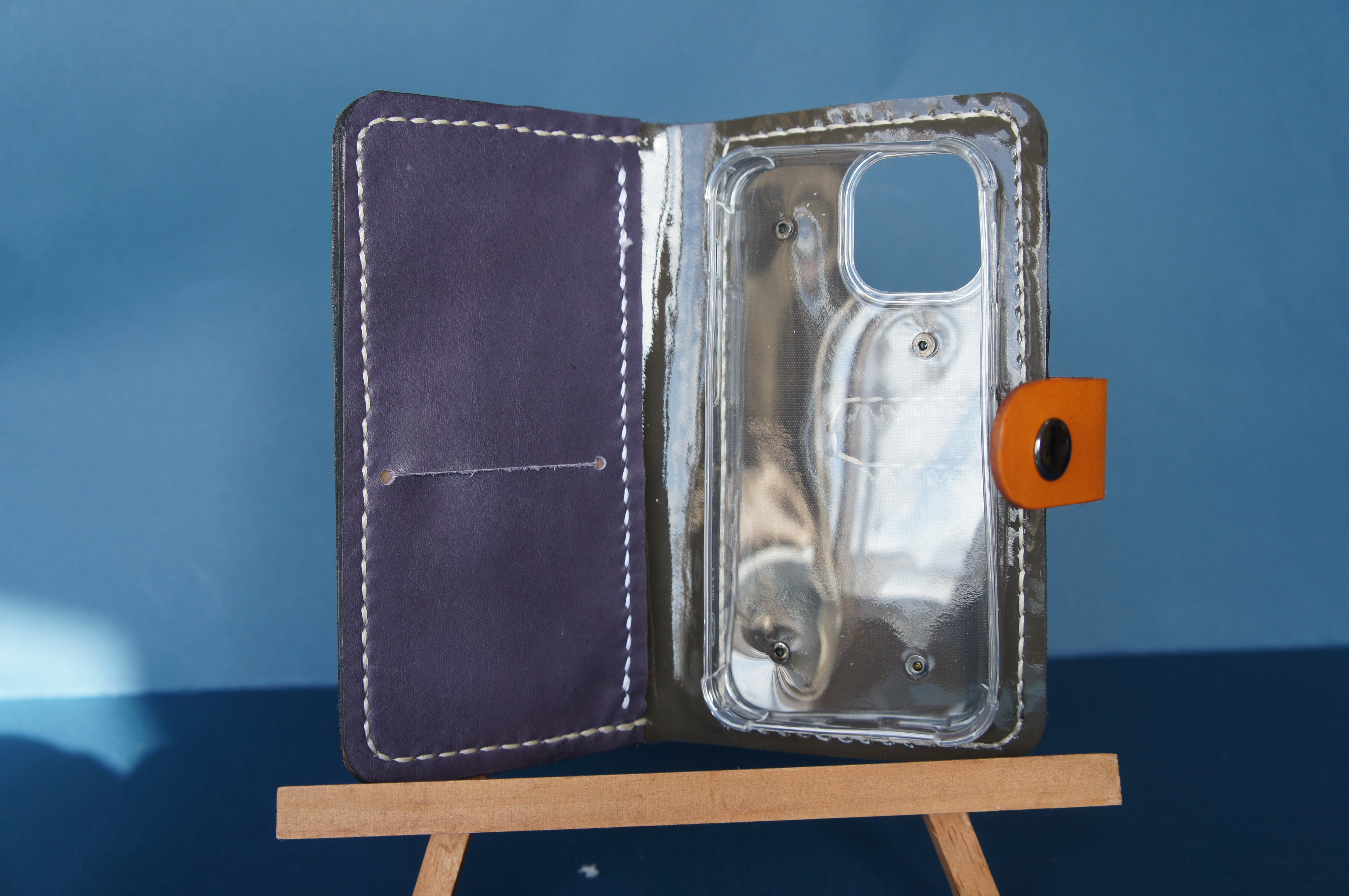 iPhone13mini用の手帳型スマートフォンケースです。本体、内側、カードホルダー、ホルダー裏、バックルの合計5枚の革を縫い合わせています。太さ1番のクリーム色の糸ですべて手縫いで仕上げています。2本の針で縫っていますので、ほつれにくい構造になっています。本体、内側、カードホルダー、ホルダー裏、バックルの合計5枚の革を縫い合わせています。太さ1番のクリーム色の糸ですべて手縫いで仕上げています。2本の針で縫っていますので、ほつれにくい構造になっています。本体は1.5mmの厚さの紫色の牛革です。内側には厚さ0.8mmの豚革を使っています。カードホルダーが1つあります。カードホルダー部分の裏には収納スペースがあります。スマートフォンを固定する部分は、カシメ金具5個で固定してあります。金具の色はガンメタです。貼り付け部分はツルツルになるまでトコフィニッシュなどを使って磨いています。