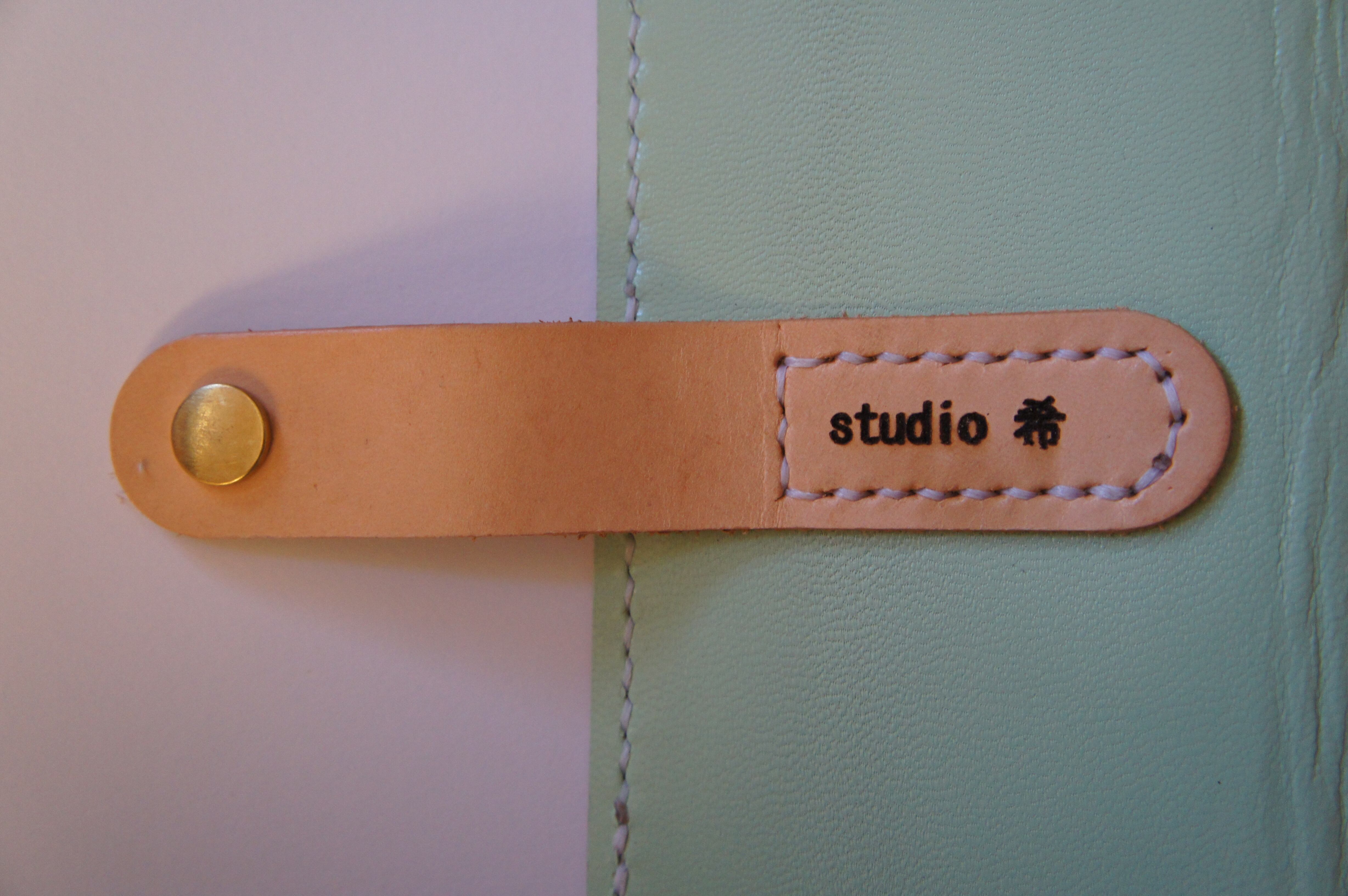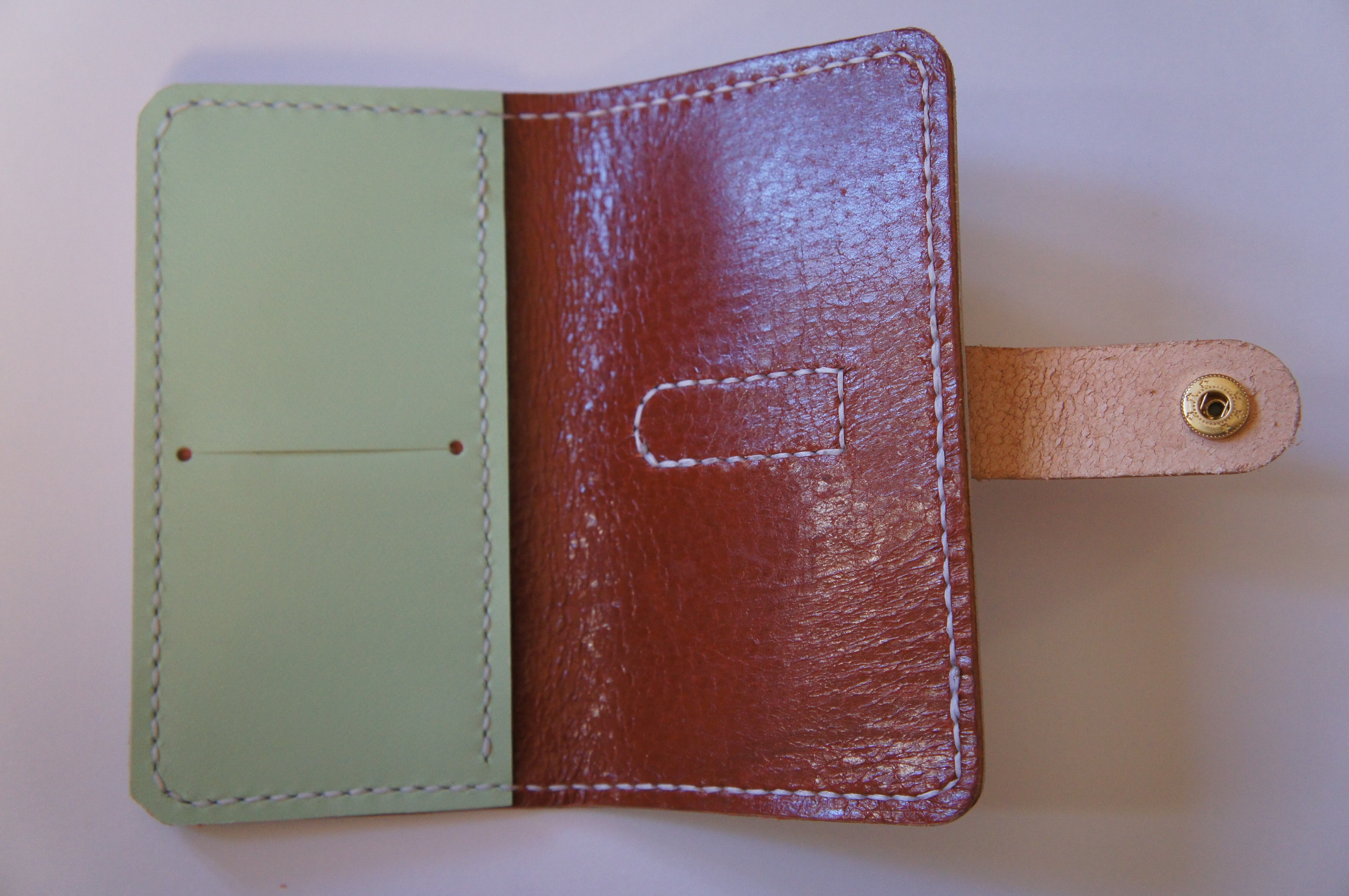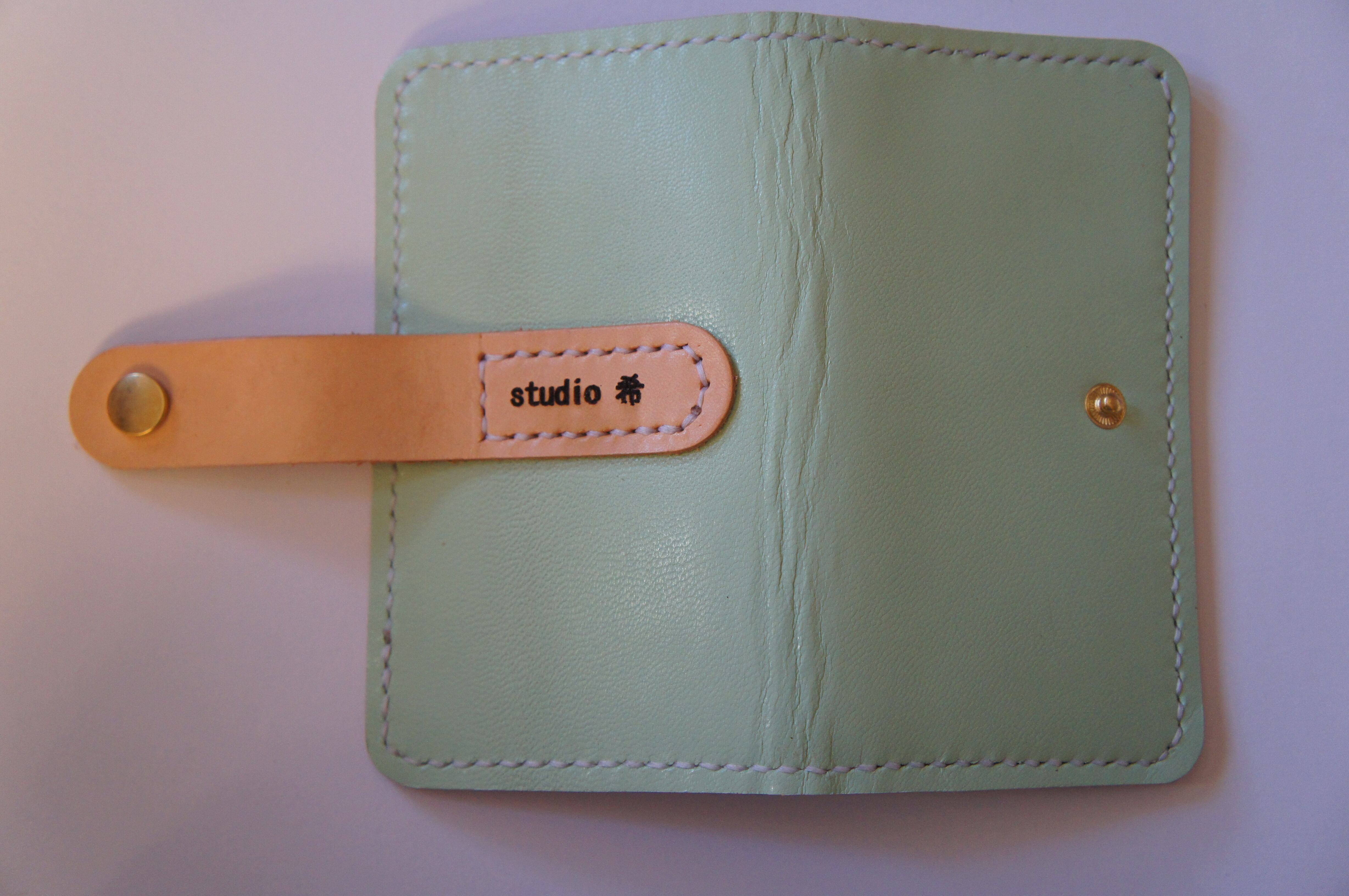 小型の手帳型スマートフォンケースです。本体、本体裏、カードホルダー、ホルダー裏、バックルの合計5枚の革を縫い合わせています。太さ1番の白色の糸ですべて手縫いで仕上げています。2本の針で縫っていますので、ほつれにくい構造になっています。本体はライトグリーンの牛革です。カードホルダーが1つあります。裏の革はアメ豚、牛床、イエローの豚革の3種類あります。カードホルダー部分の裏には収納スペースがあります。貼り付け部分はつるつるになるまでトコフィニッシュなどを使って磨いています。