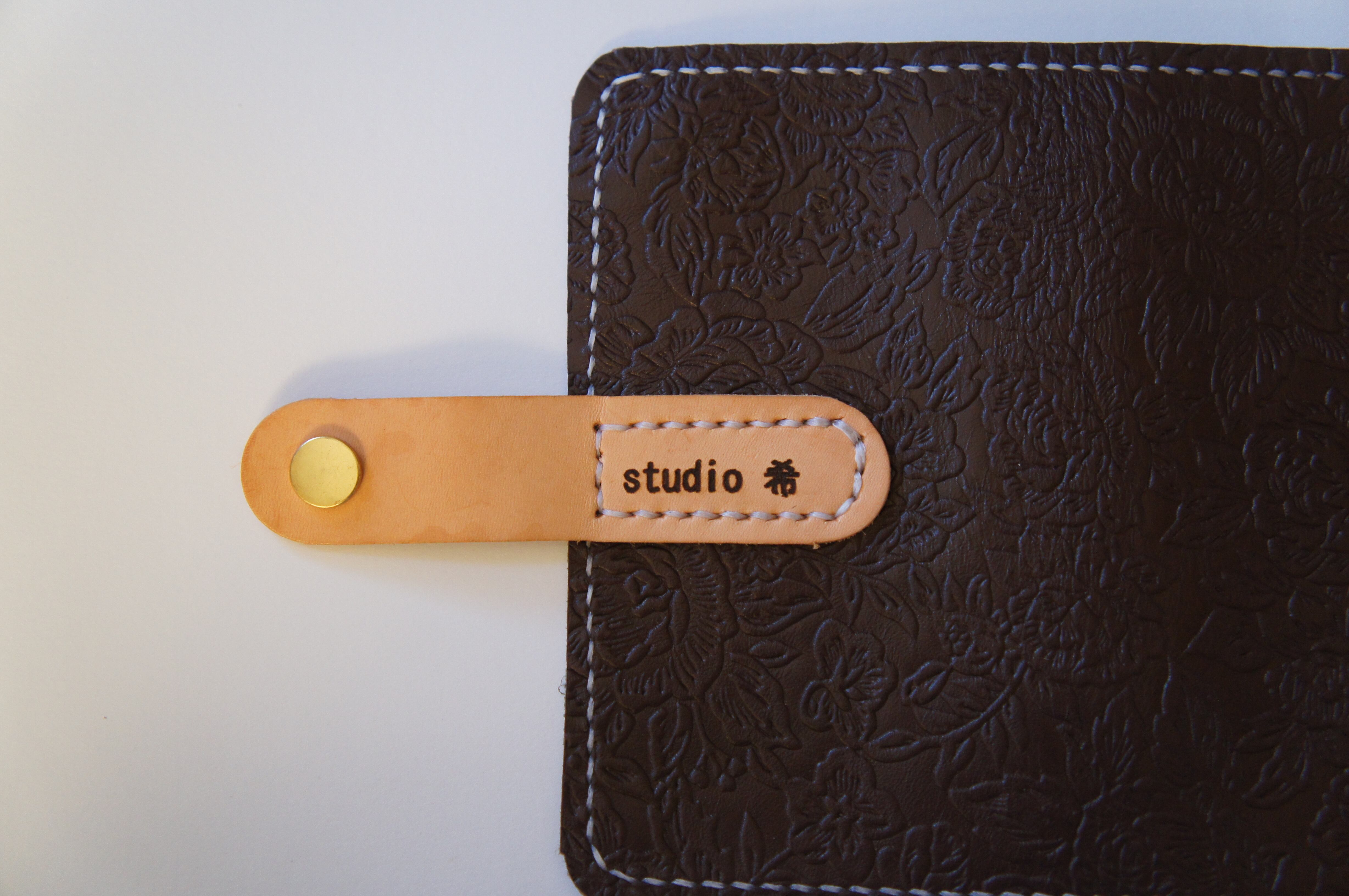 小型の手帳型スマートフォンケースです。本体、本体裏、カードホルダー、ホルダー裏、バックルの合計5枚の革を縫い合わせています。太さ1番の白色の糸ですべて手縫いで仕上げています。2本の針で縫っていますので、ほつれにくい構造になっています。本体はバラの型押しの茶色の牛革です。カードホルダーが1つあります。カードホルダー部分の裏には収納スペースがあります。貼り付け部分はつるつるになるまでトコフィニッシュなどを使って磨いています。
