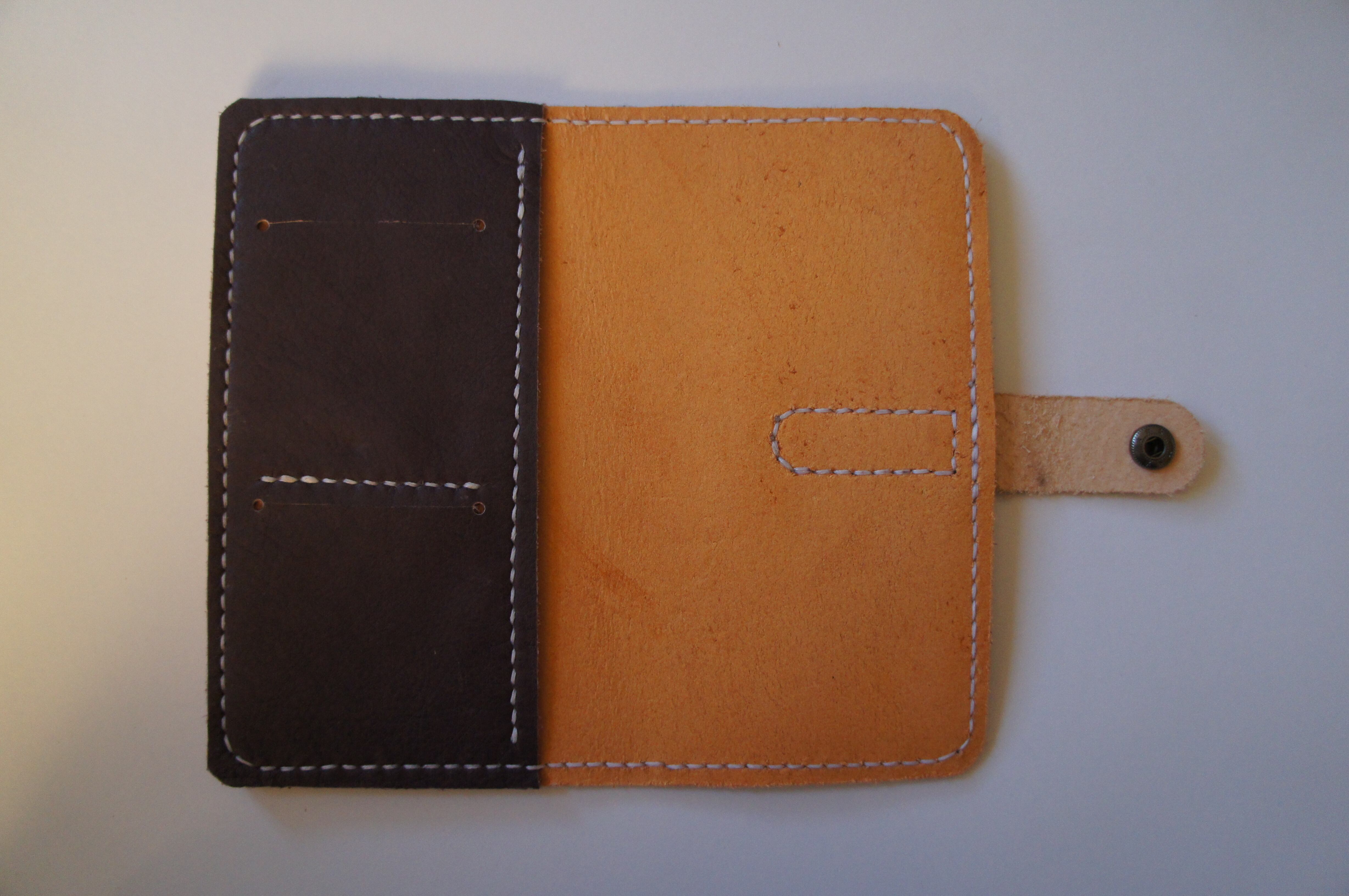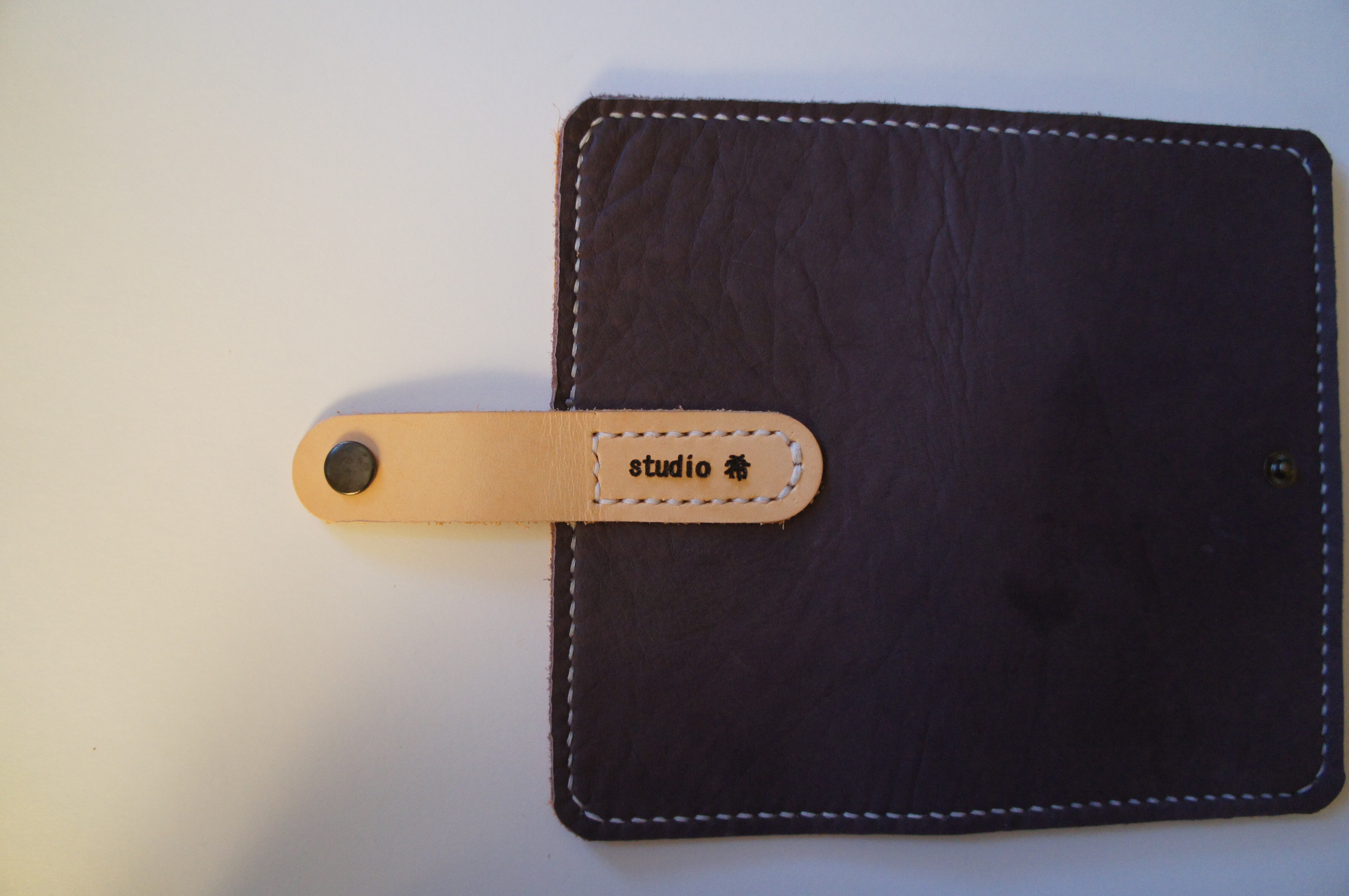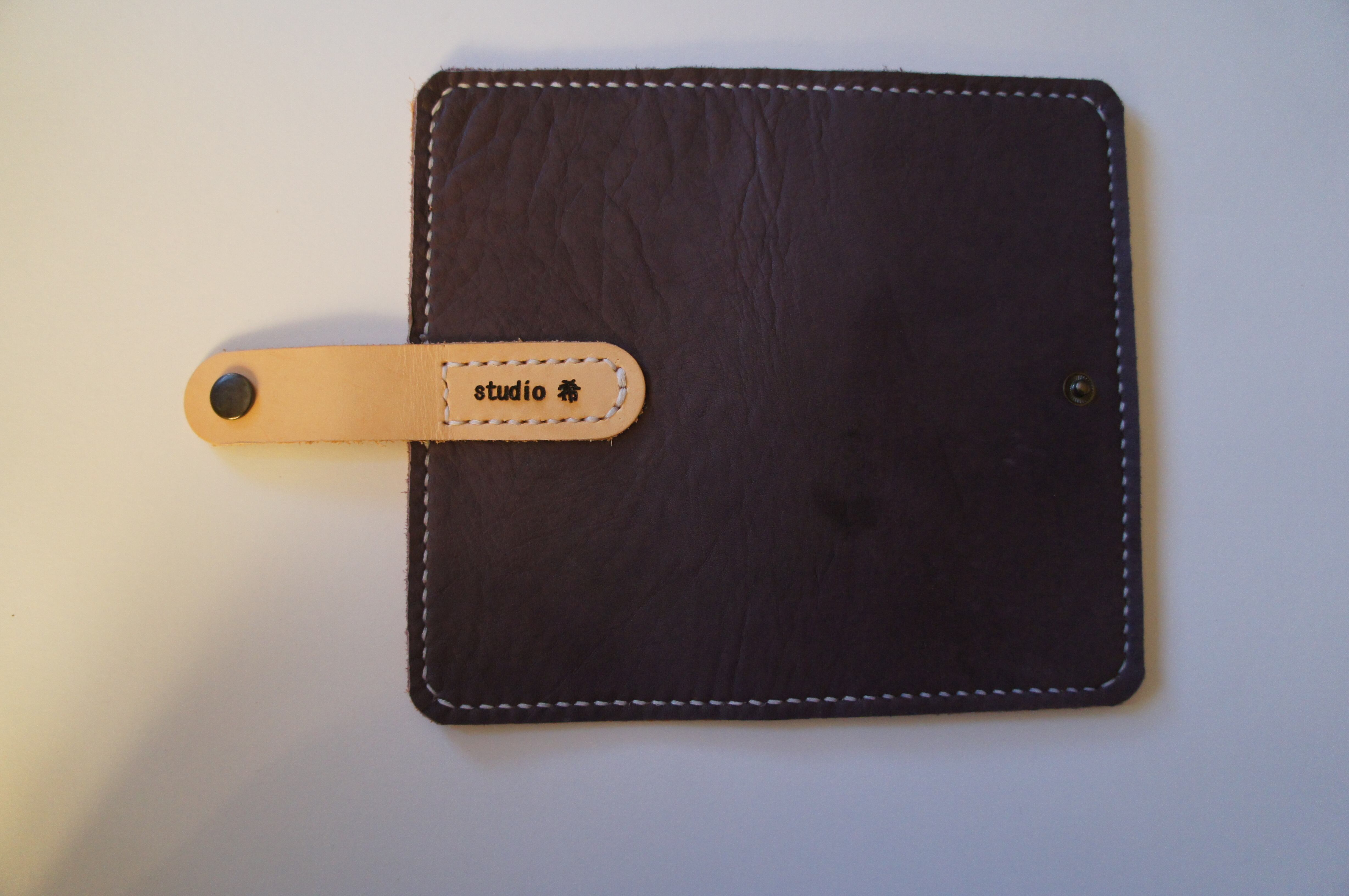 普通サイズの手帳型スマートフォンケースです。本体、本体裏、カードホルダー、ホルダー裏、バックルの合計5枚の革を縫い合わせています。太さ1番の白色の糸ですべて手縫いで仕上げています。2本の針で縫っていますので、ほつれにくい構造になっています。本体は紫色の牛革です。カードホルダーが2つあります。カードホルダー部分の裏には収納スペースがあります。貼り付け部分はつるつるになるまでトコフィニッシュなどを使って磨いています。