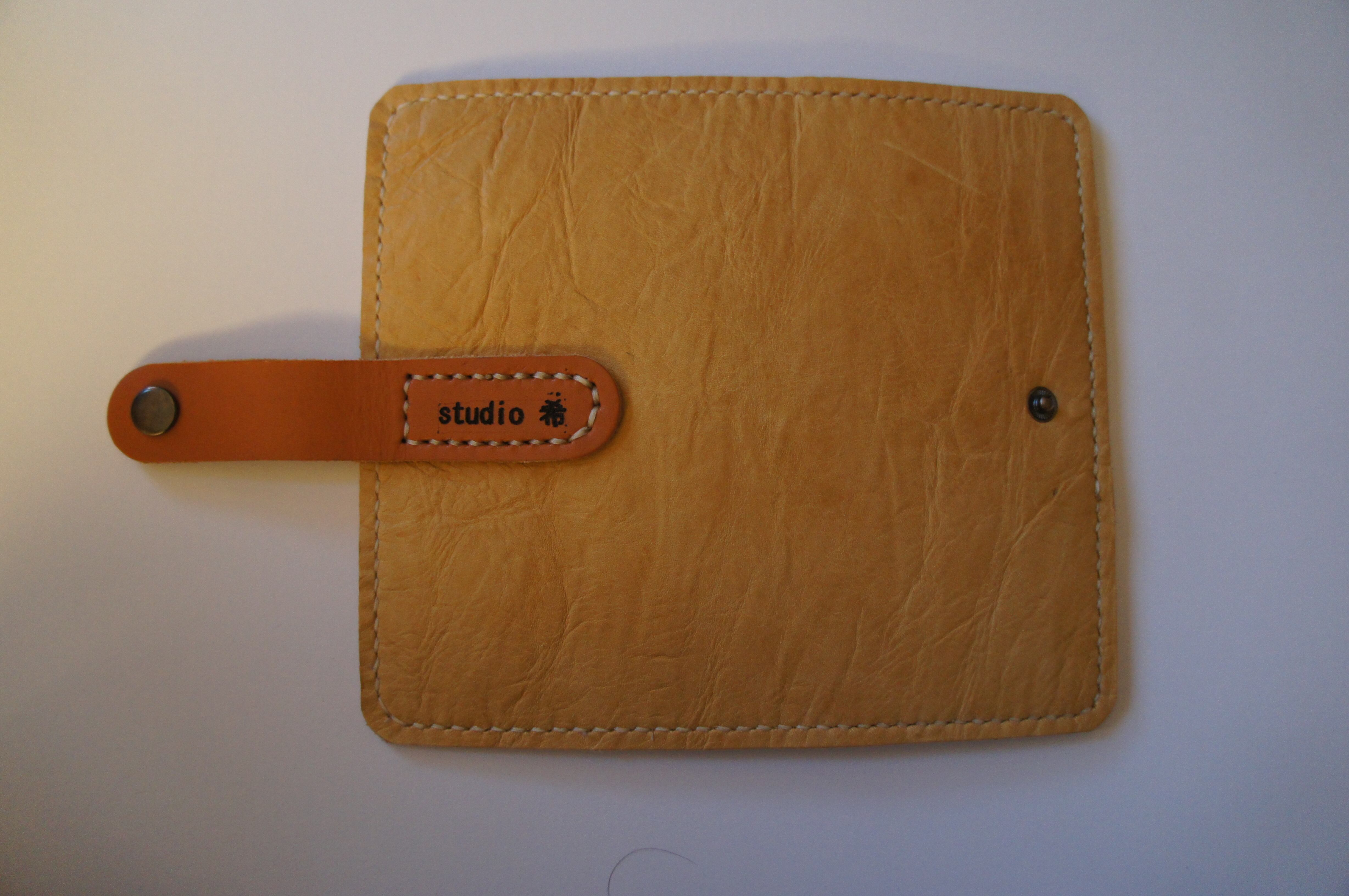 普通サイズの手帳型スマートフォンケースです。本体、本体裏、カードホルダー、ホルダー裏、バックルの合計5枚の革を縫い合わせています。太さ1番の白色の糸ですべて手縫いで仕上げています。2本の針で縫っていますので、ほつれにくい構造になっています。本体は肌色の牛革です。カードホルダーが2つあります。カードホルダー部分の裏には収納スペースがあります。貼り付け部分はつるつるになるまでトコフィニッシュなどを使って磨いています。